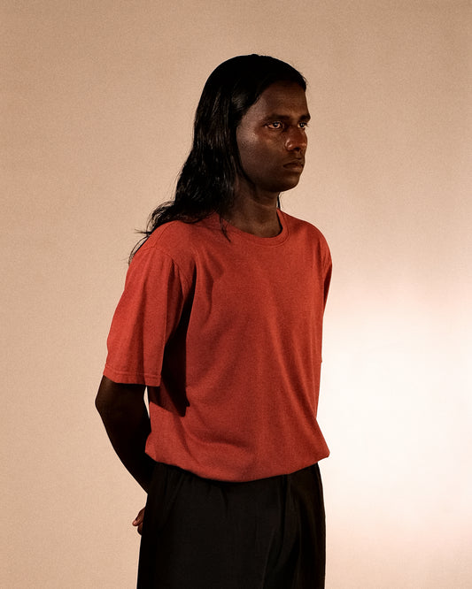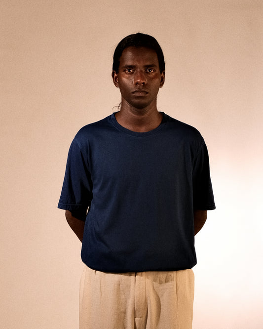 100% organic cotton, 180 GSM. Stitched with 100% cotton threads. Hand-dyed, hand-printed, and hand-painted at our studio. Designed in a regular comfort fit—clean, minimal, and easy to wear, with a silhouette built for everyday.