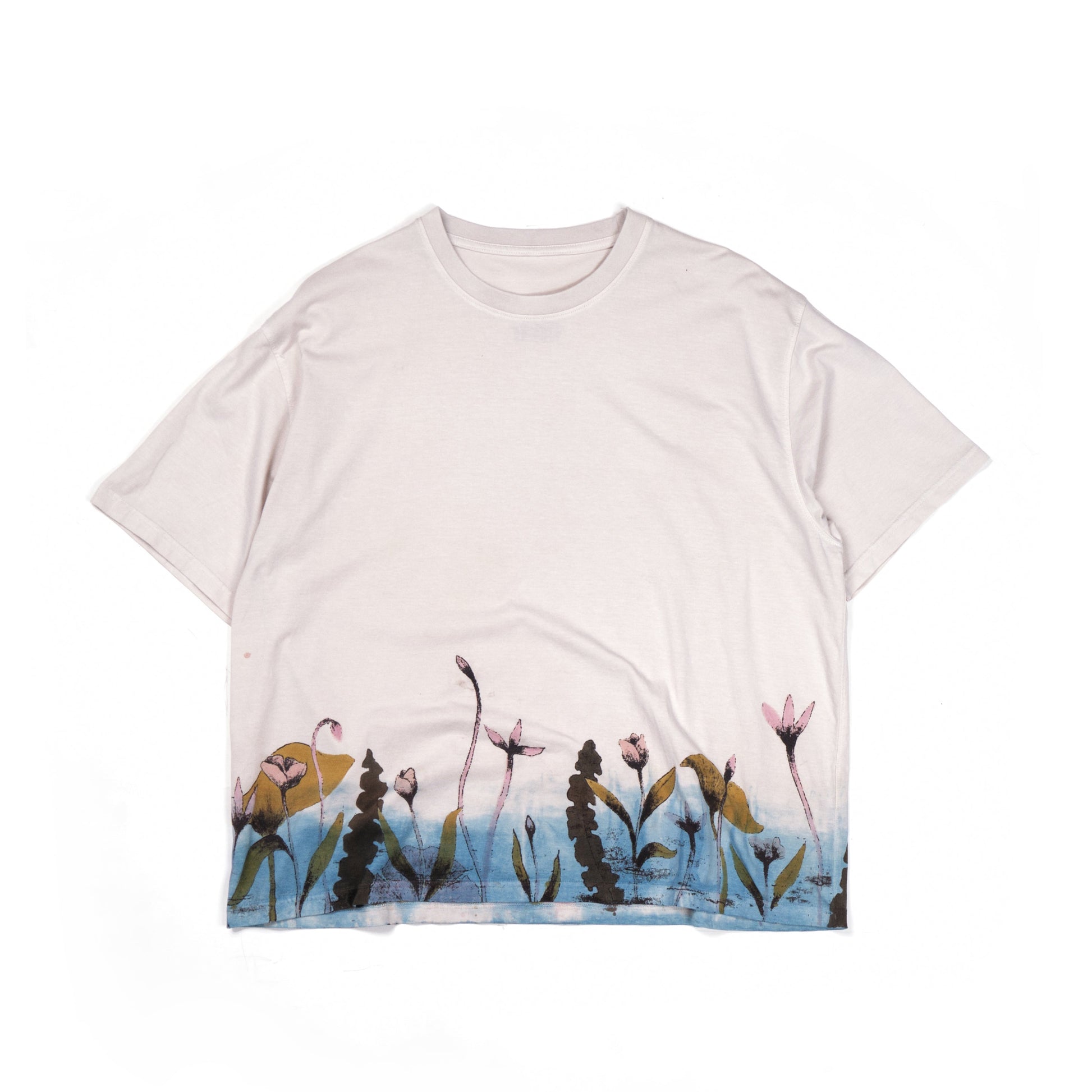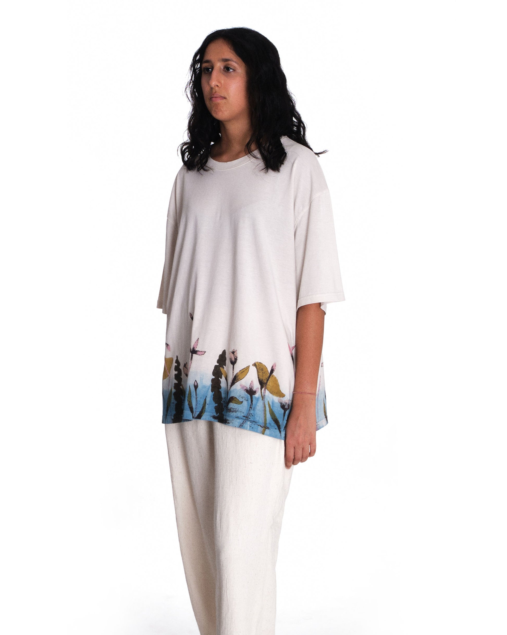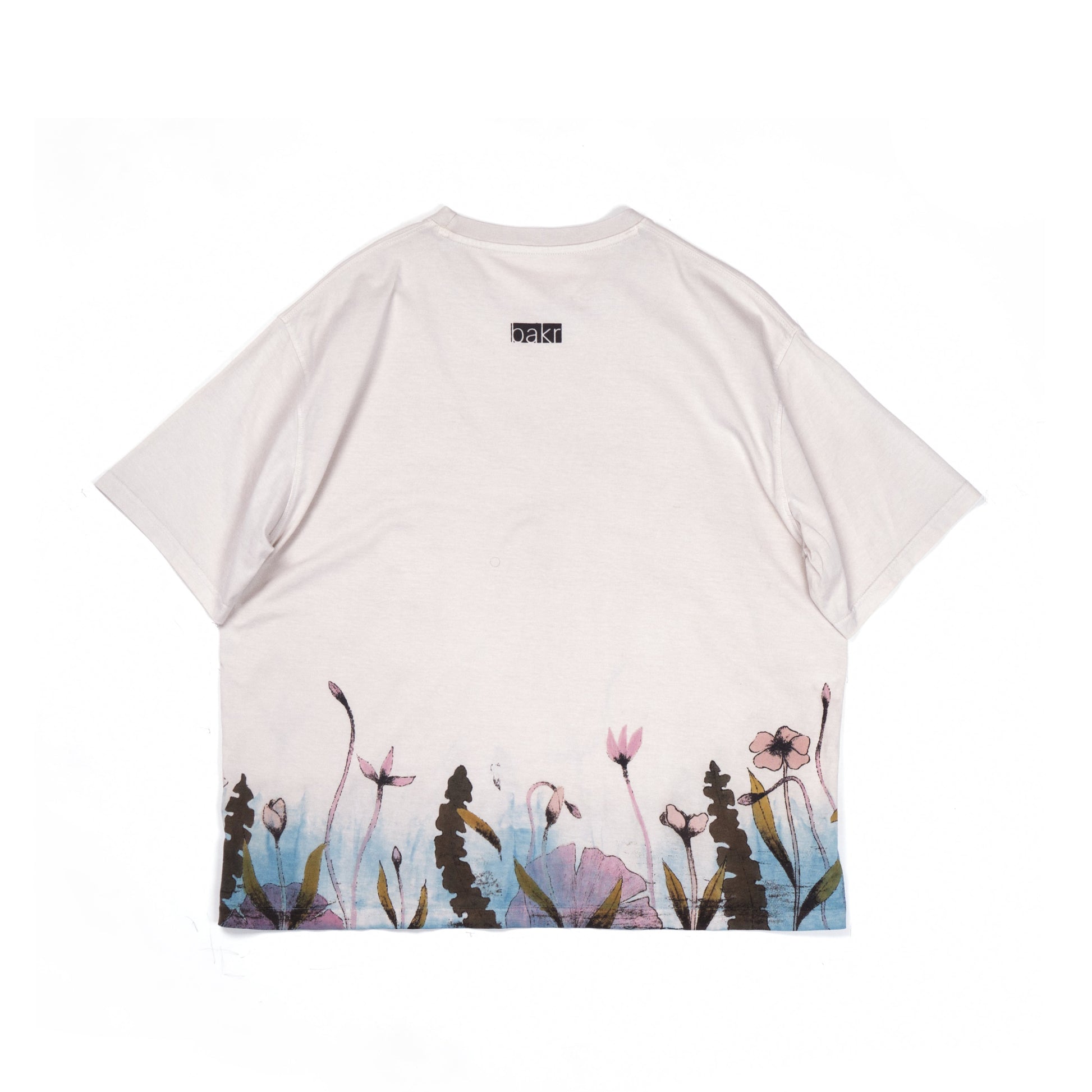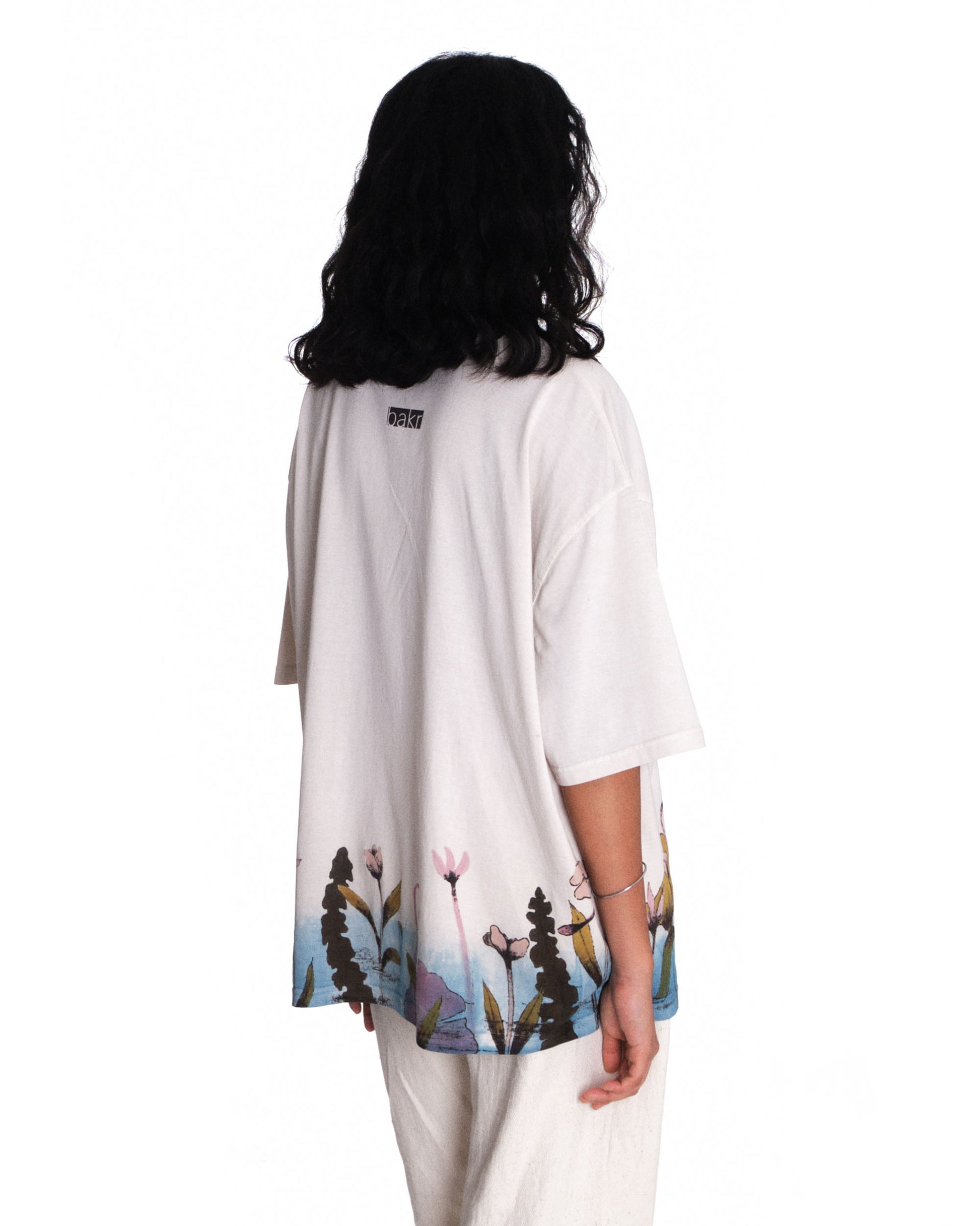 Introducing Bakr’s “Blossom” oversized unisex t-shirt in “Natural Ecru.” Hand-printed in rust black, derived through the fermentation of iron rust and molasses, it is then hand-painted using 100% natural dyes extracted from nature. Finally, it’s over-dyed in our organic honey indigo vat, resulting in a uniquely crafted garment.