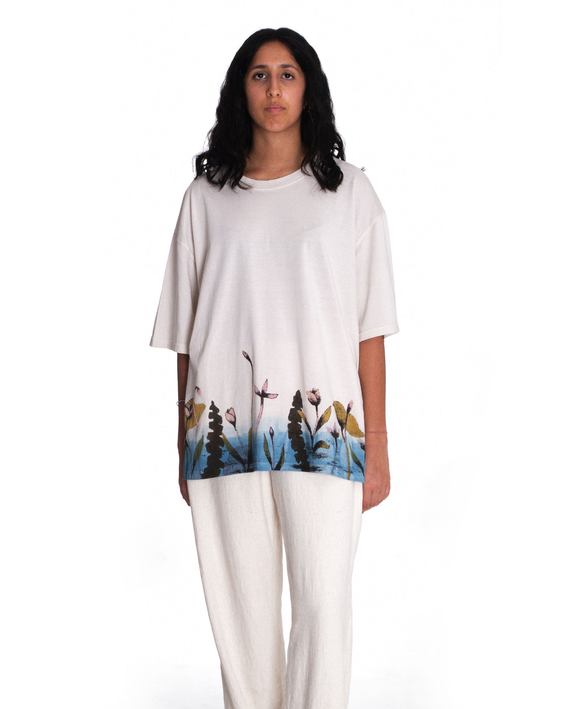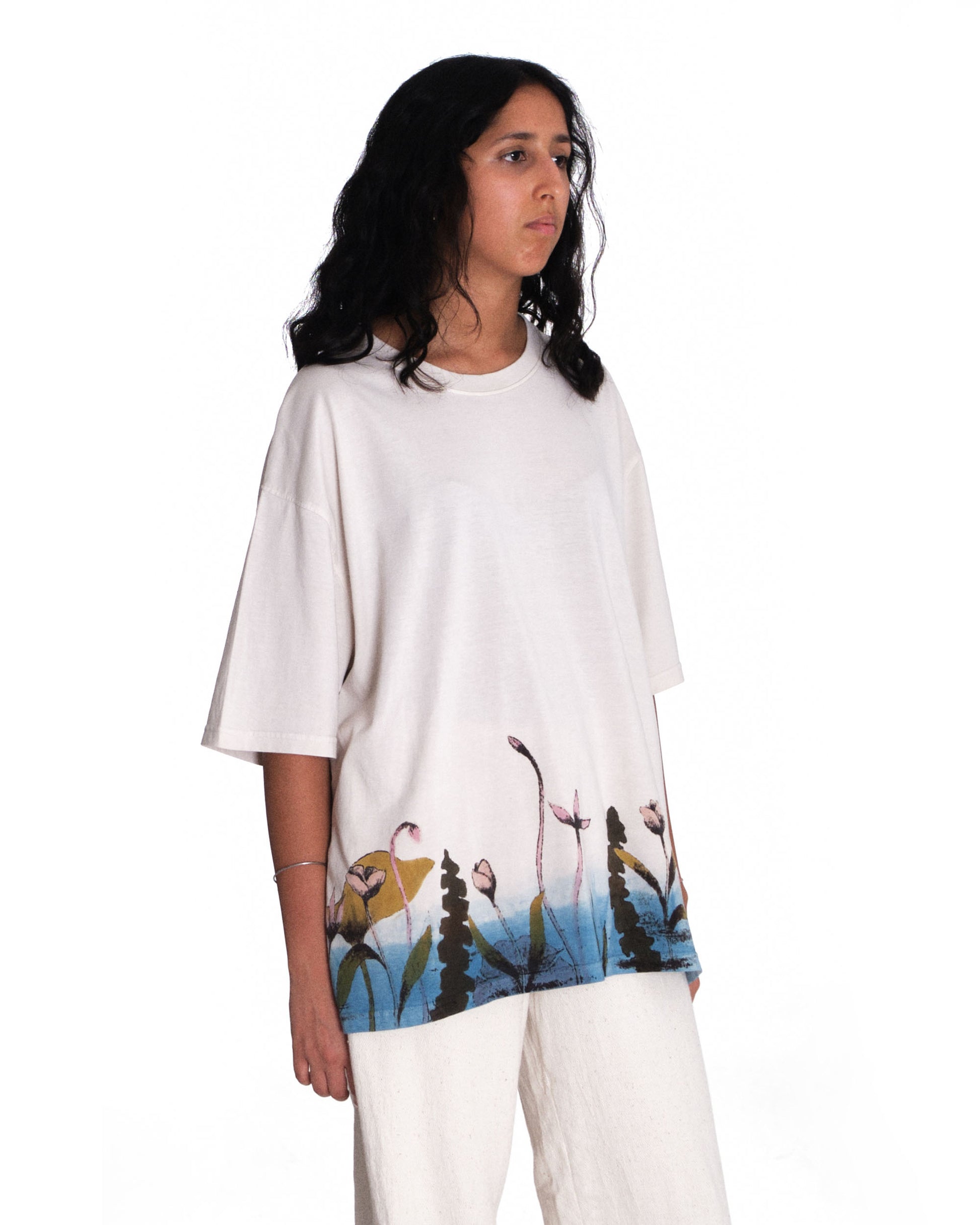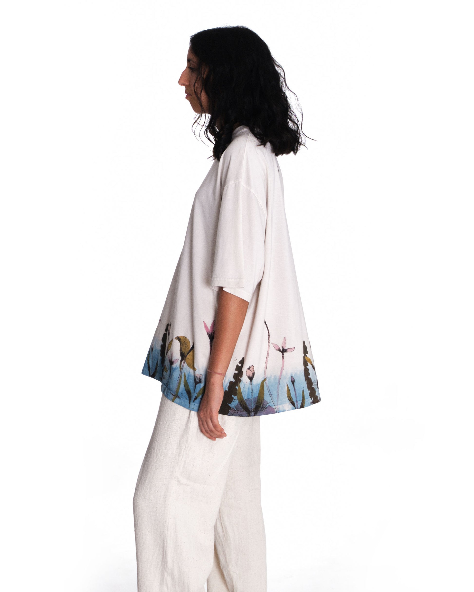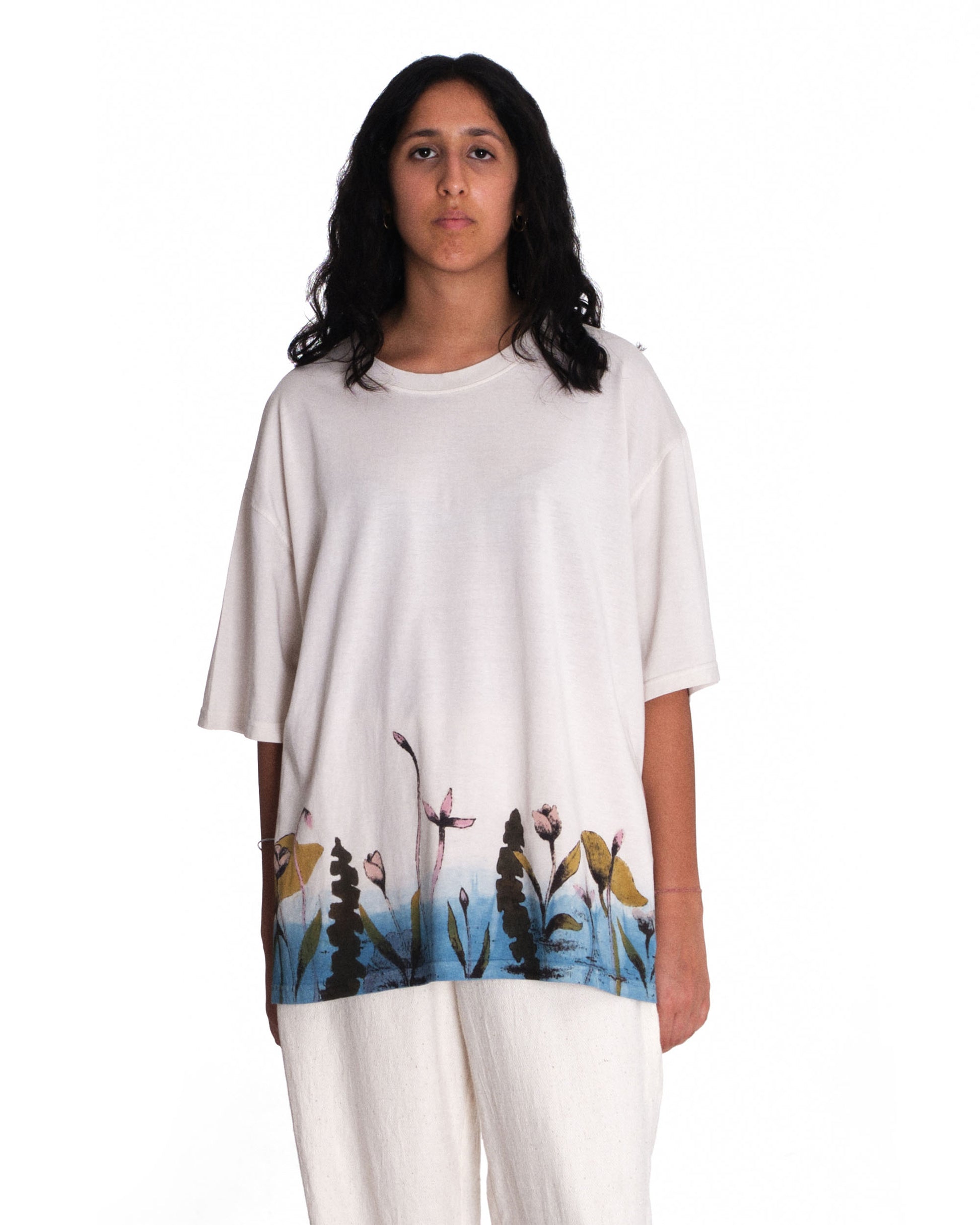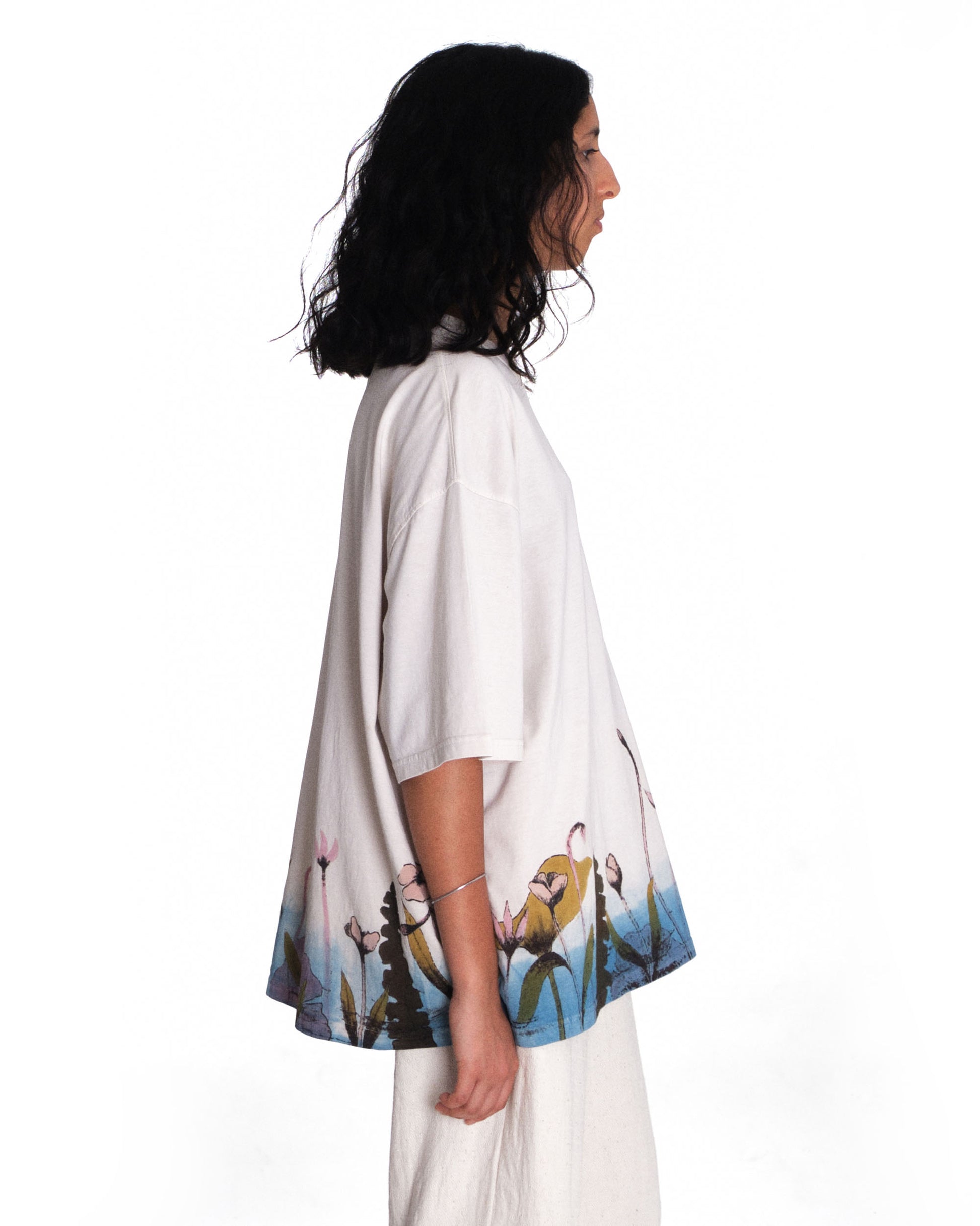 Introducing Bakr’s “Blossom” oversized unisex t-shirt in “Natural Ecru.” Hand-printed in rust black, derived through the fermentation of iron rust and molasses, it is then hand-painted using 100% natural dyes extracted from nature. Finally, it’s over-dyed in our organic honey indigo vat, resulting in a uniquely crafted garment.