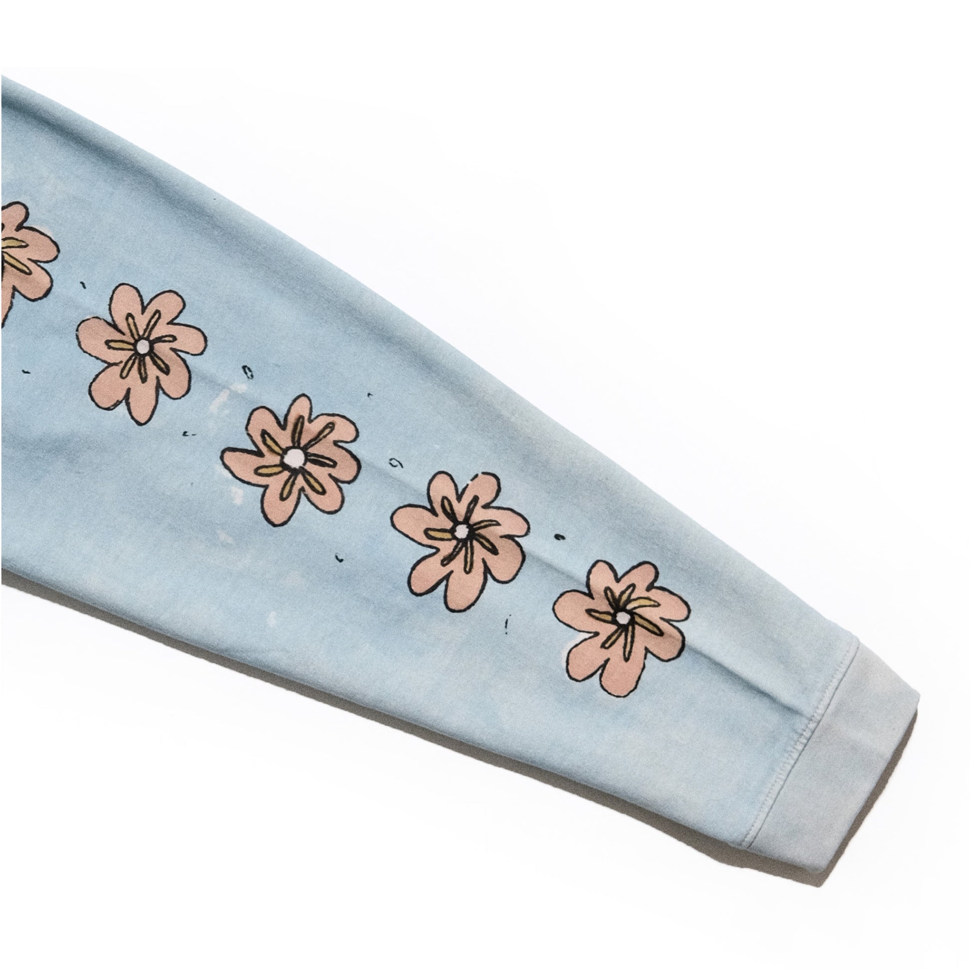 Bakr’s unisex crewneck, “boulevard,” in ecru is hand printed in rust black, and hand painted in Madder extract prepared at the bakr studio, and over dyed in our 100% organic honey indigo vat.