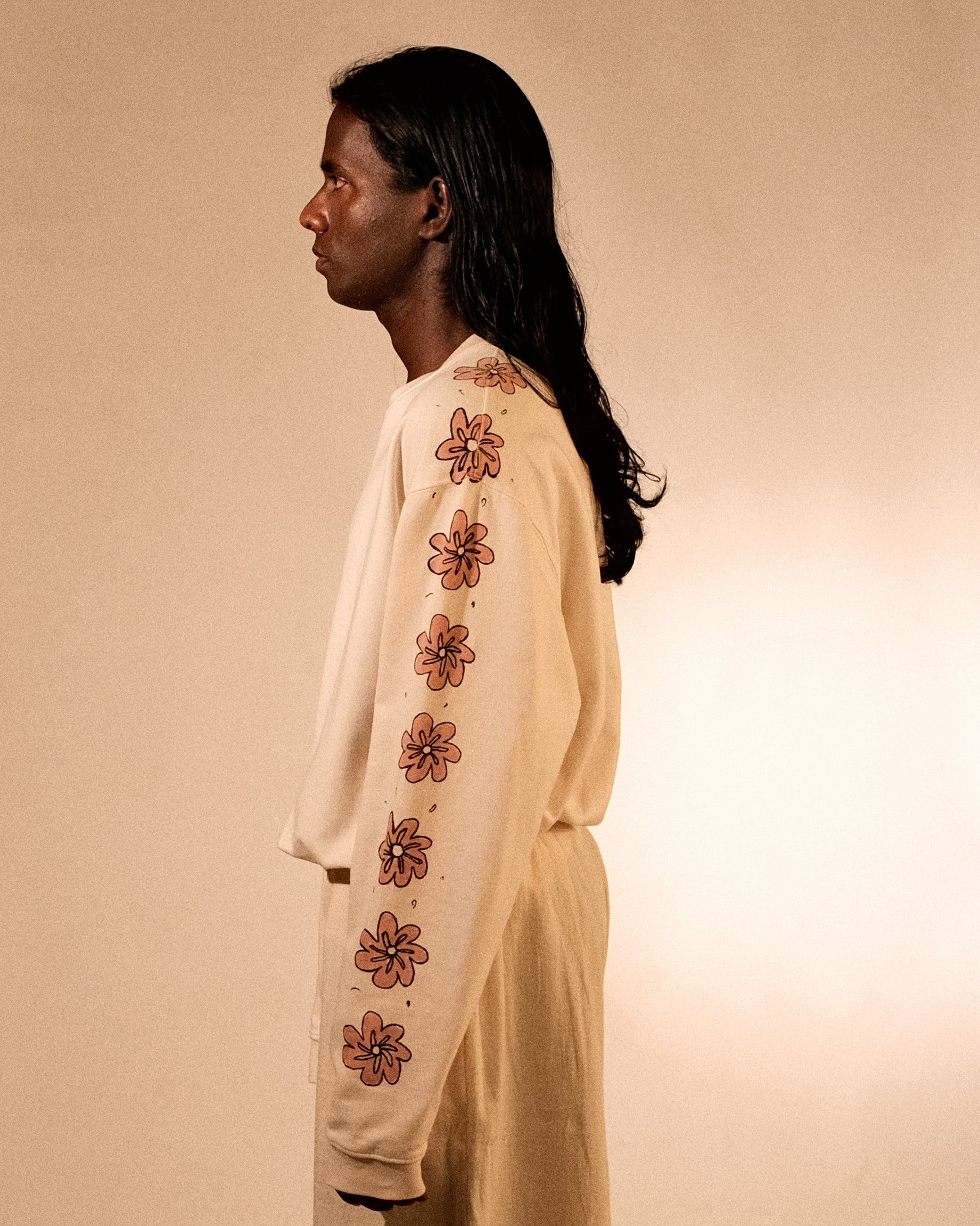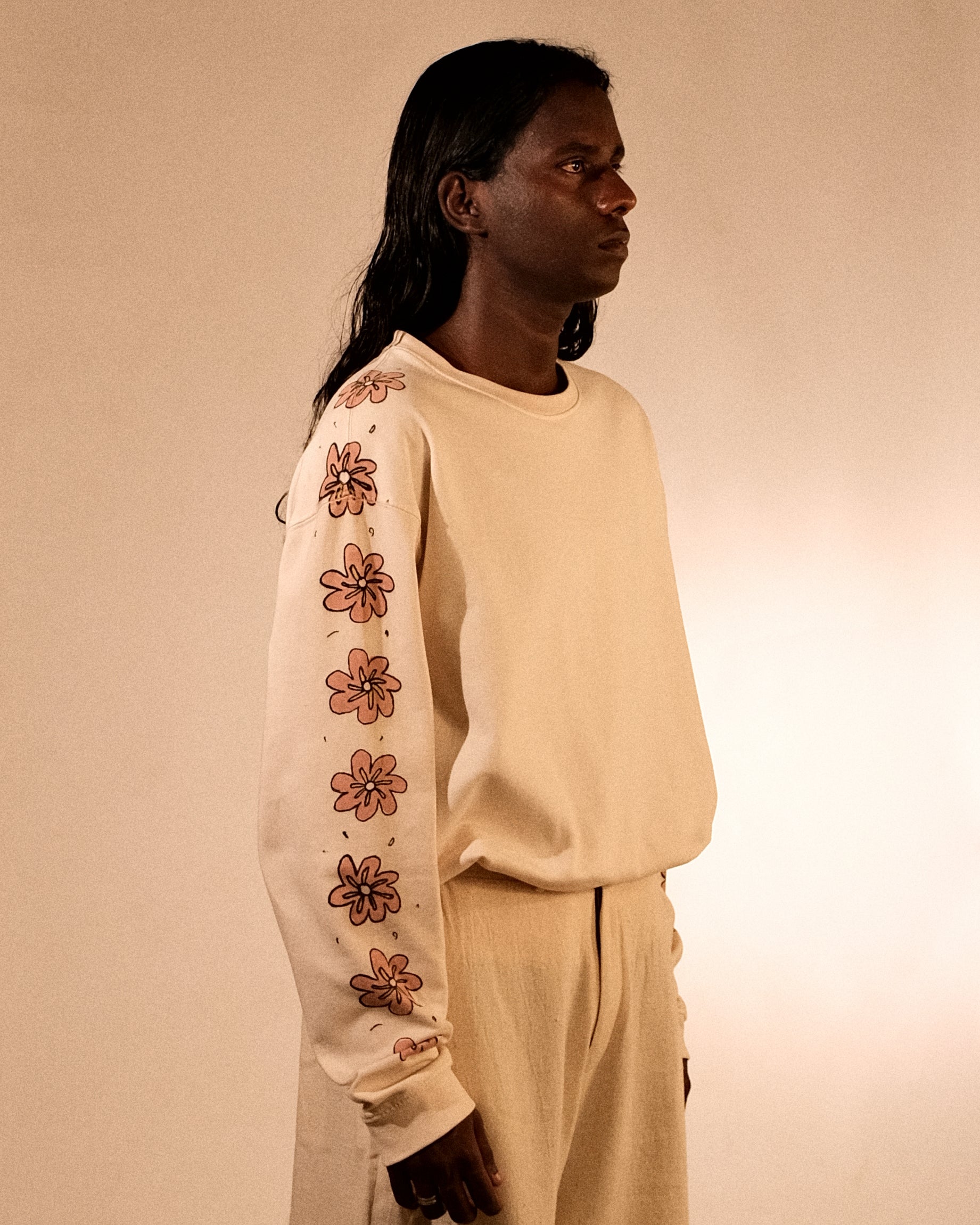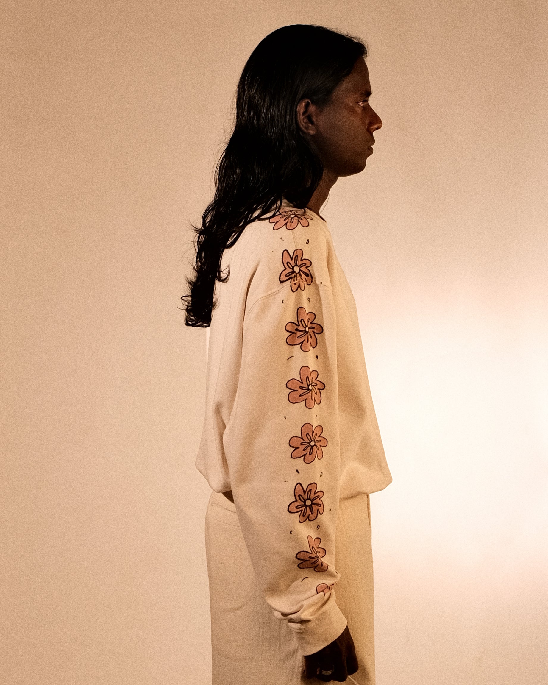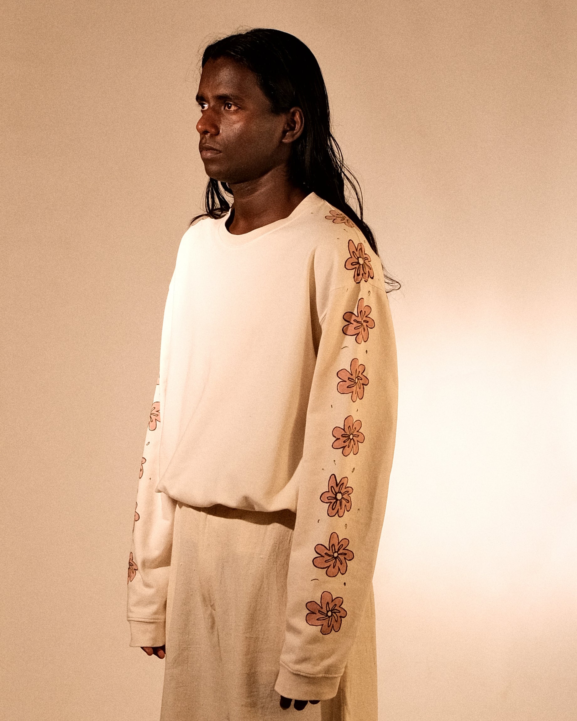 Bakr’s unisex crewneck, “boulevard,” in ecru is hand printed in rust black, and hand painted in Madder extract prepared at the bakr studio, and takes approximately 2 days to make.