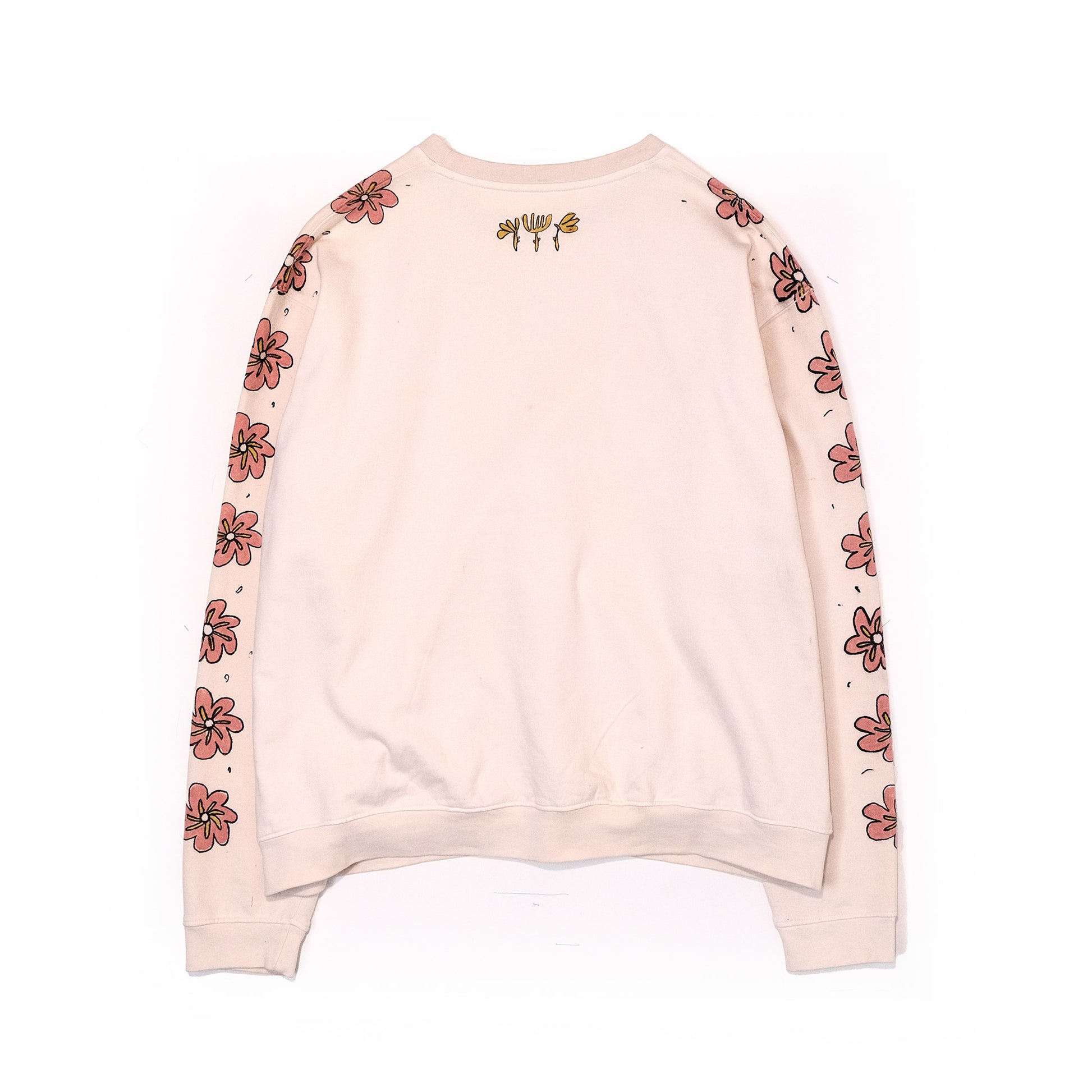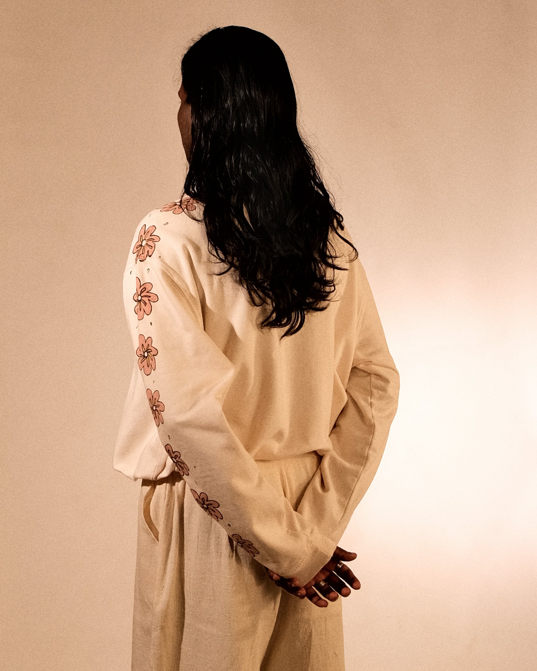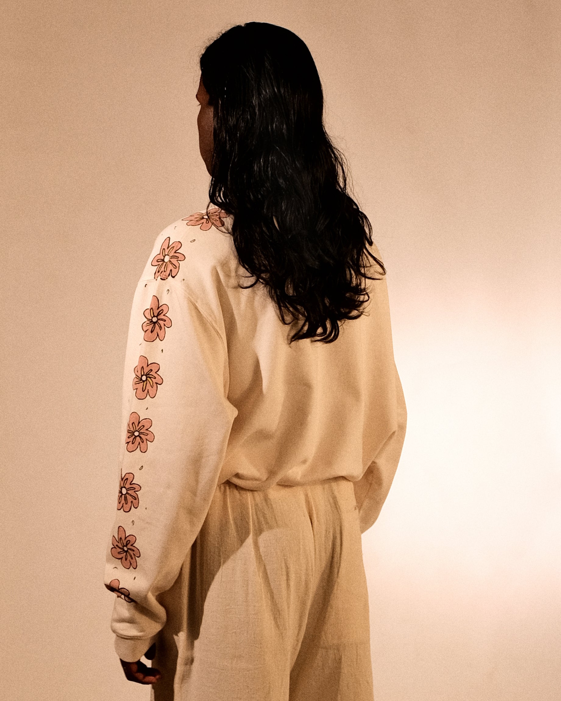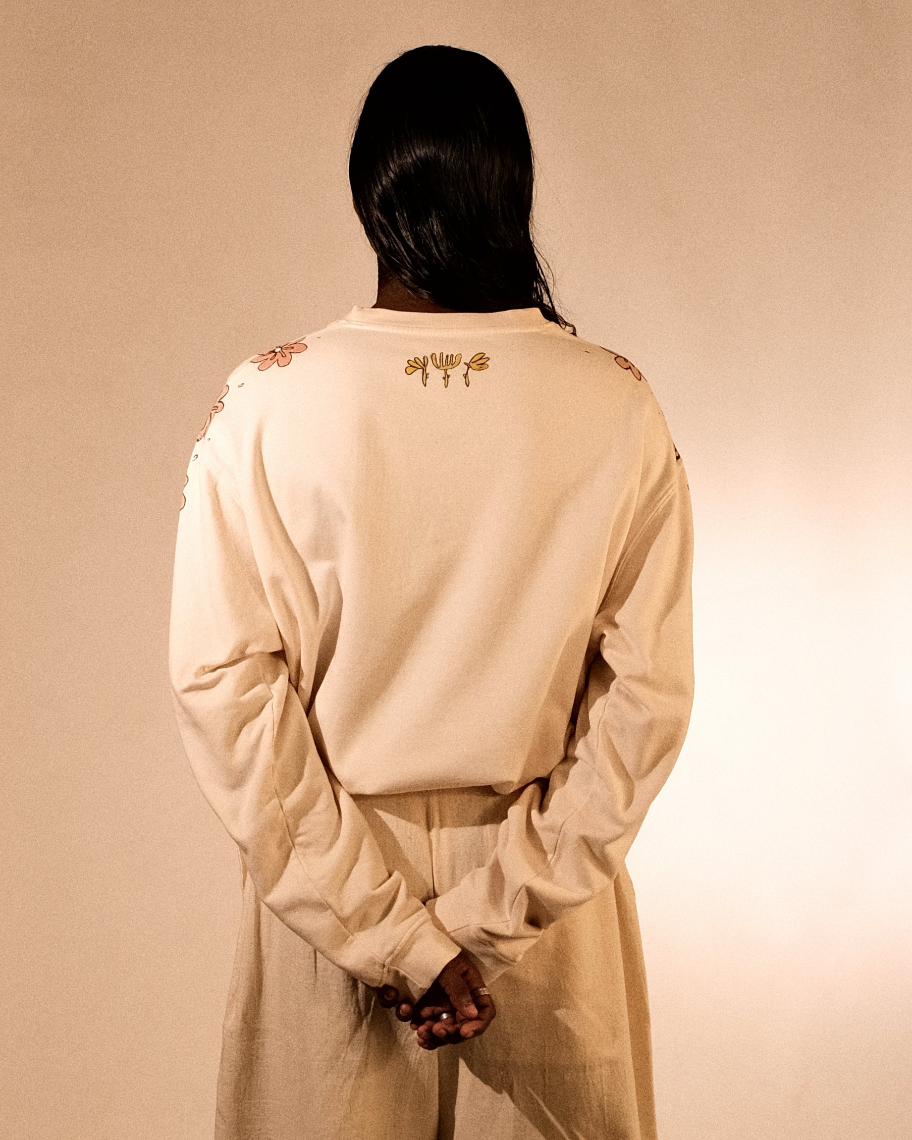 Bakr’s unisex crewneck, “boulevard,” in ecru is hand printed in rust black, and hand painted in Madder extract prepared at the bakr studio, and takes approximately 2 days to make.