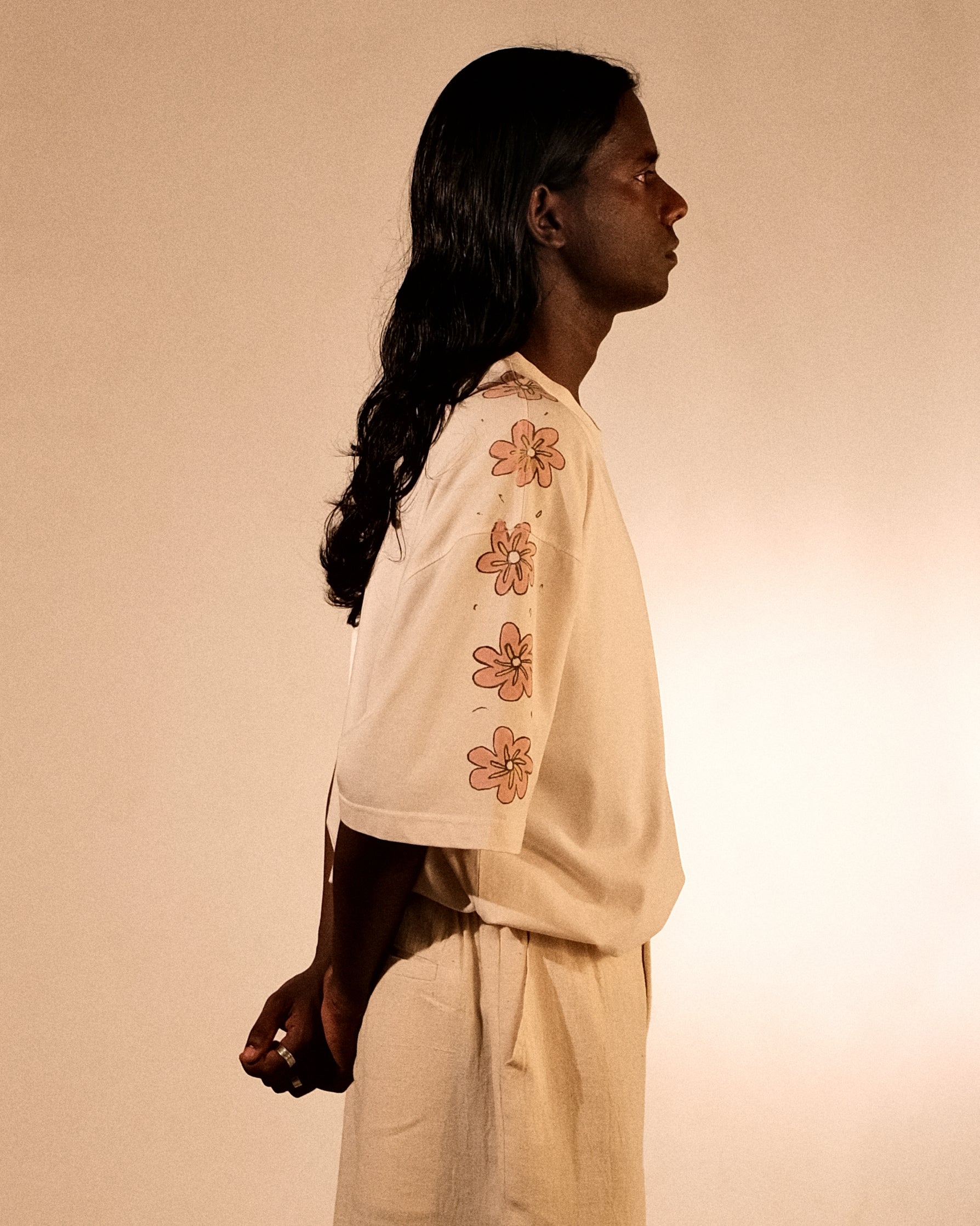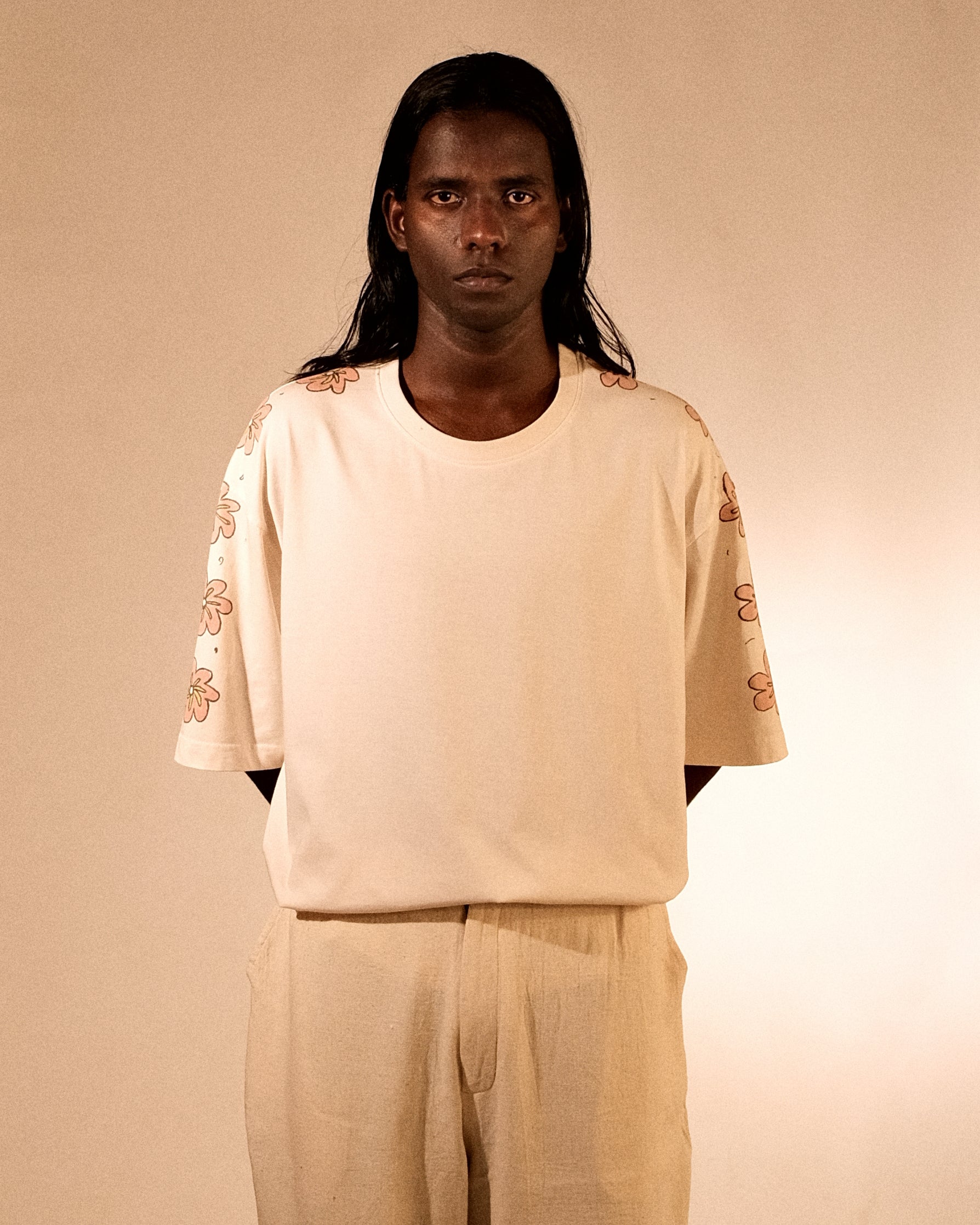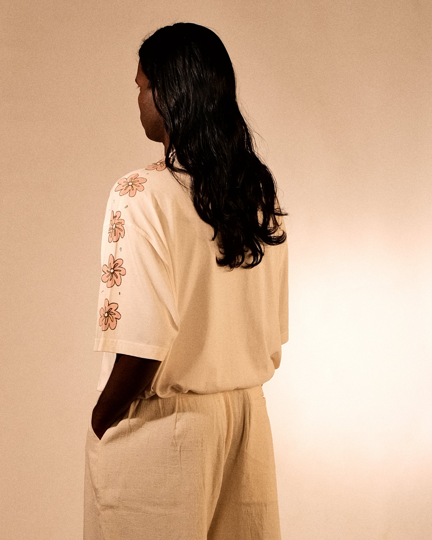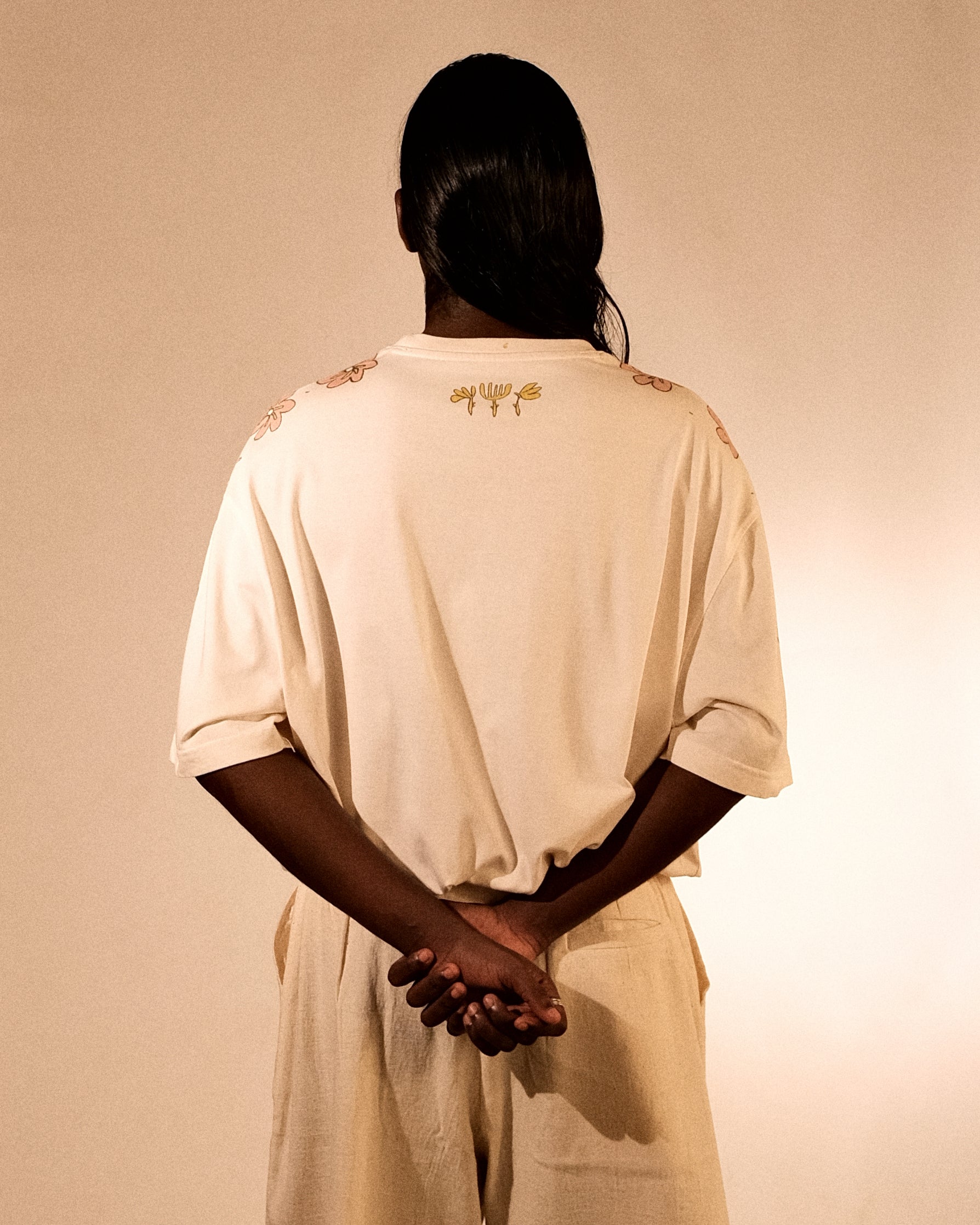Bakr’s unisex OS t-shirt, “boulevard,” in ecru is hand printed in rust black, and hand painted in Madder extract prepared at the bakr studio, and takes approximately 2 days to make.