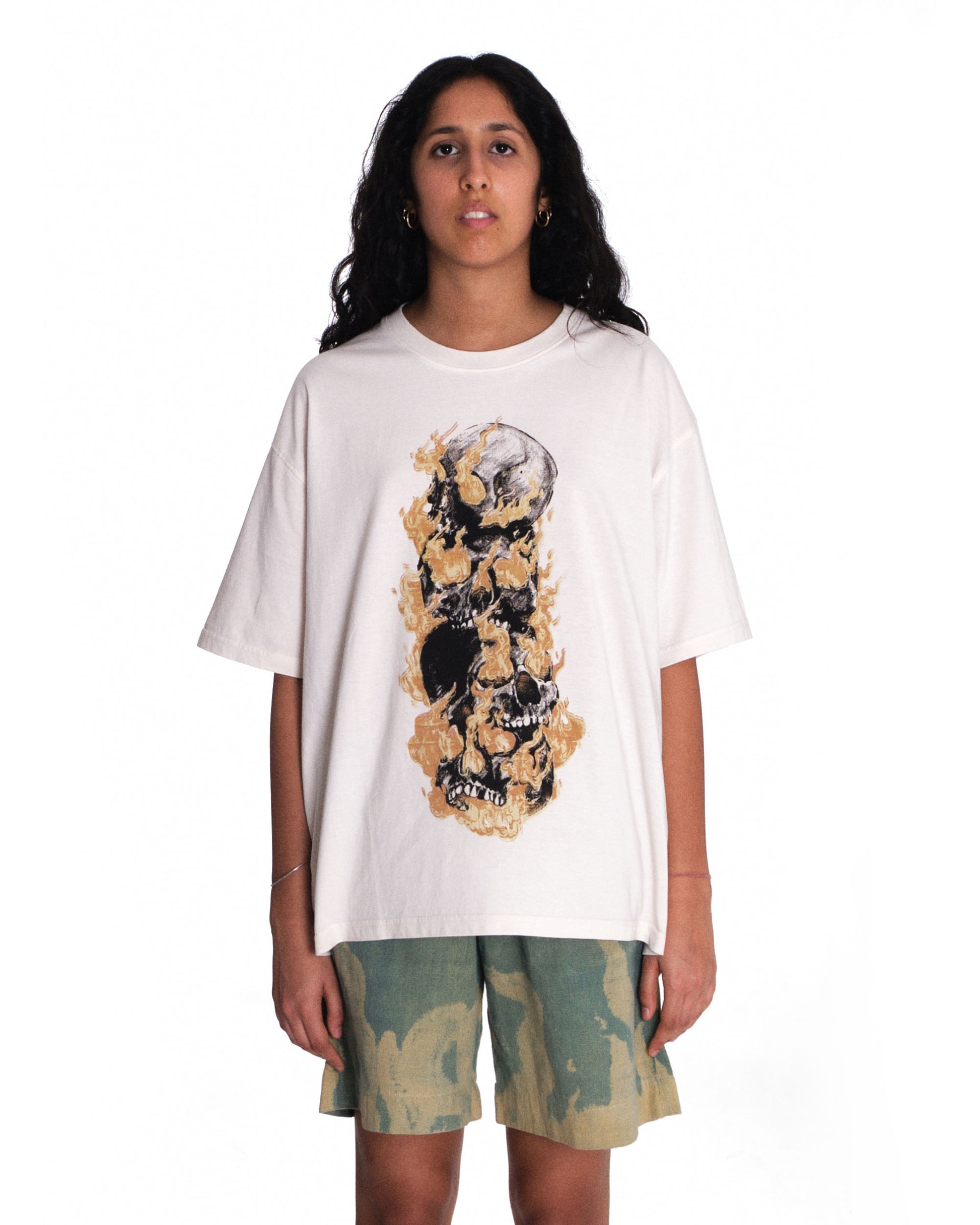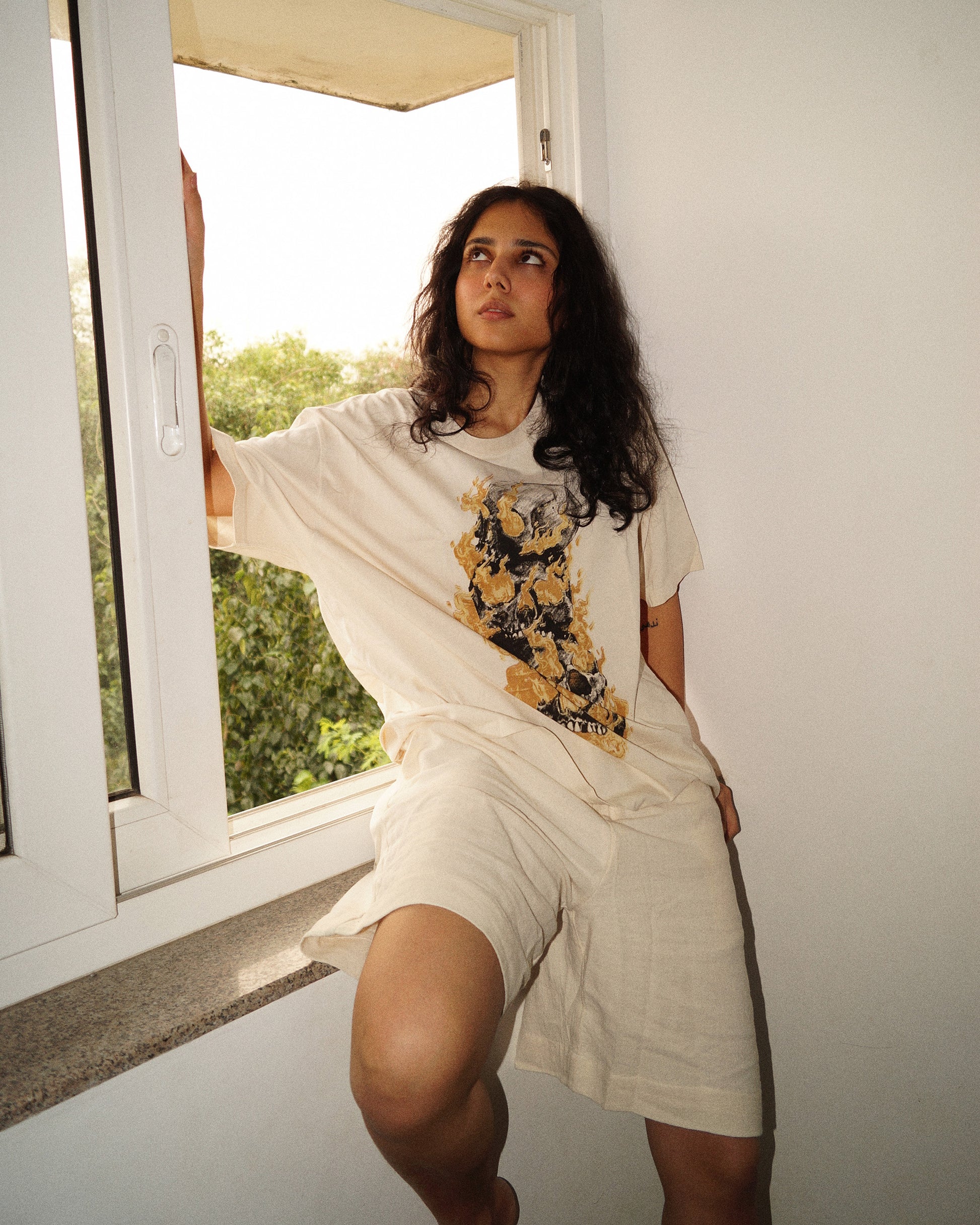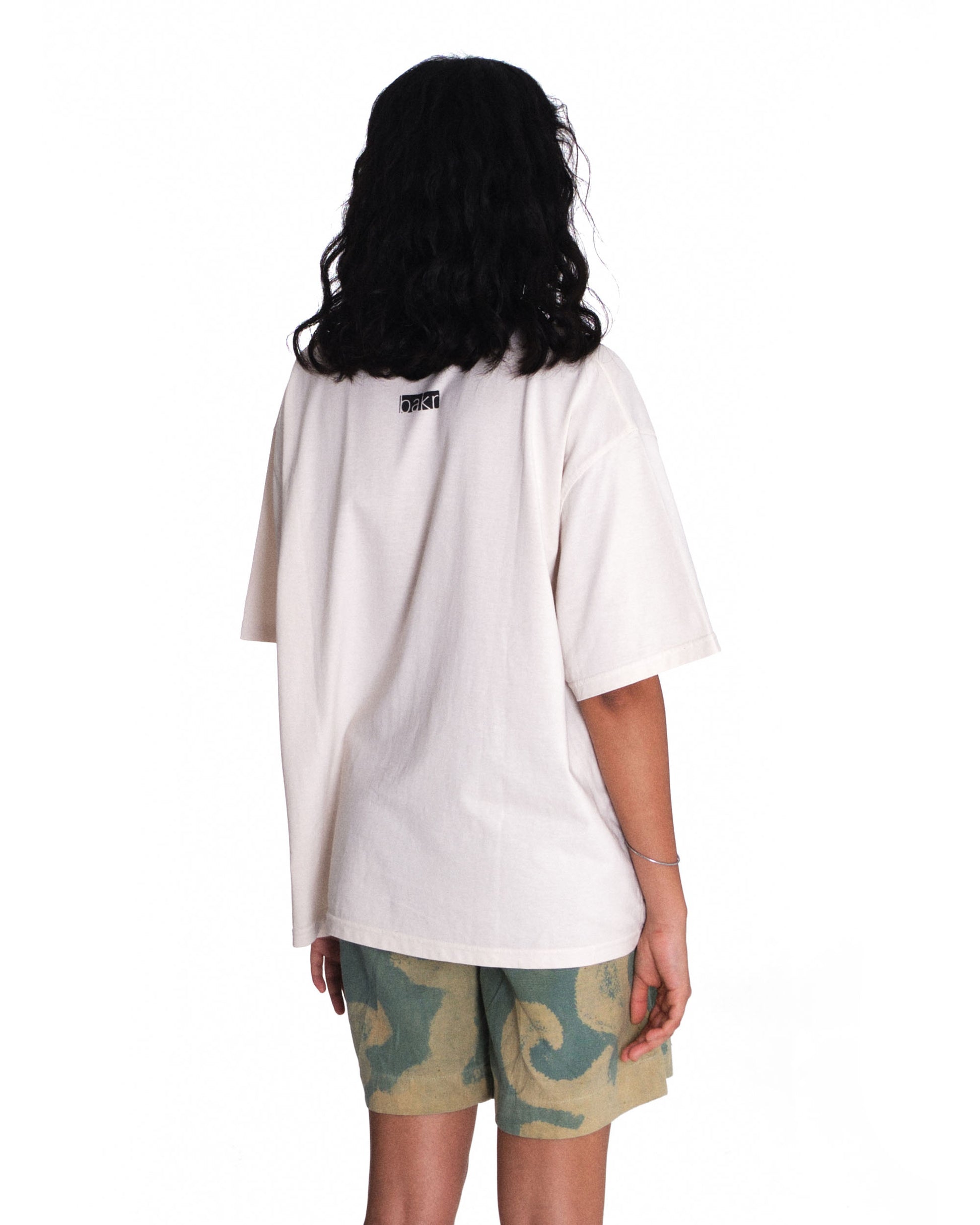 Bakr’s oversized unisex t-shirt, “Fire Skull,” in the shade “Natural Ecru,” is hand-printed in rust black, extracted through the fermentation of iron rust and molasses, alongside ochre yellow from Myrobalan flowers, and natural lac.