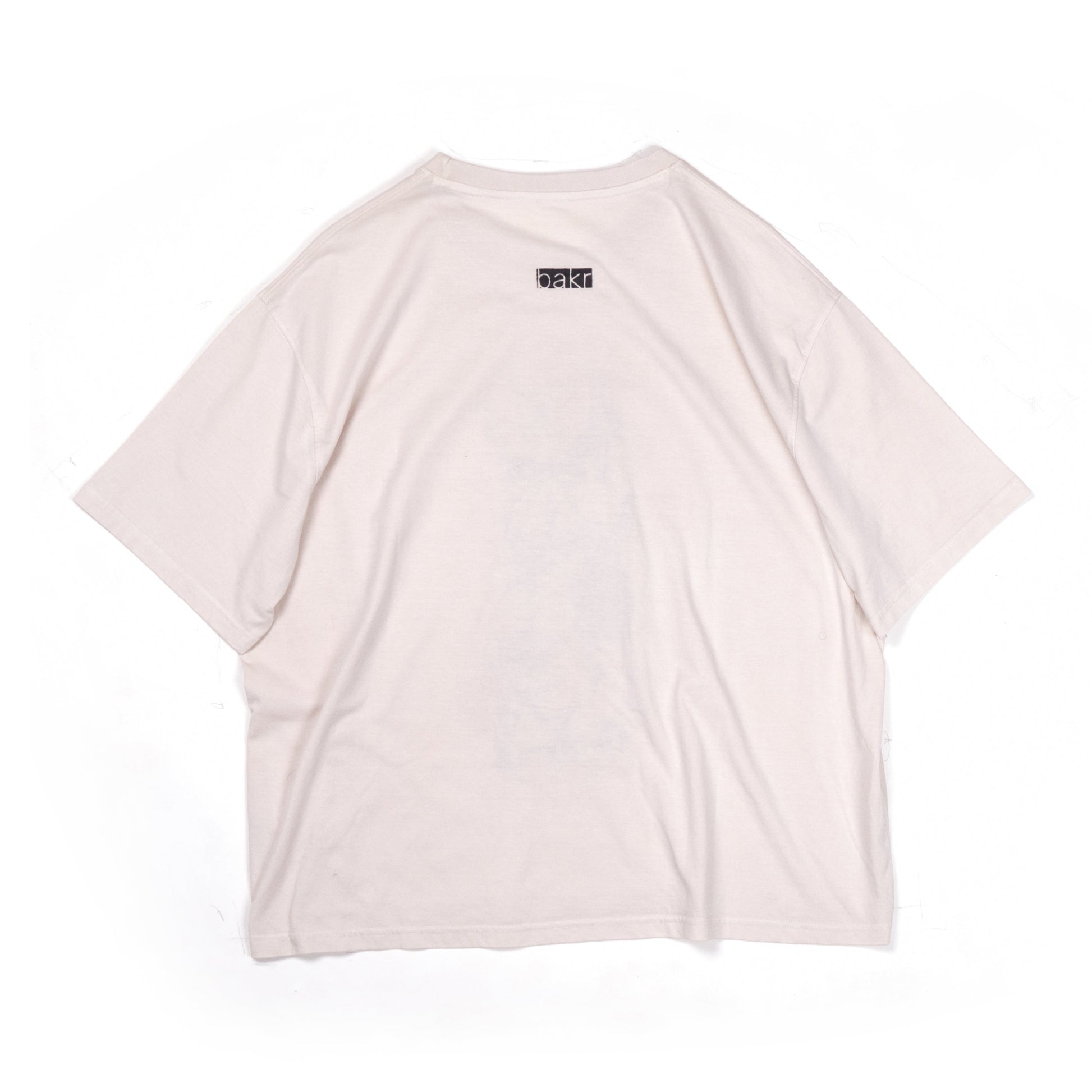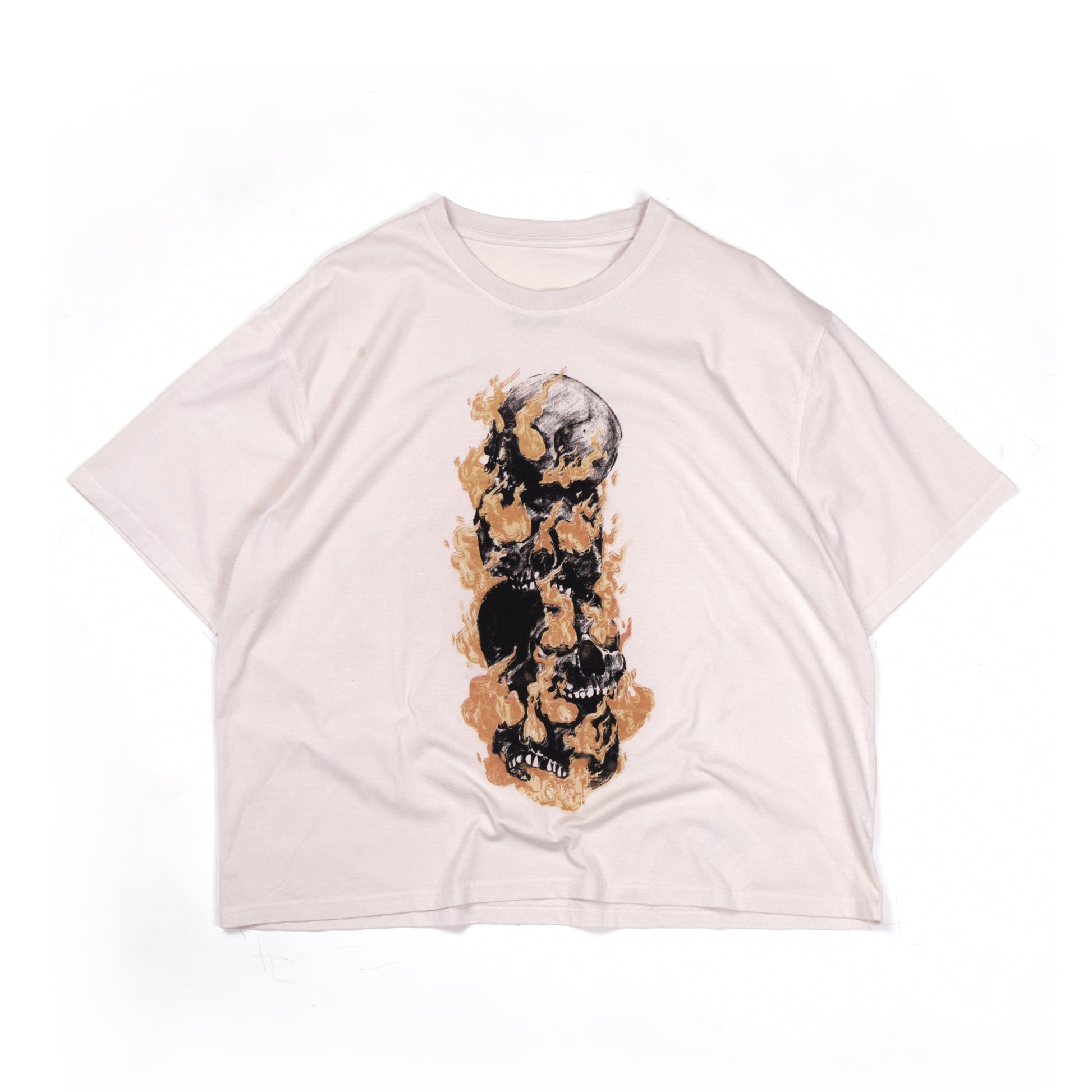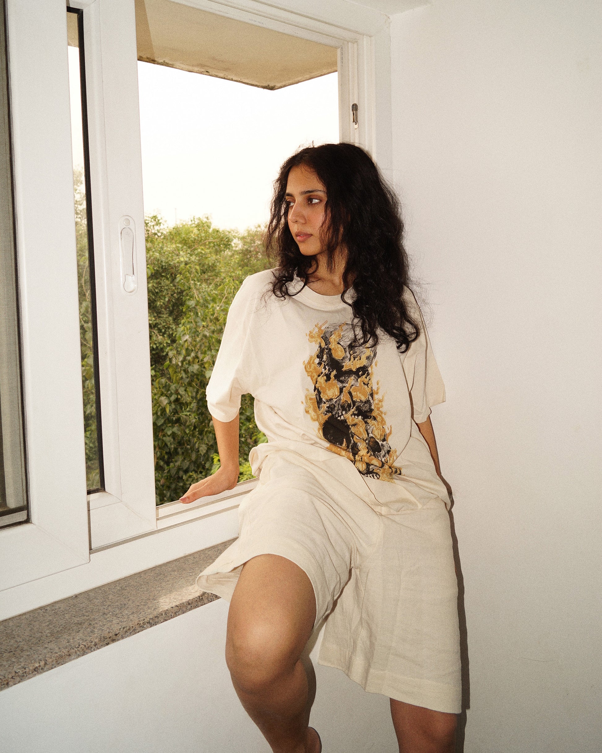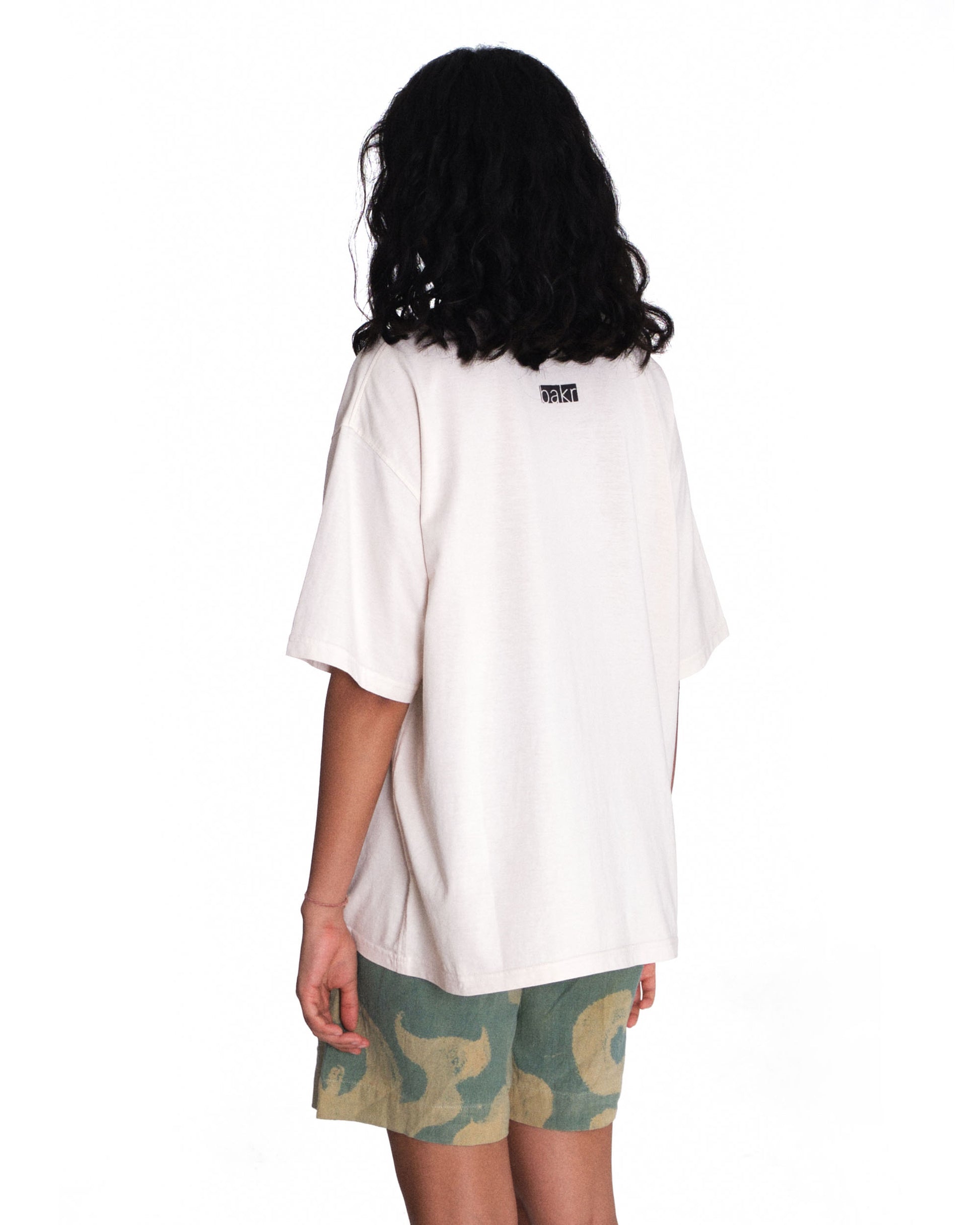 Bakr’s oversized unisex t-shirt, “Fire Skull,” in the shade “Natural Ecru,” is hand-printed in rust black, extracted through the fermentation of iron rust and molasses, alongside ochre yellow from Myrobalan flowers, and natural lac.