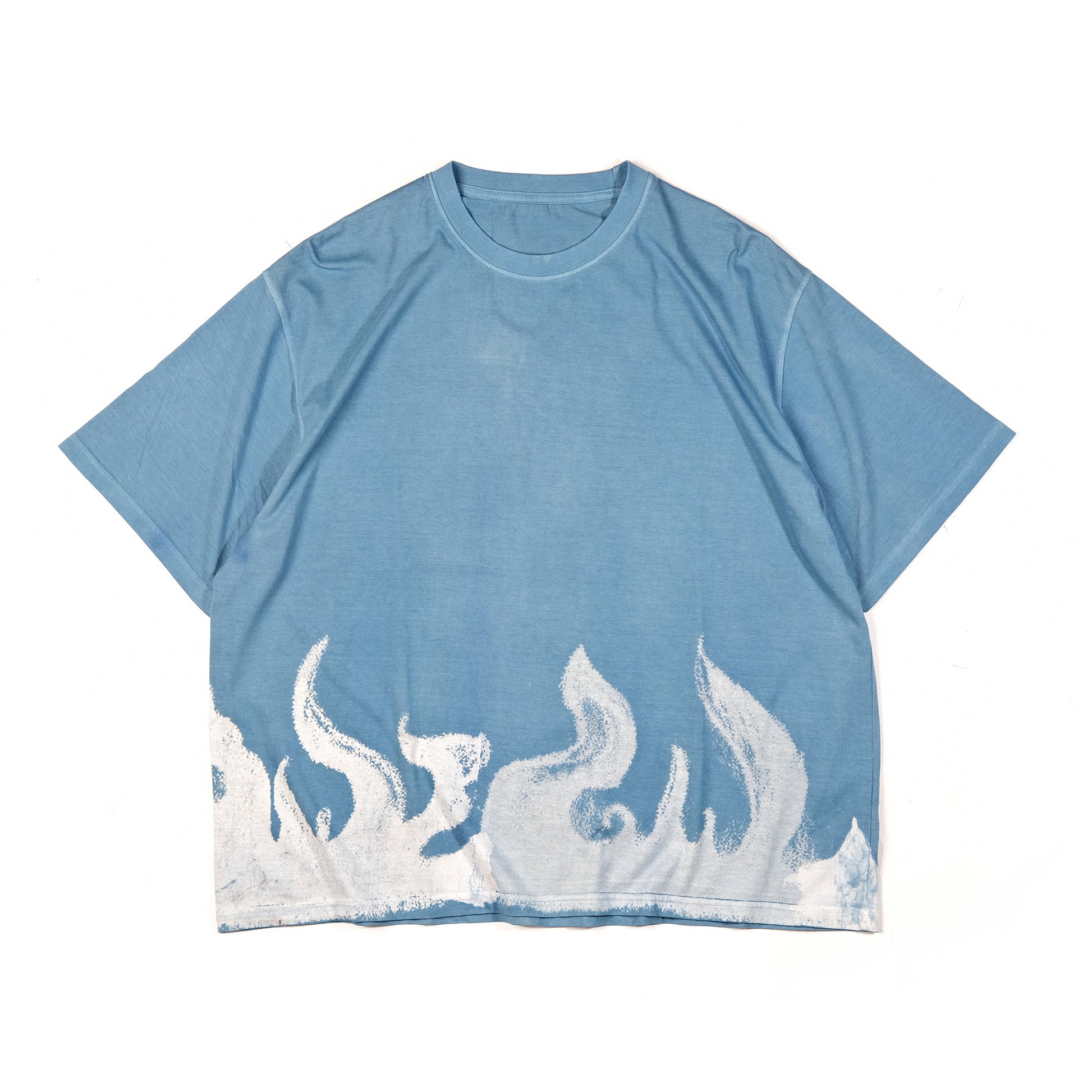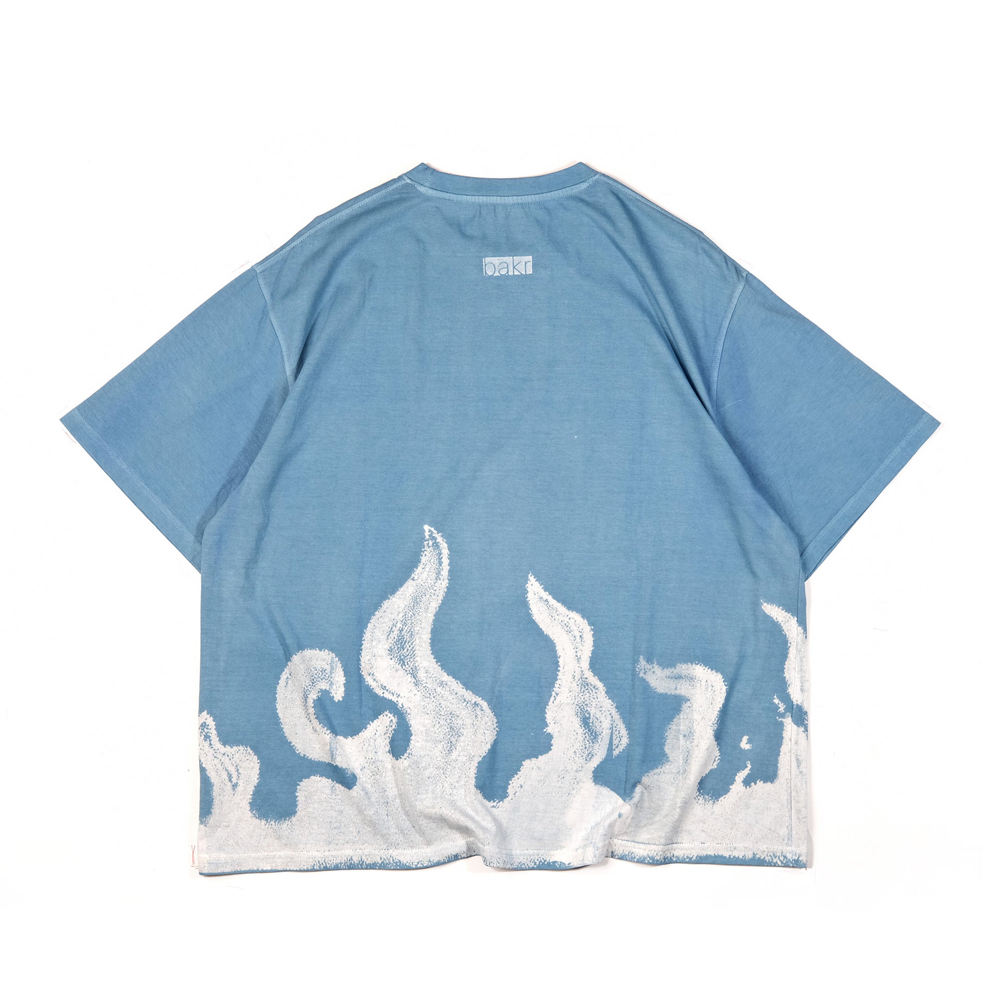 Bakr’s oversized t-shirt, “Flame,” in the shade “Ice Indigo,” is a true testament to traditional craftsmanship. It is resist-printed by hand using the Japanese rice paste resist technique and hand-dyed in our studio with our organic honey indigo vat.