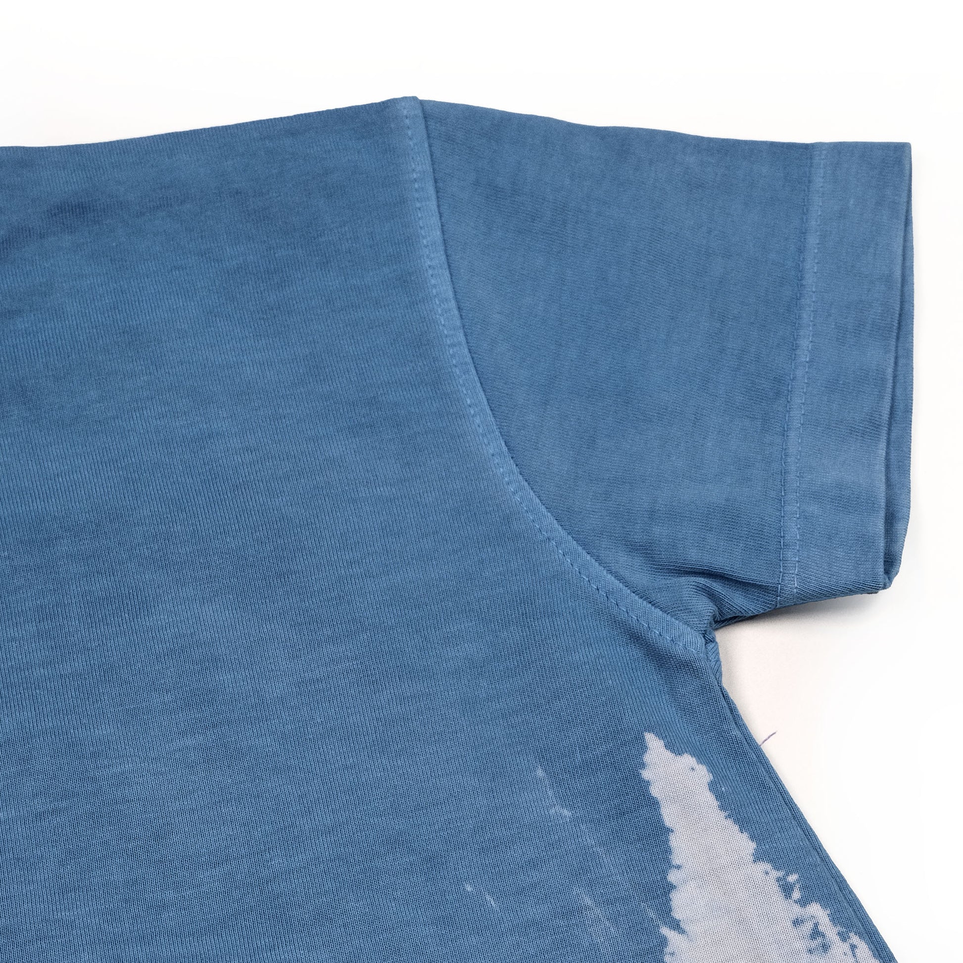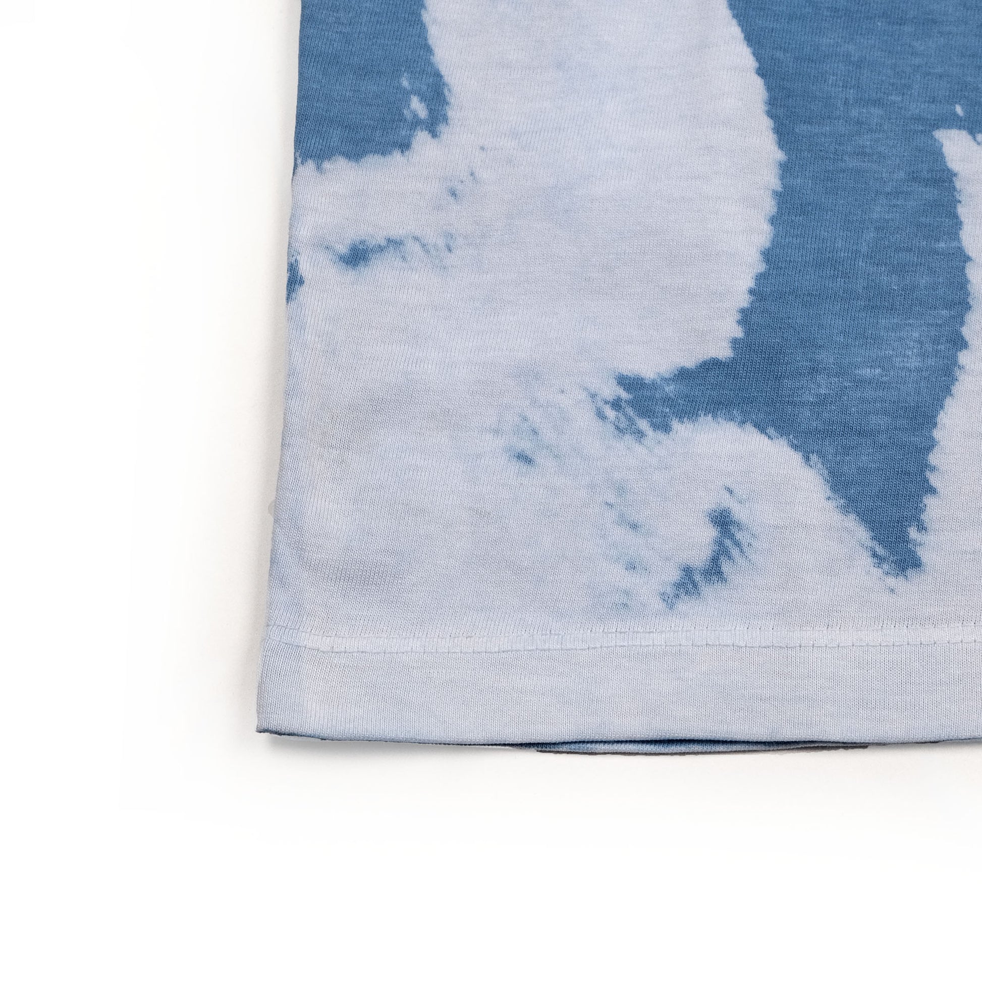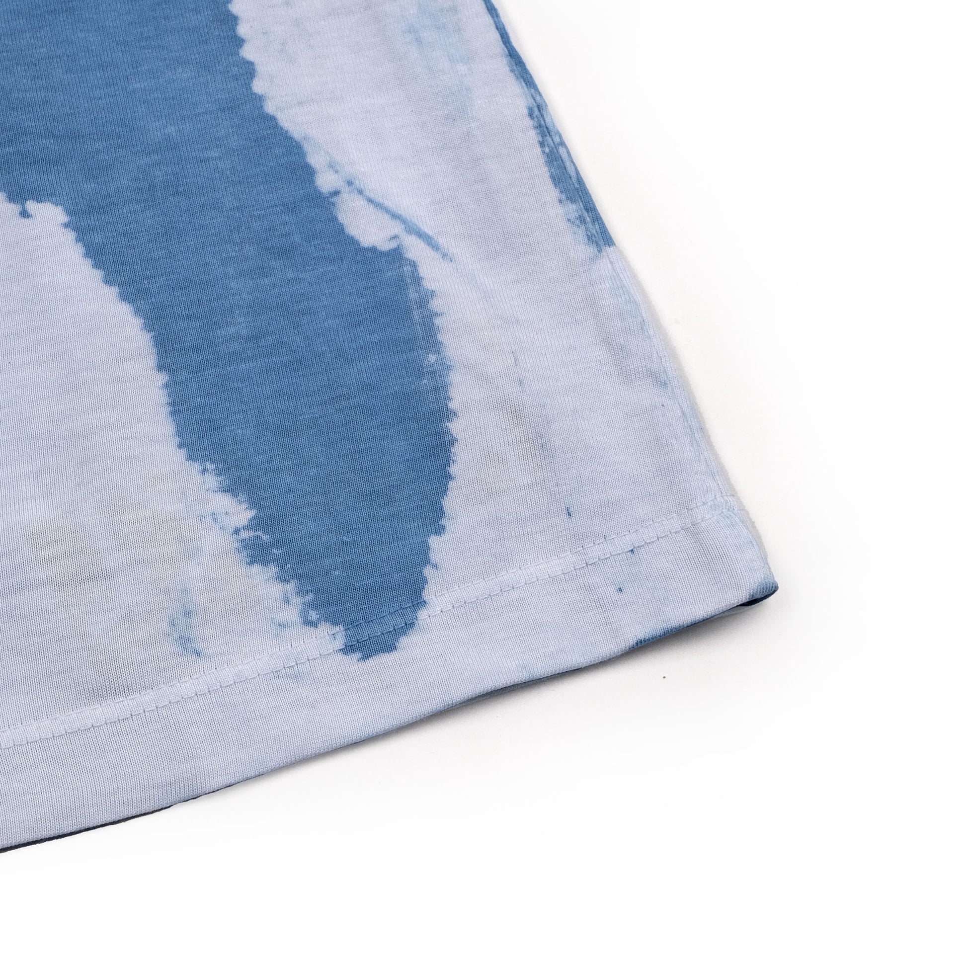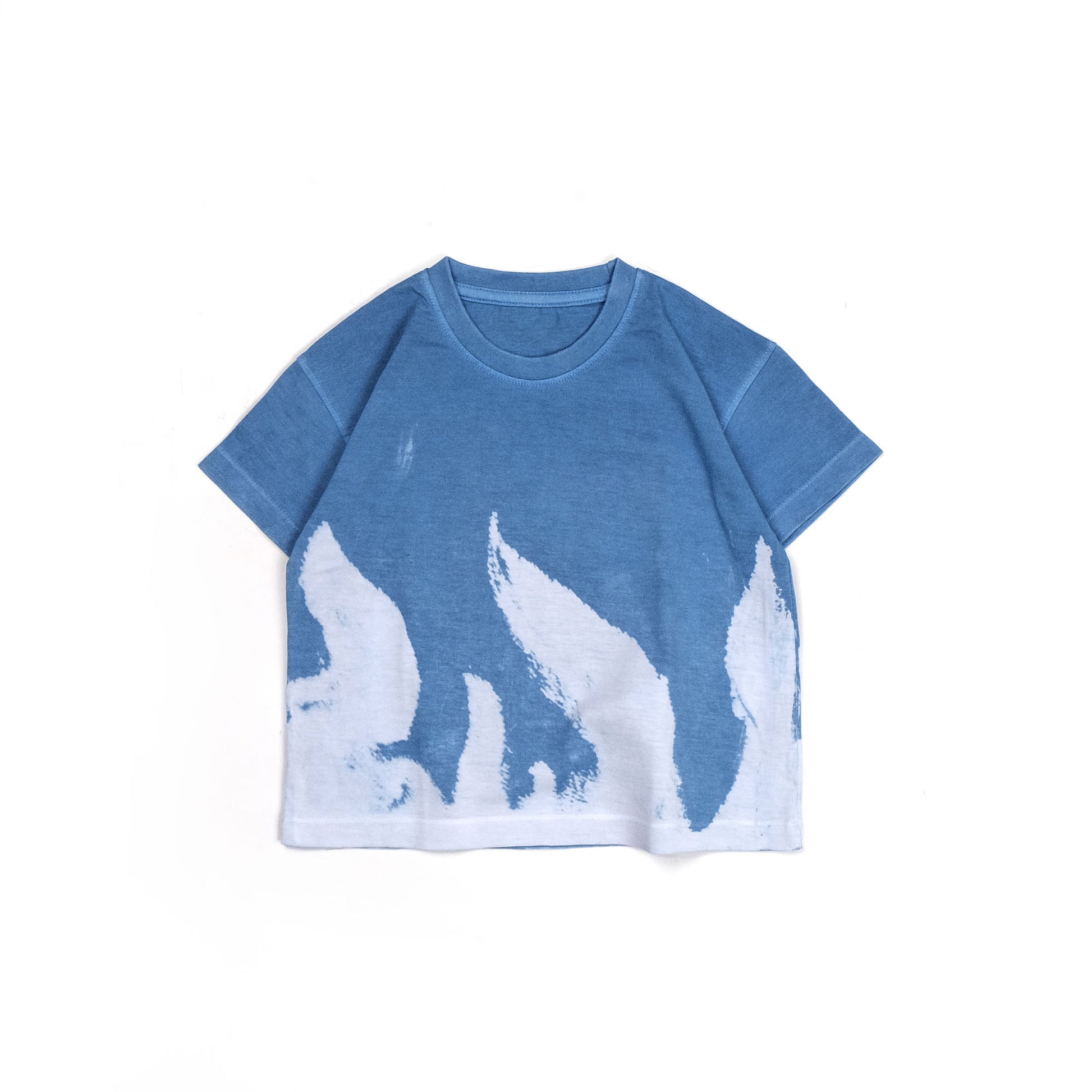 Baby Bakr’s oversized t-shirt, “Flame,” in the shade “Ice Indigo,” is a true testament to traditional craftsmanship. It is resist-printed by hand using the Japanese rice paste technique and hand-dyed in our studio with our organic honey indigo vat.