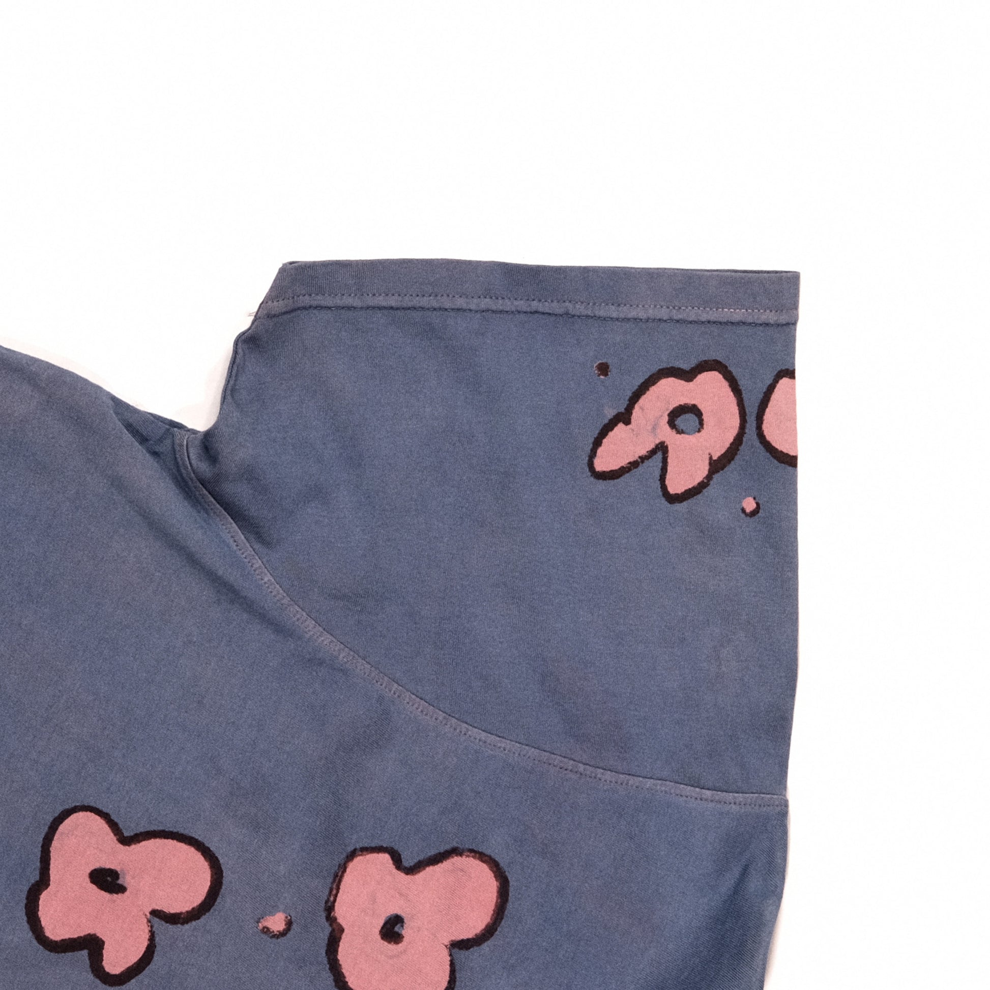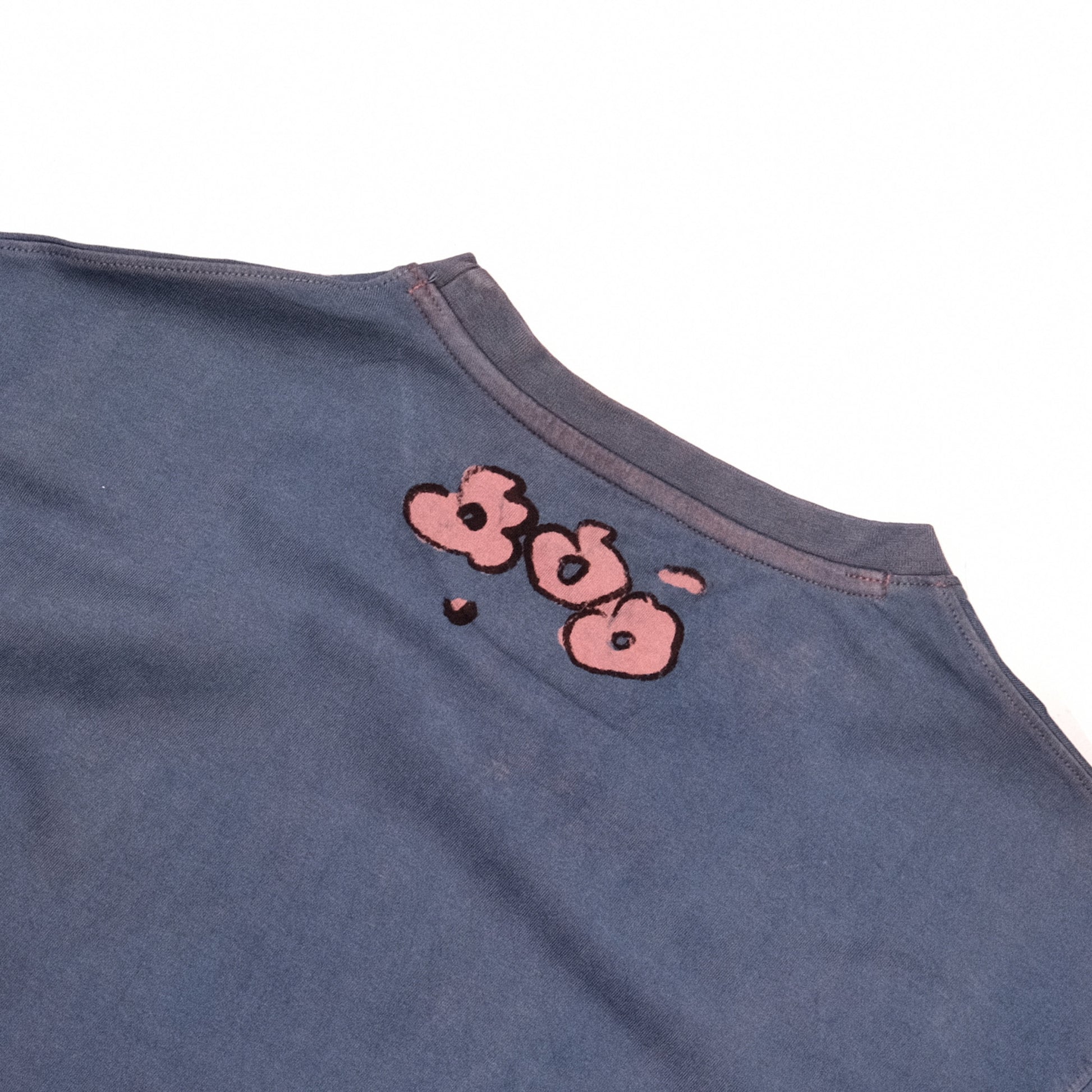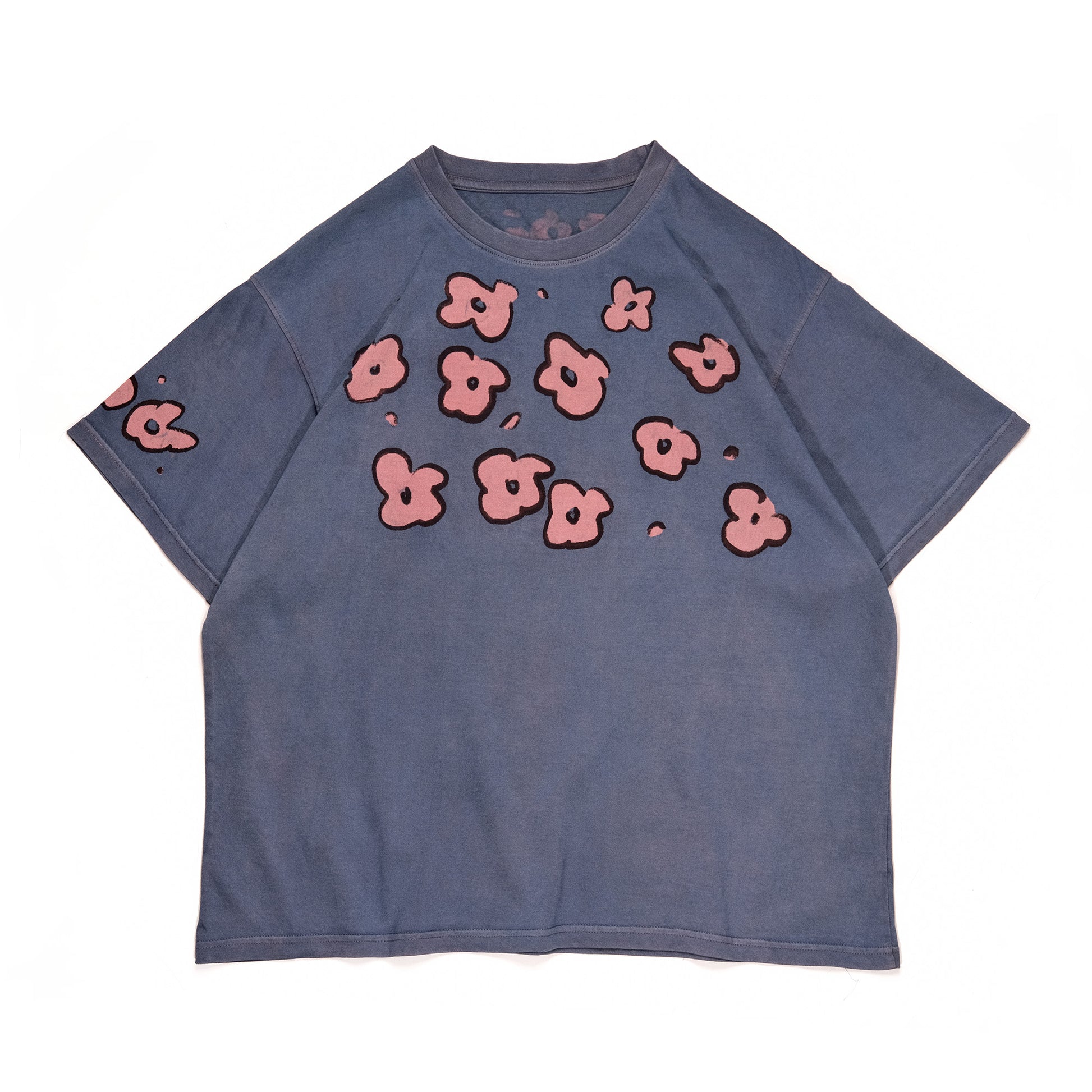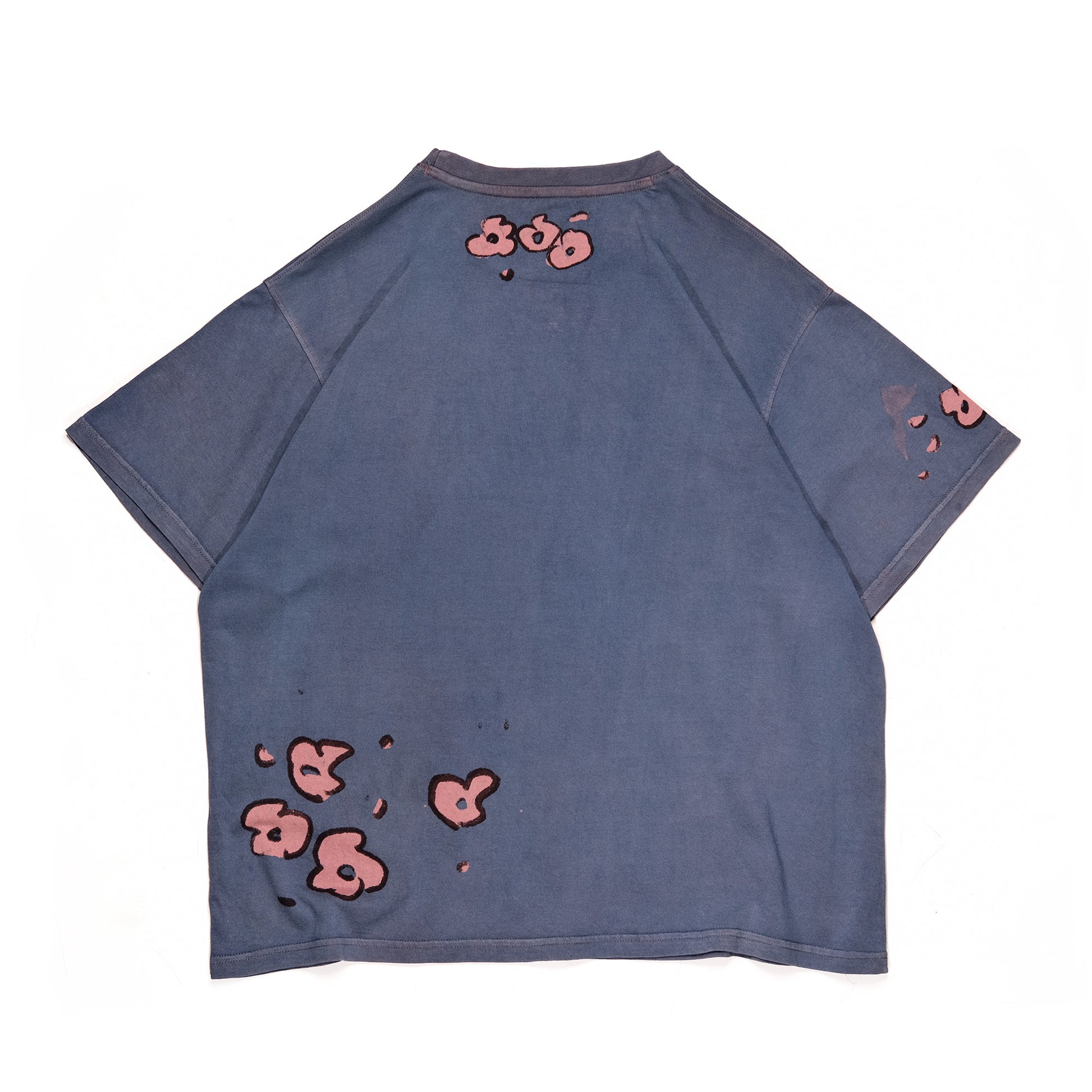 Bakr’s unisex tee, “Florescence,” is first hand-printed in rust black, a shade extracted through the fermentation of iron rust and molasses. It is then over-dyed in 100% madder to establish the base pink. Each piece is carefully hand-resisted using the traditional Japanese rice paste resist technique, before undergoing a final over-dye in our 100% organic honey indigo vat, resulting in layered tones of deep purple with natural variations unique to every garment.