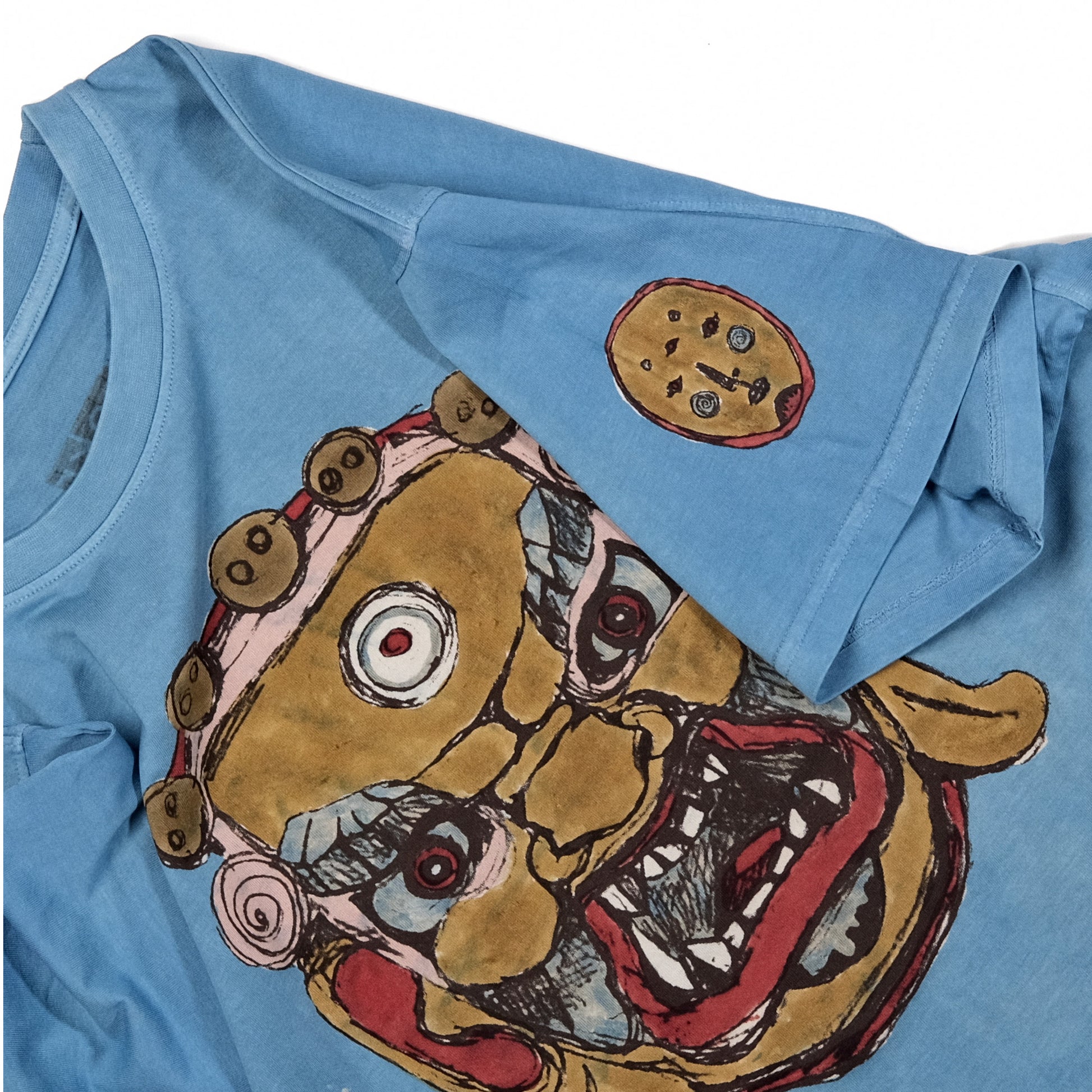 Bakr’s unisex oversized t-shirt, “Hex,” in Indigo Ink is hand-printed in rust black, hand-painted with myrobalan yellow, Madder extract, organic indigo paste, and alizarin extracted from Madder. It is hand-resisted using the Japanese rice paste resist technique and overdyed in our 100% organic honey indigo vat. Each piece takes approximately three days to create.