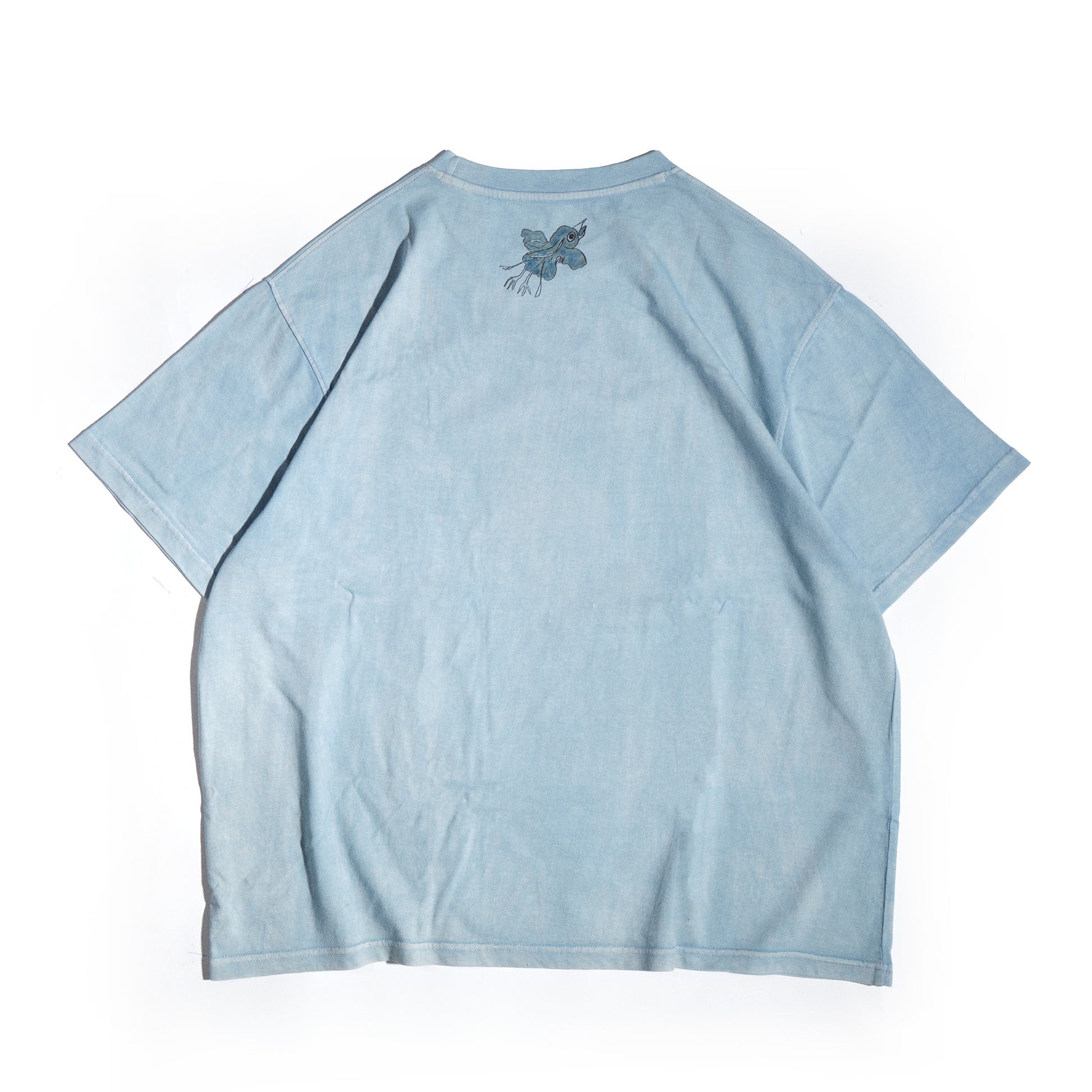 BAKR’s unisex tee “Kitty Kitty” is hand-printed in iron rust black, prepared through a 45-day fermentation of iron rust and molasses. The print is then hand-painted using our 100% organic indigo paste, made in-house, and finally overdyed in our 100% organic honey-fed indigo vat