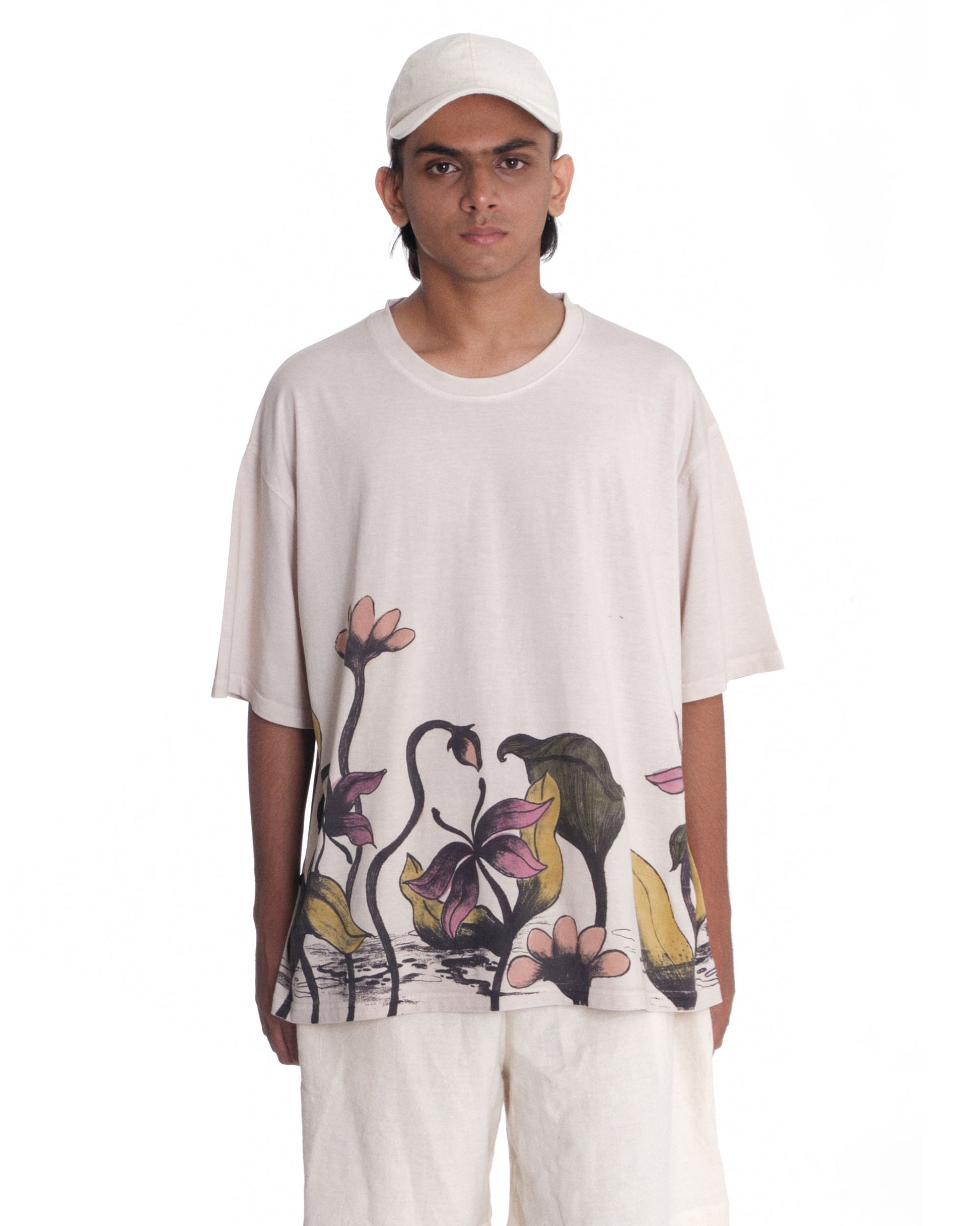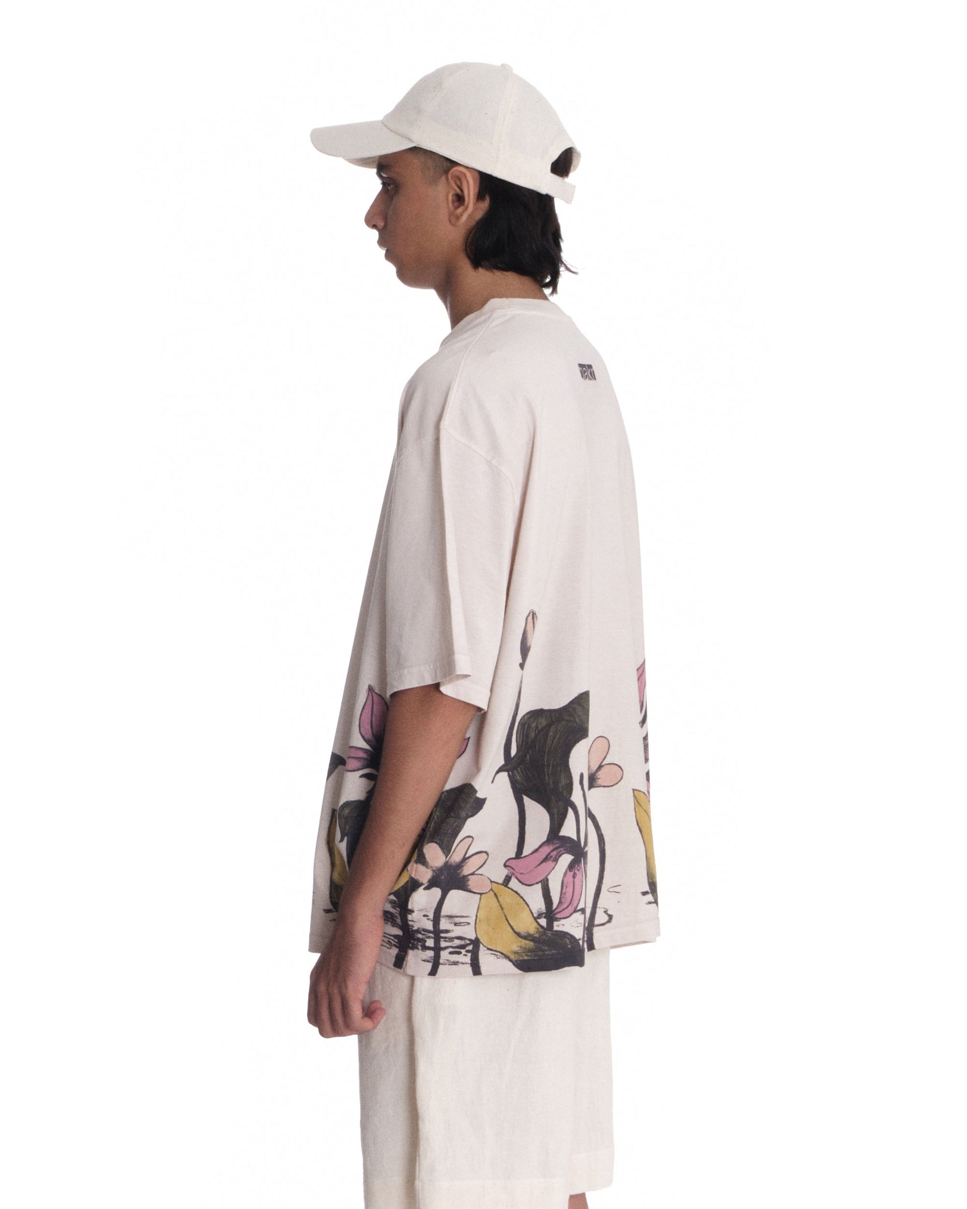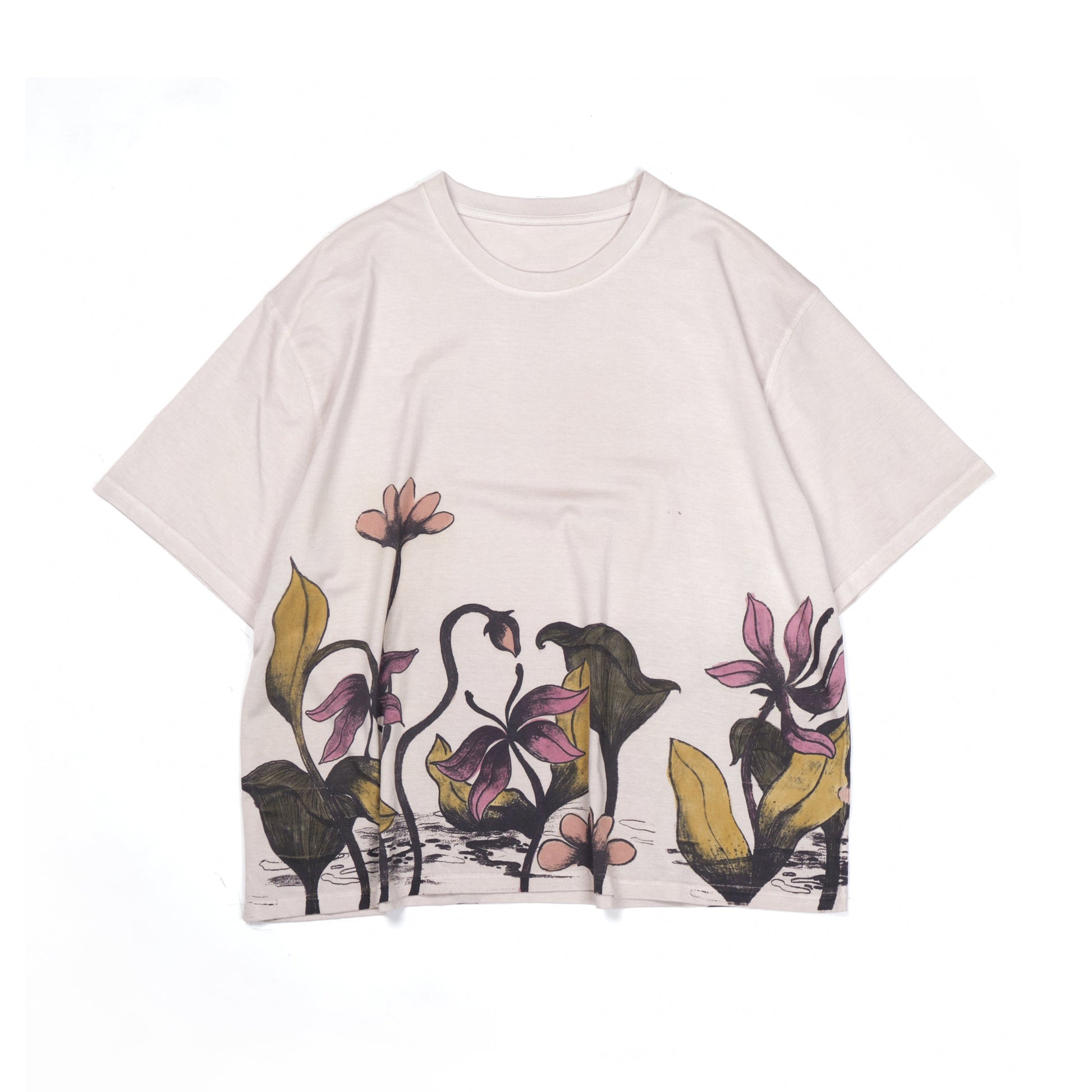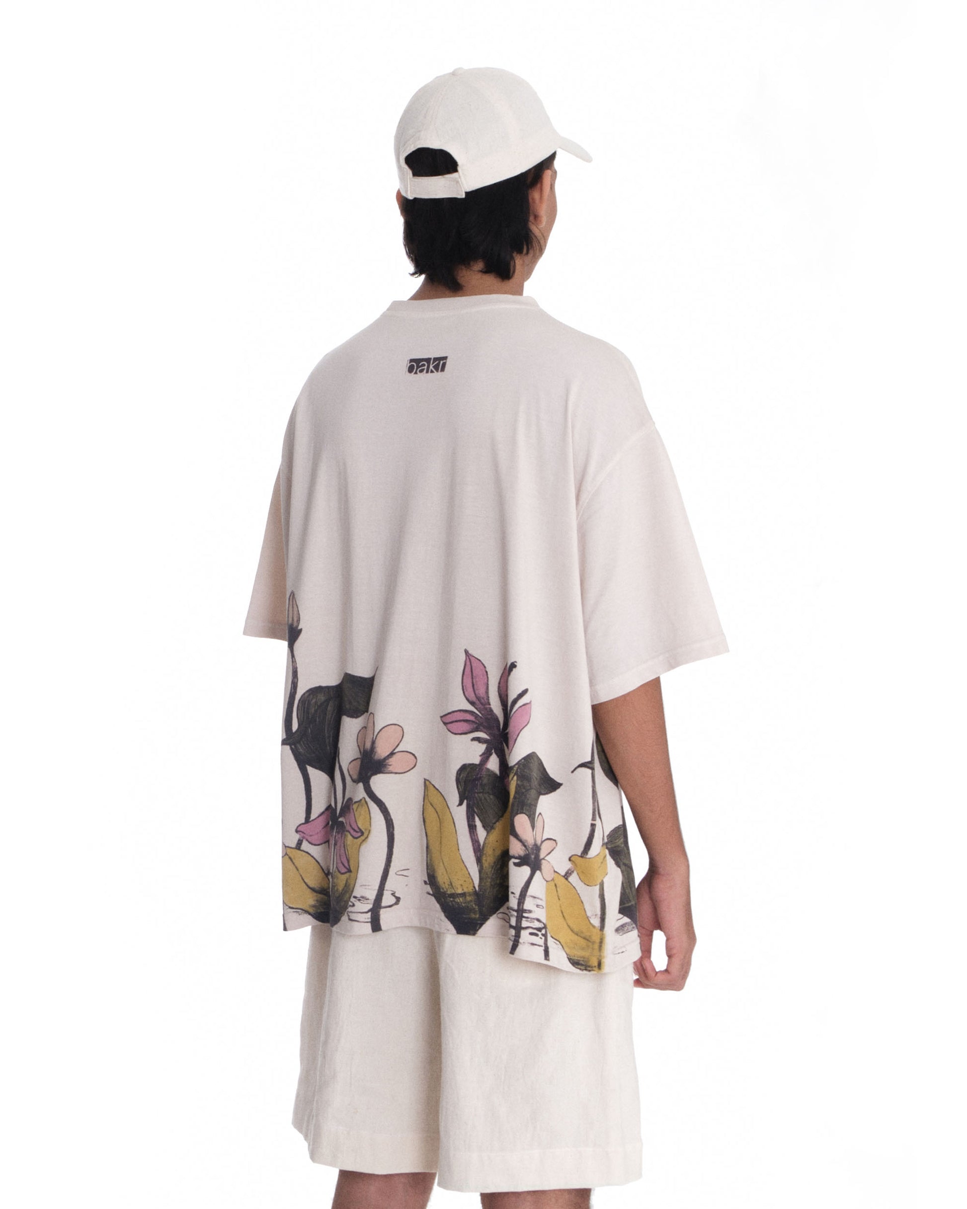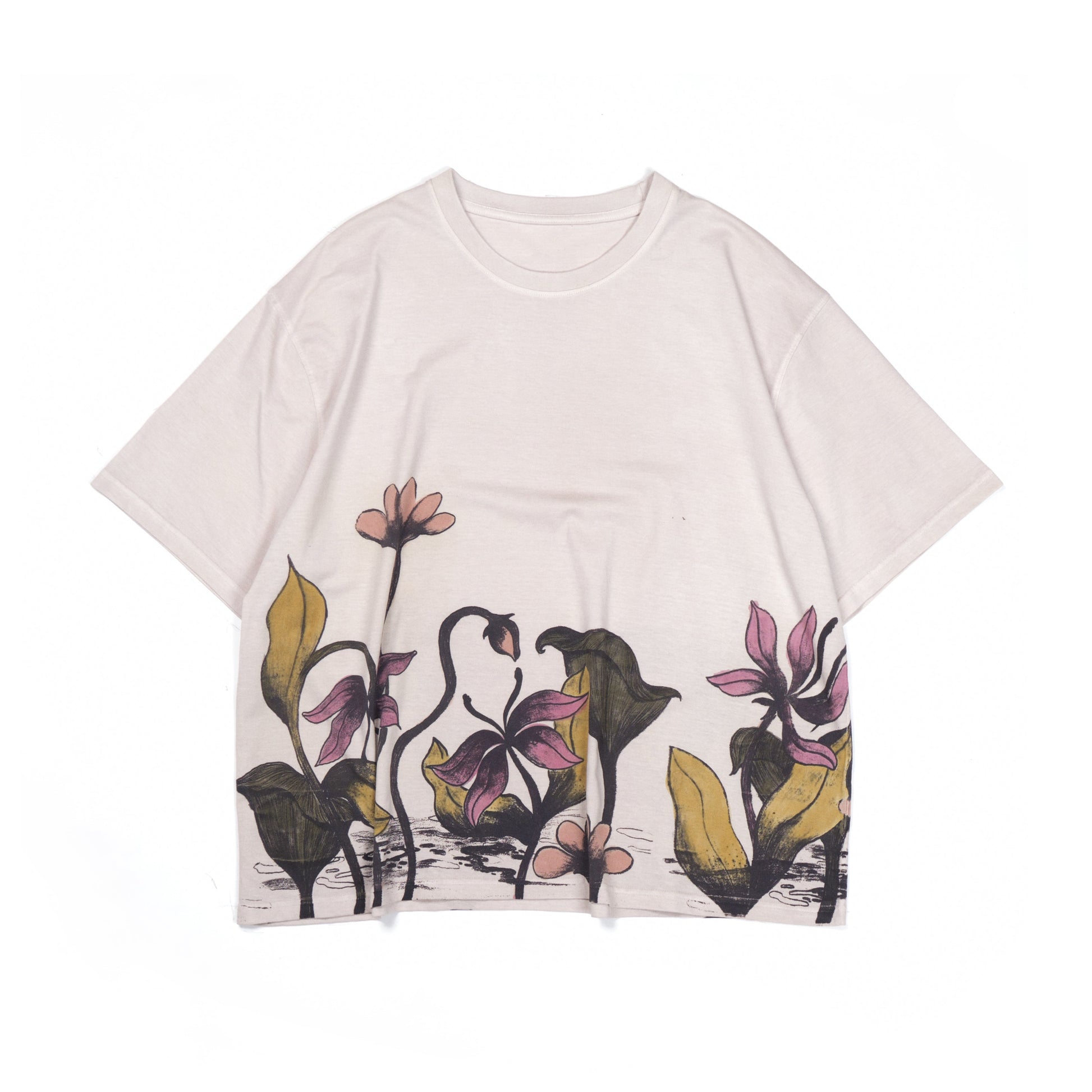Introducing Bakr’s “Lotus Garden” oversized unisex t-shirt in “Natural Ecru.” Hand-printed in rust black, derived through the fermentation of iron rust and molasses, it is then hand-painted using 100% natural dyes extracted from nature.