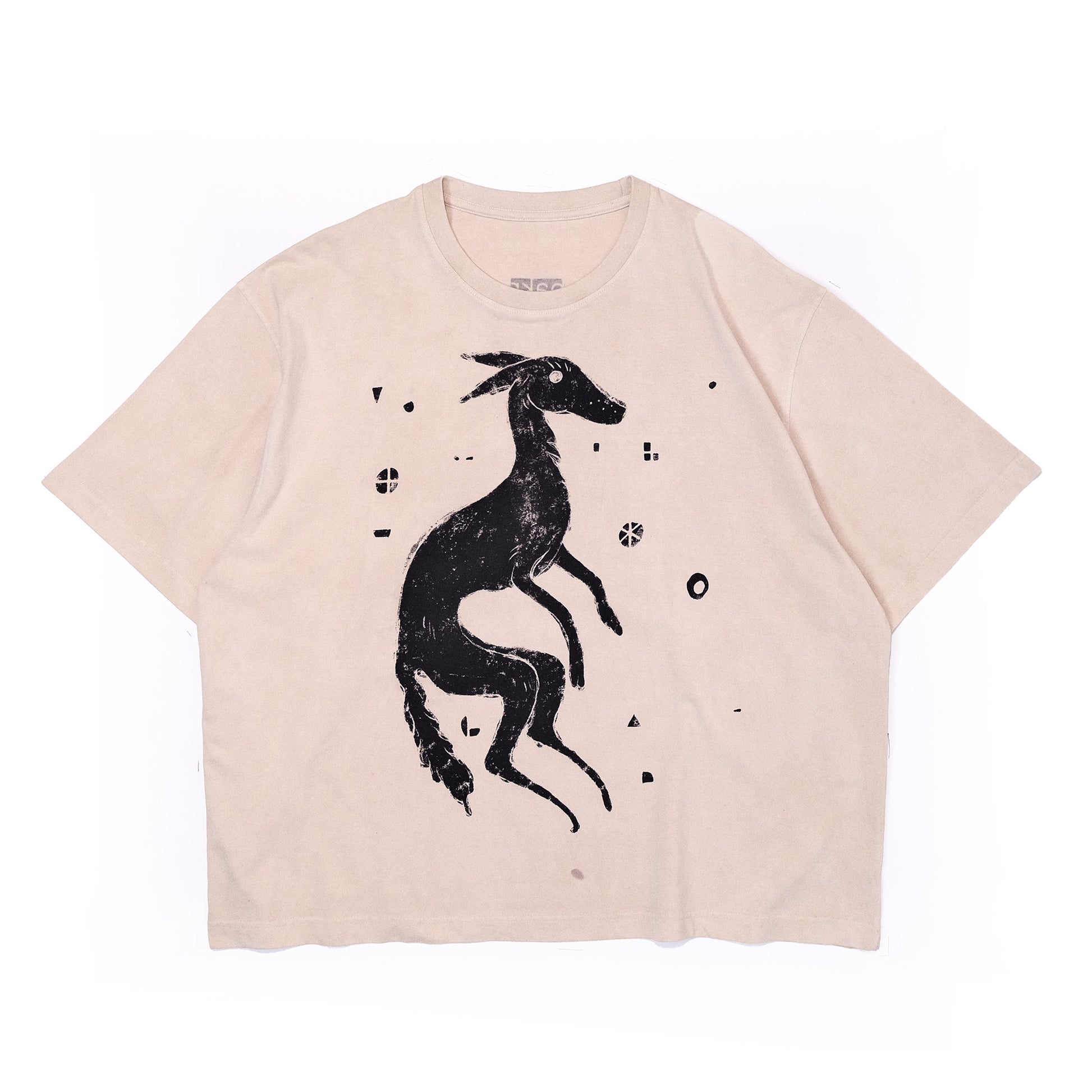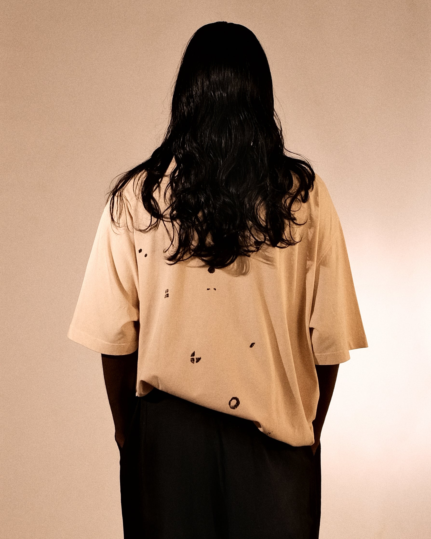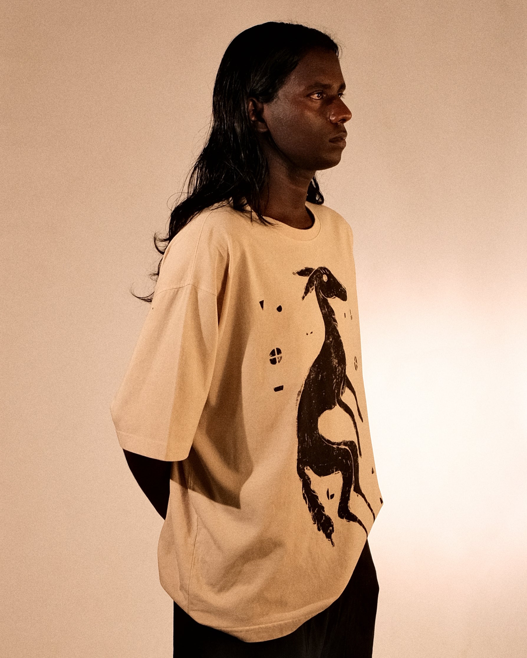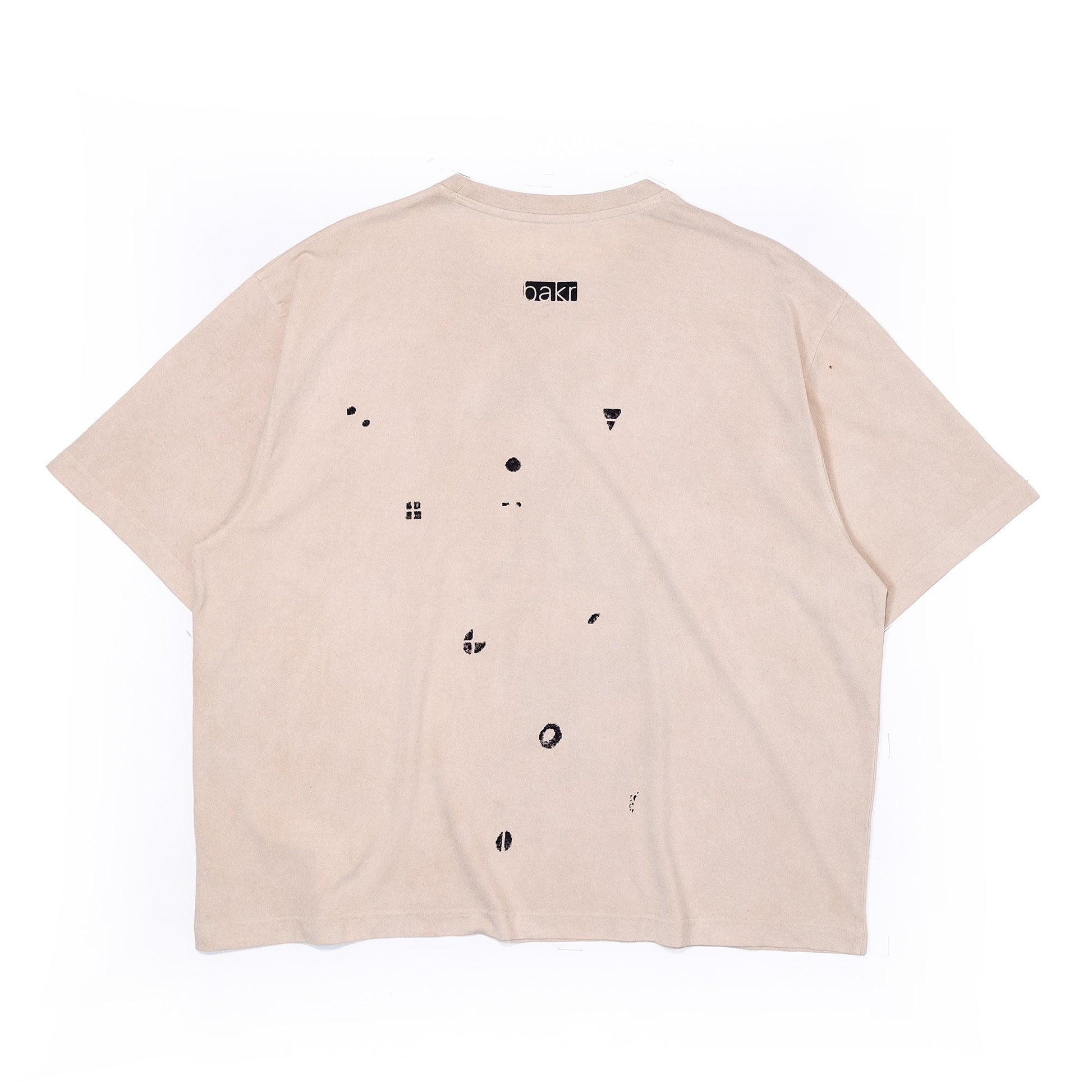 Bakr’s unisex oversized t-shirt, “Lunaris,” in ecru is hand printed in rust black, and takes approximately 2 days to make.