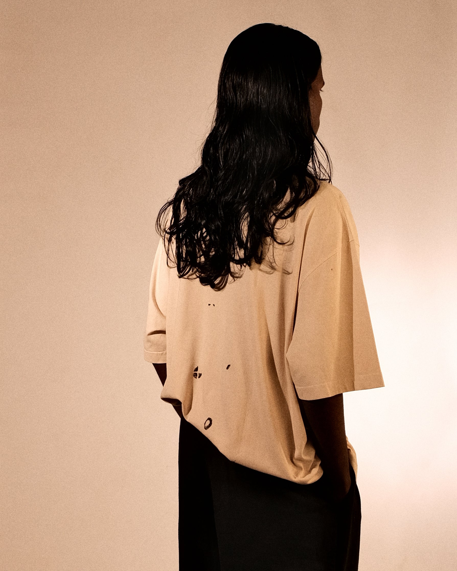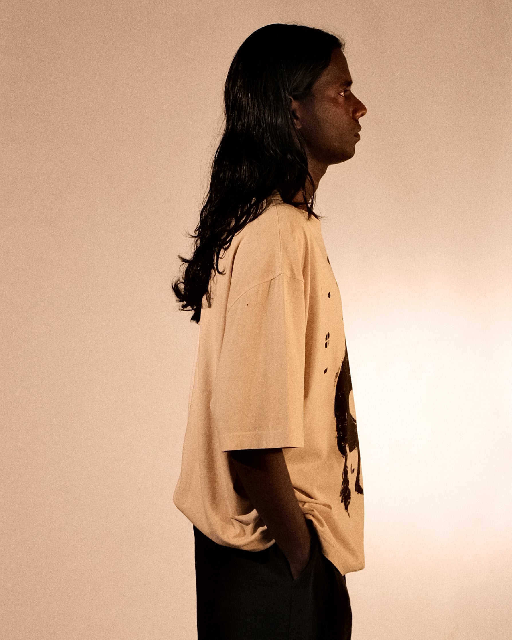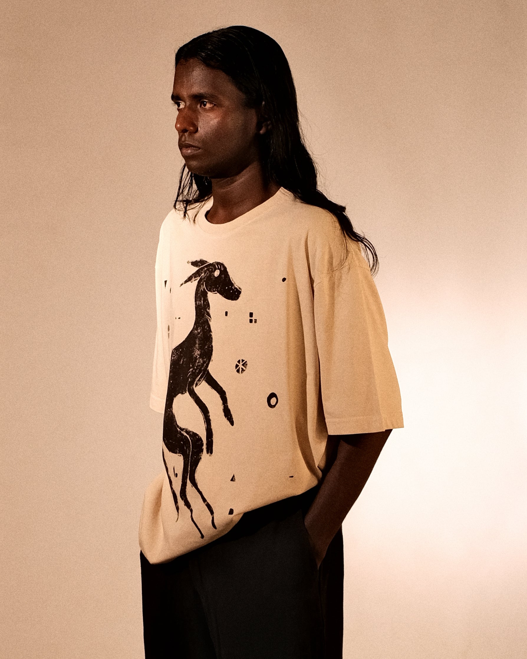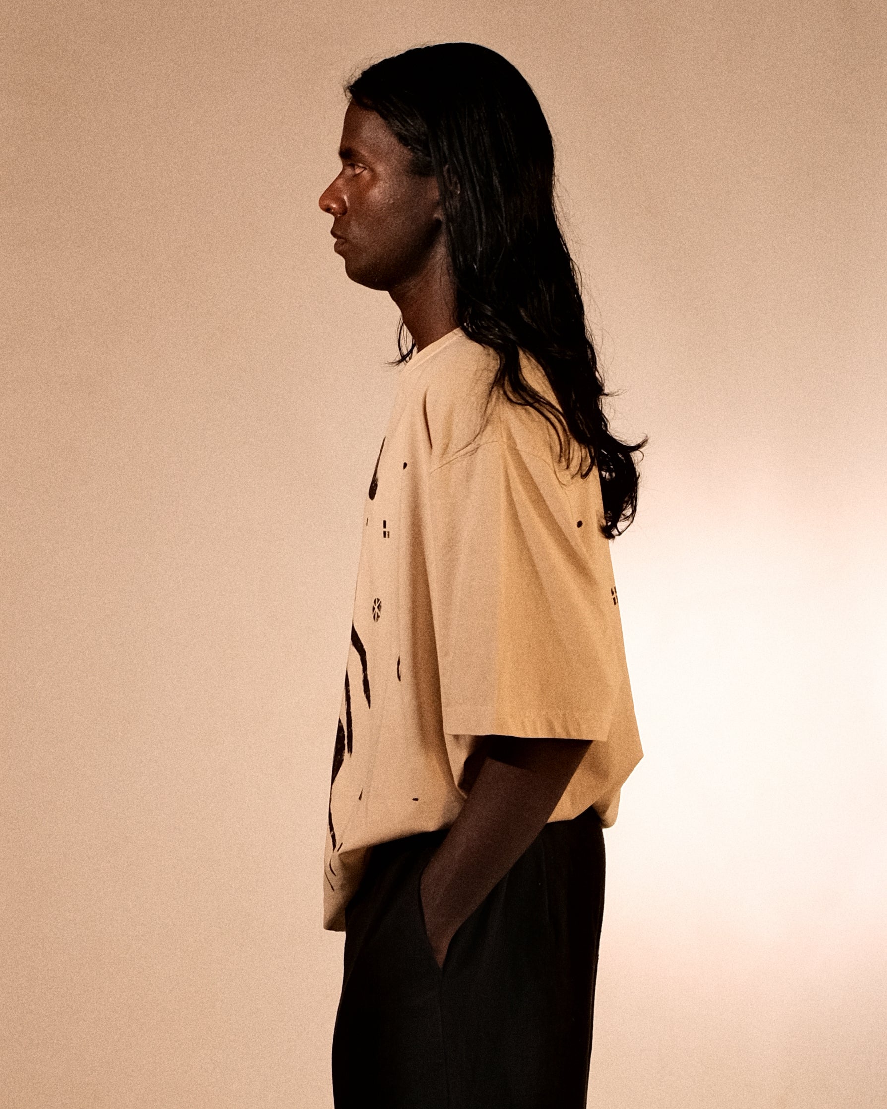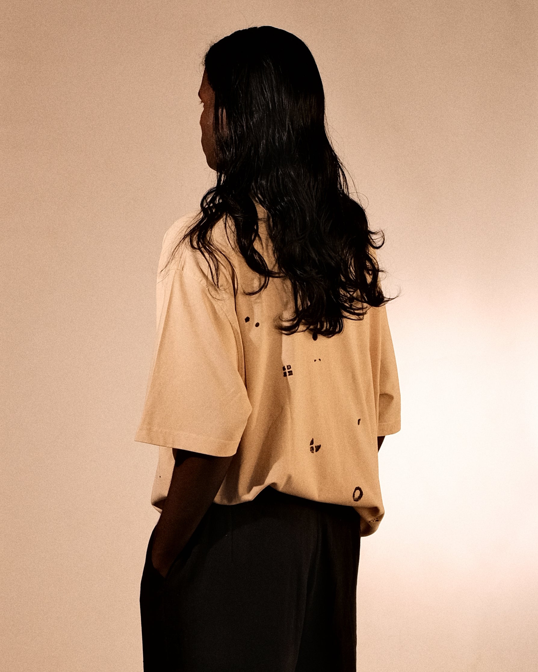 Bakr’s unisex oversized t-shirt, “Lunaris,” in ecru is hand printed in rust black, and takes approximately 2 days to make.
