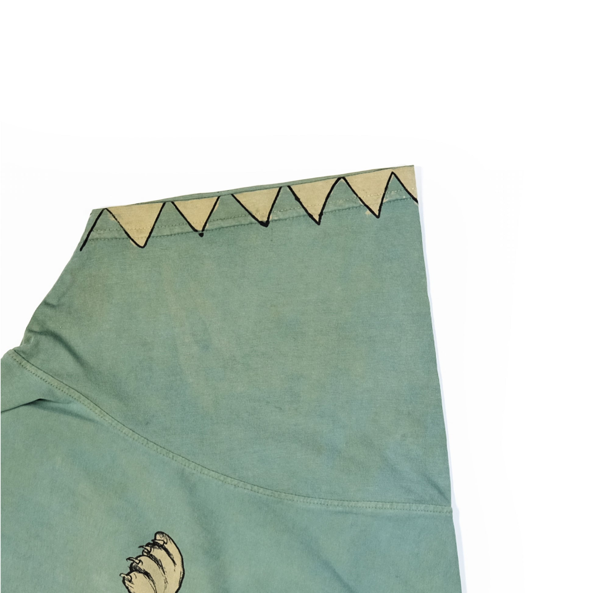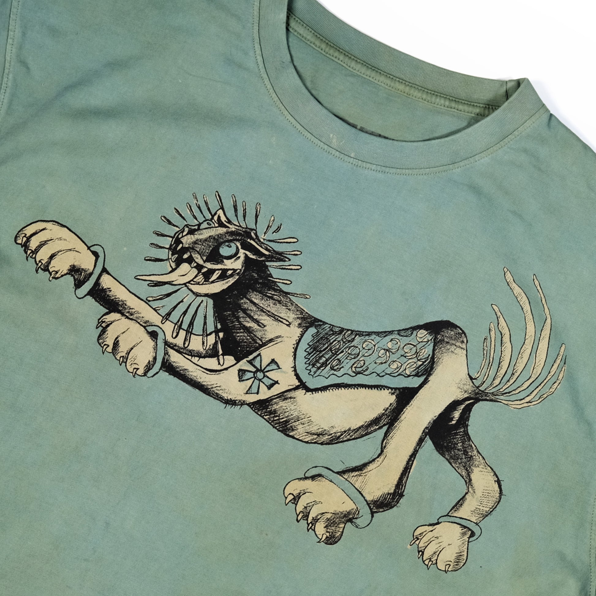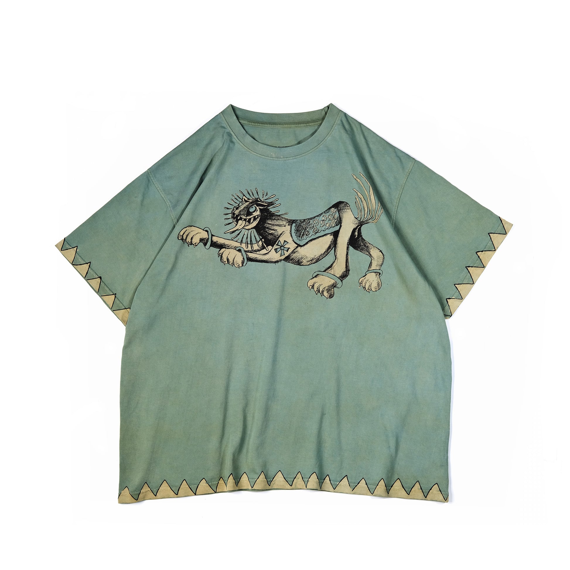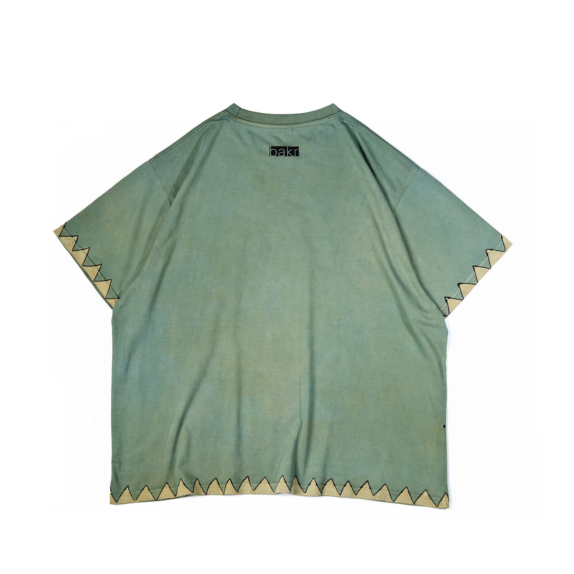 Bakr’s unisex tee, “Monster Mash,” is first hand-dyed in myrobalan yellow, extracted from the flowers of the myrobalan tree. The black designs are then printed using rust black, developed through a fermentation of iron rust and molasses. Each piece is hand-resisted using the traditional Japanese rice paste resist technique before being over-dyed in our 100% organic honey indigo vat.