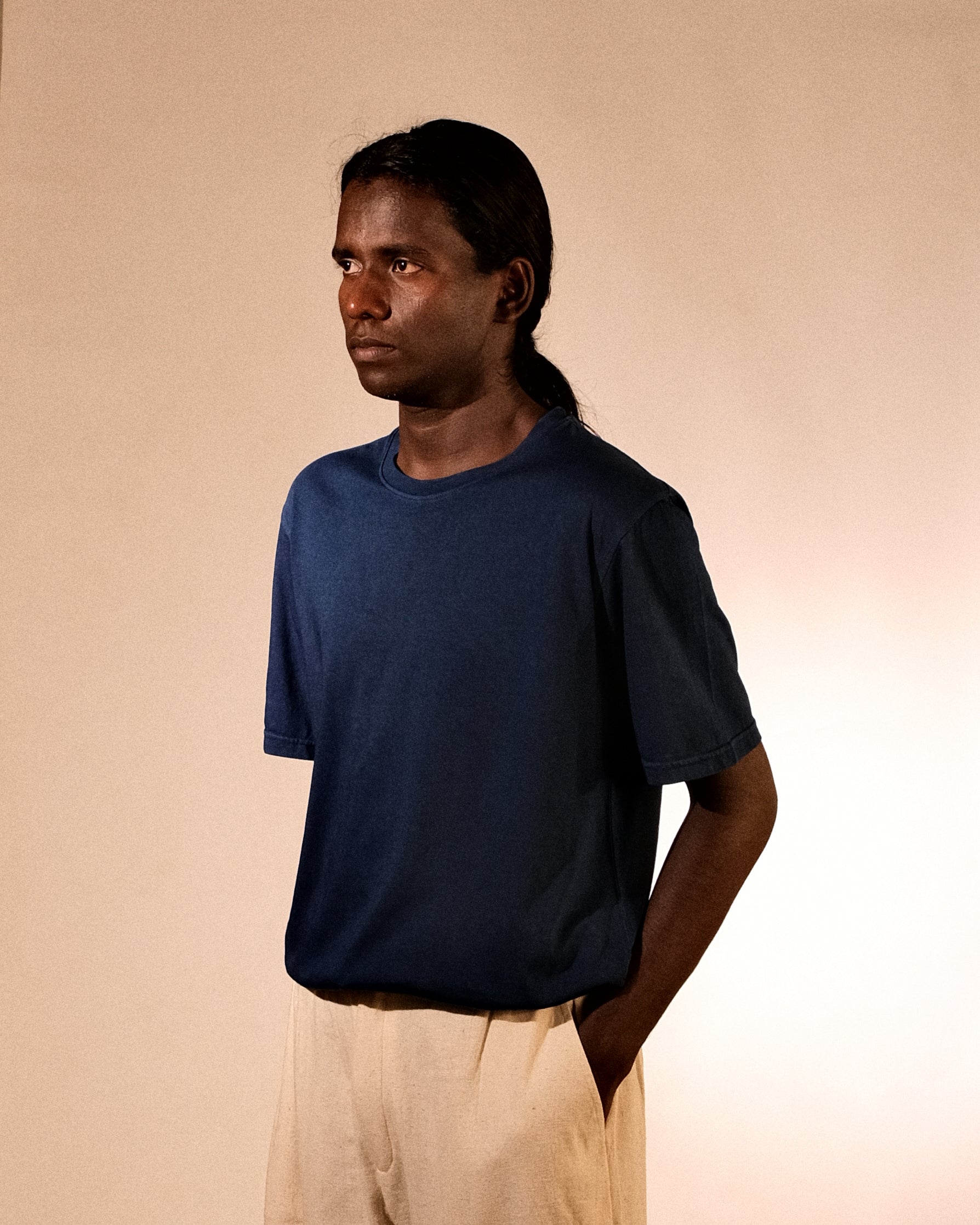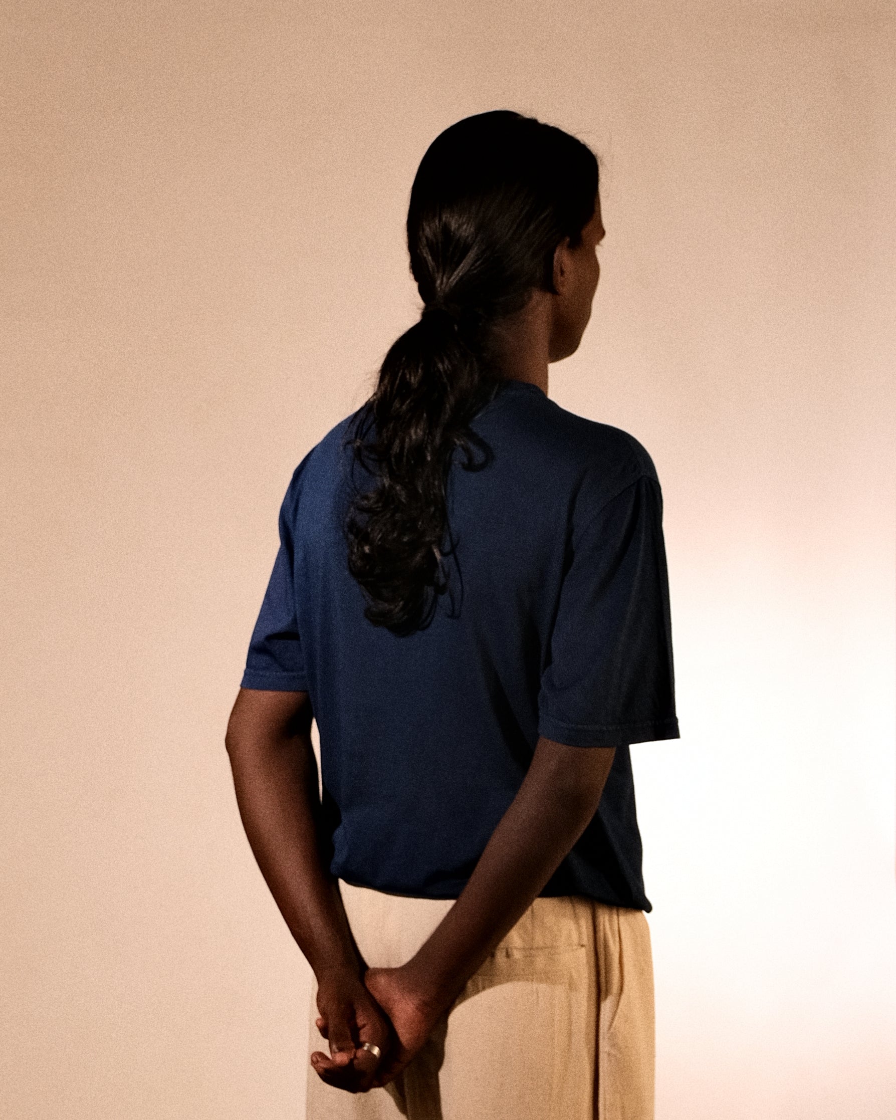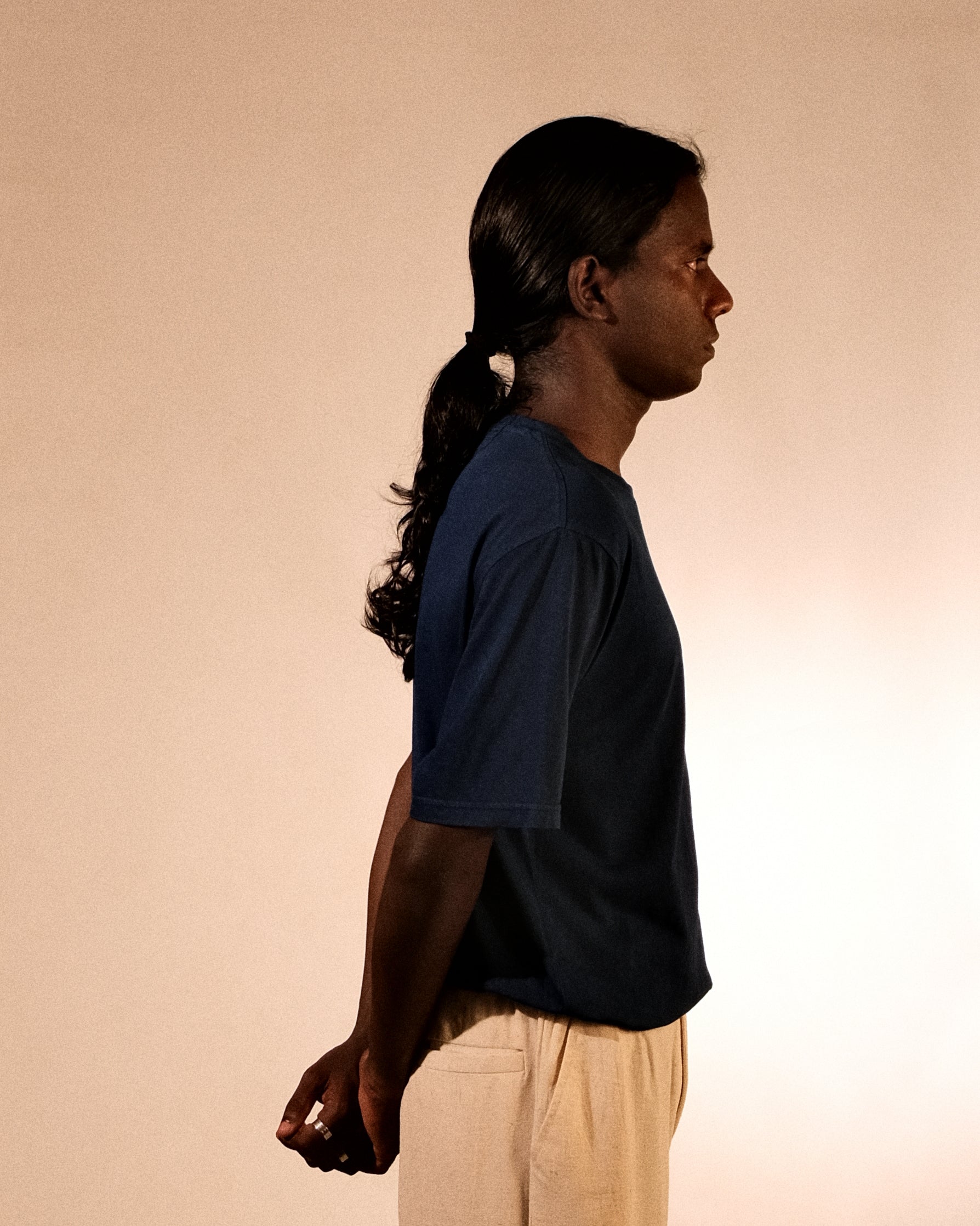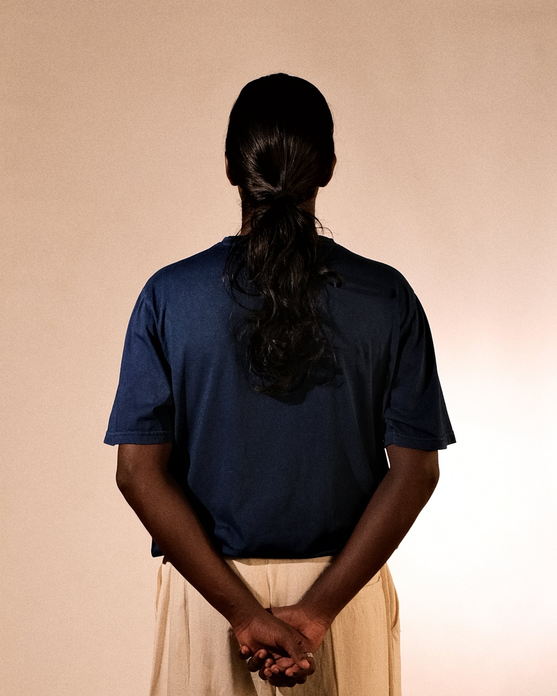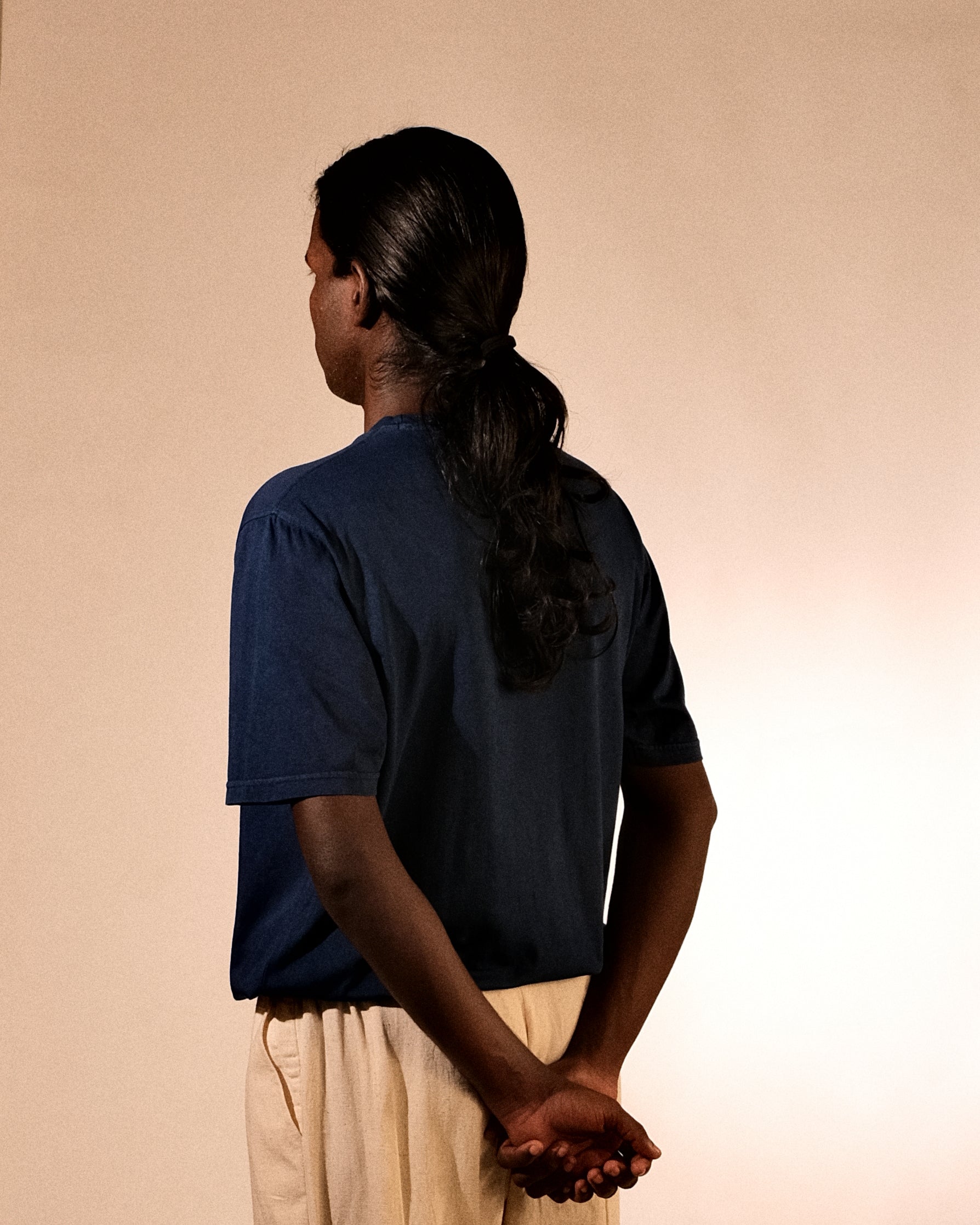 Bakr’s basic unisex t-shirt, “Nightfall,” is hand-dipped and oxidised 18 times over in our 100% organic honey indigo vat.