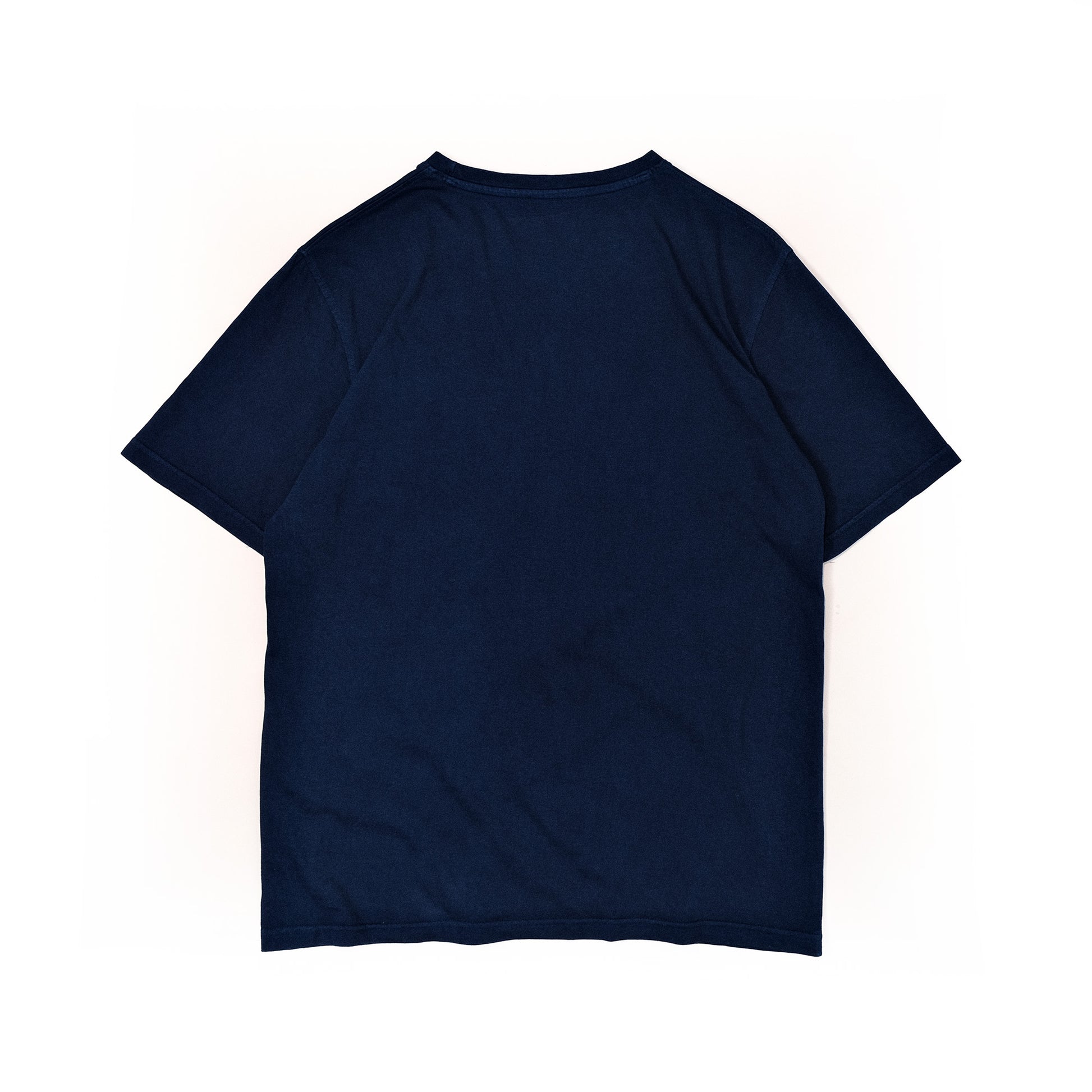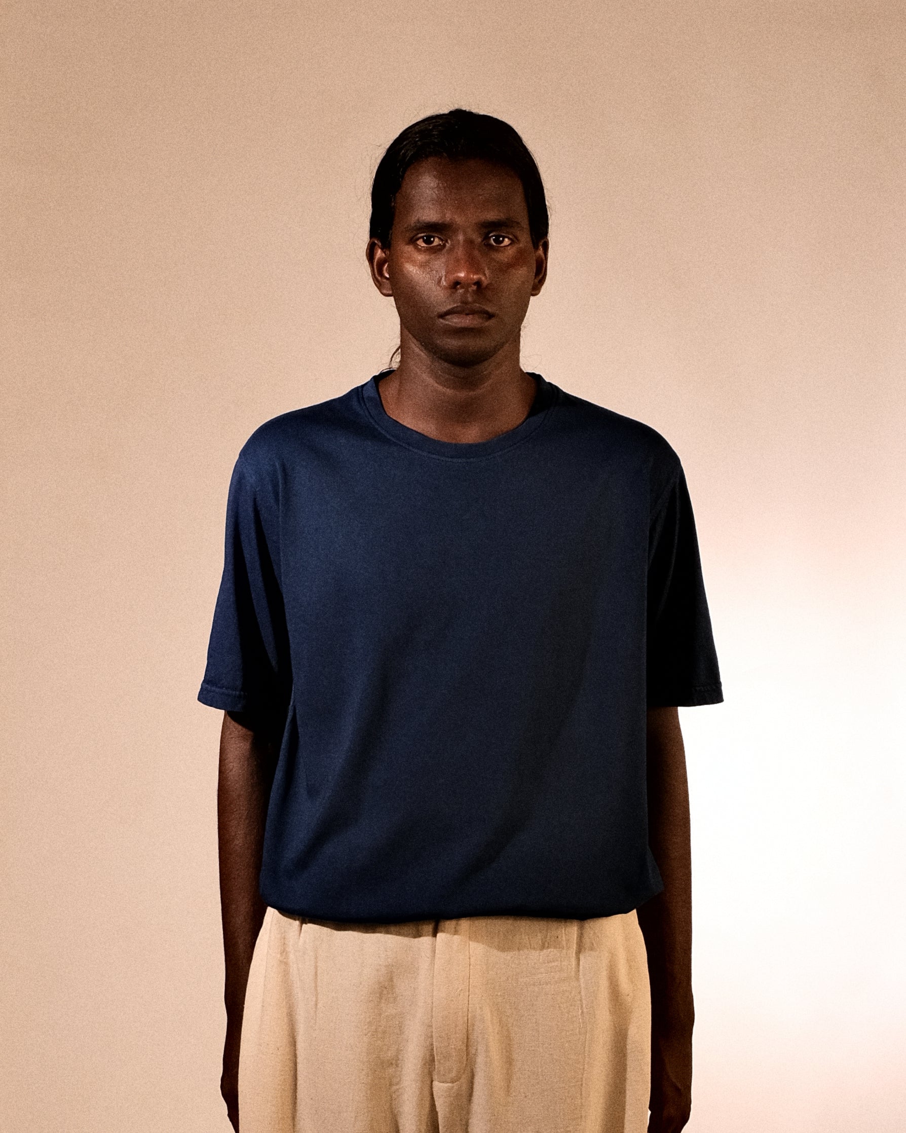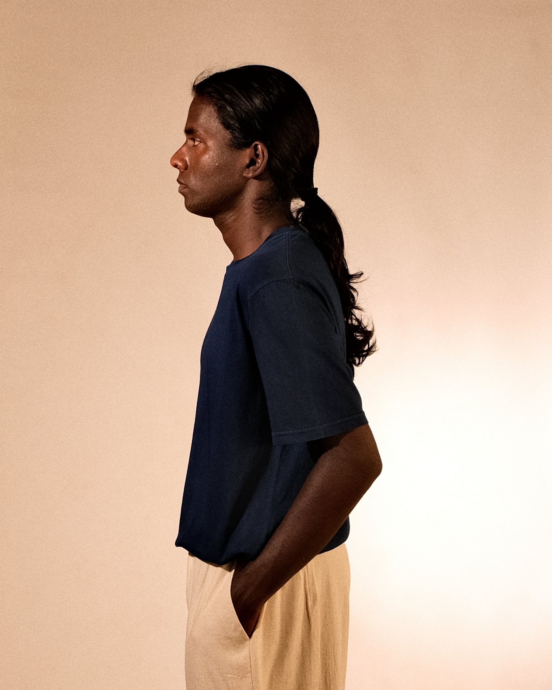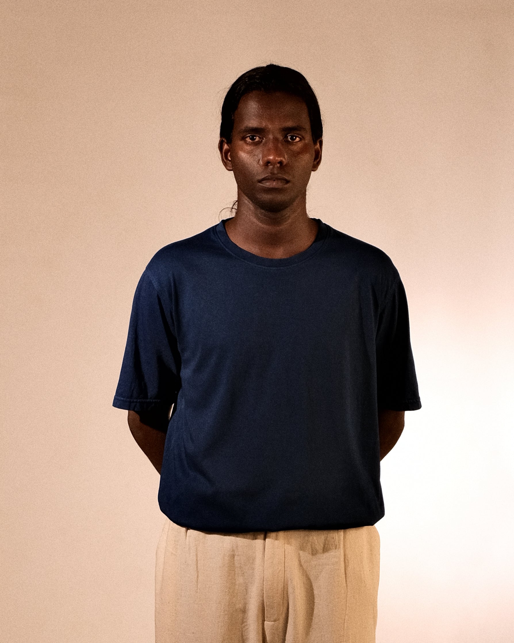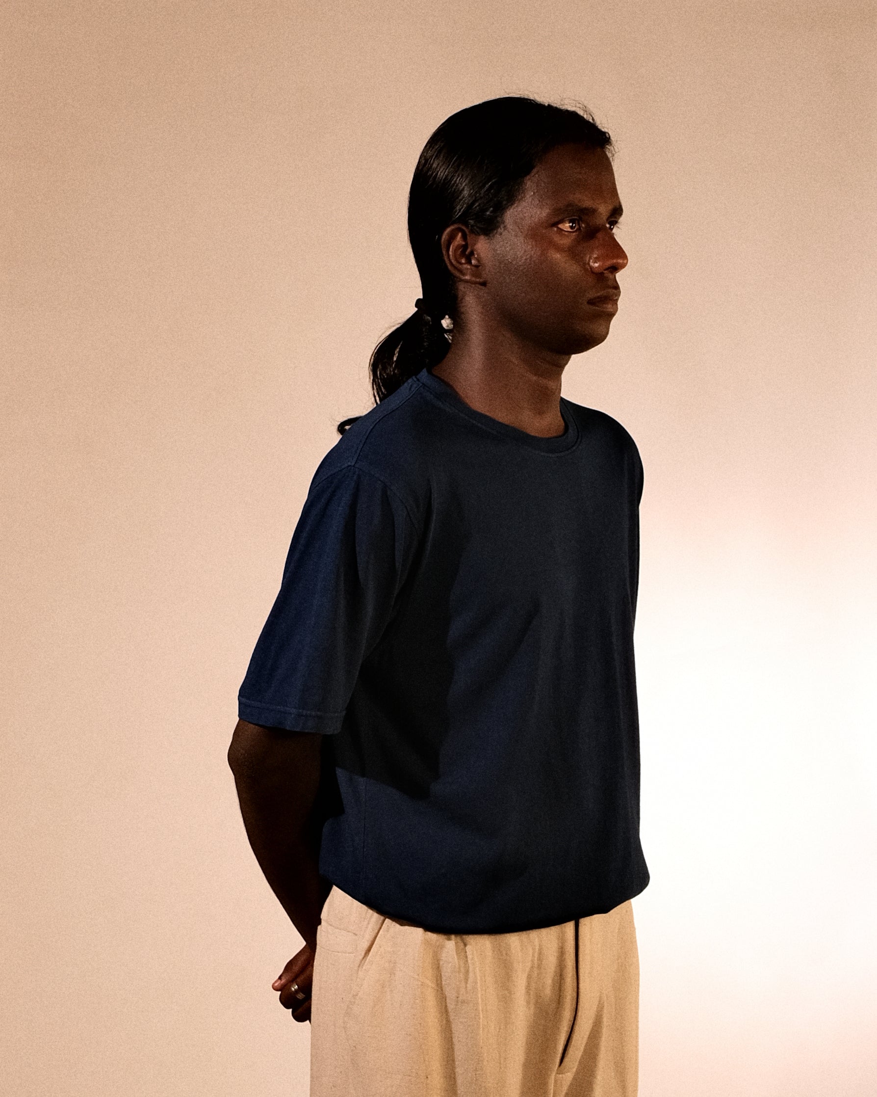 Bakr’s basic unisex t-shirt, “Nightfall,” is hand-dipped and oxidised 18 times over in our 100% organic honey indigo vat.