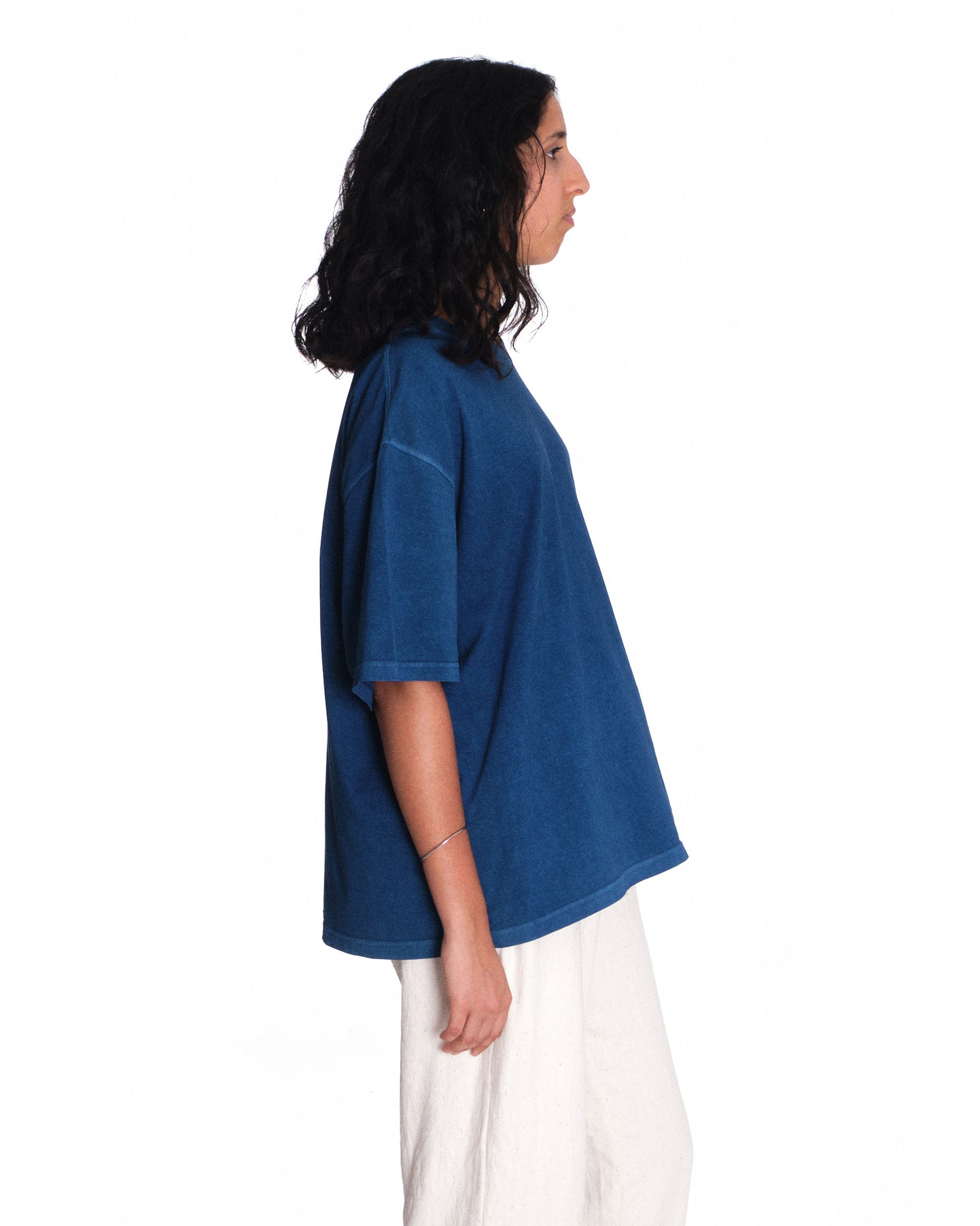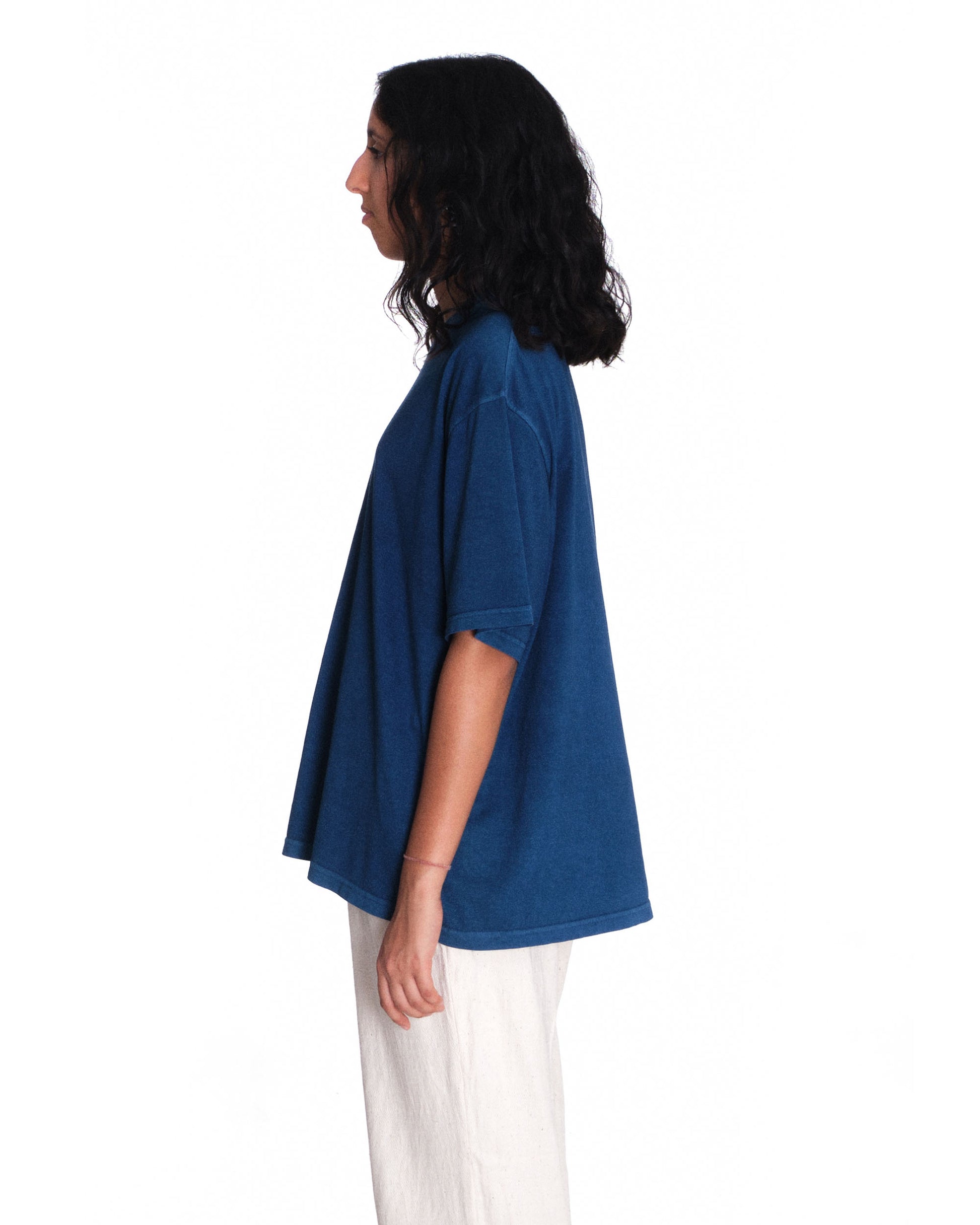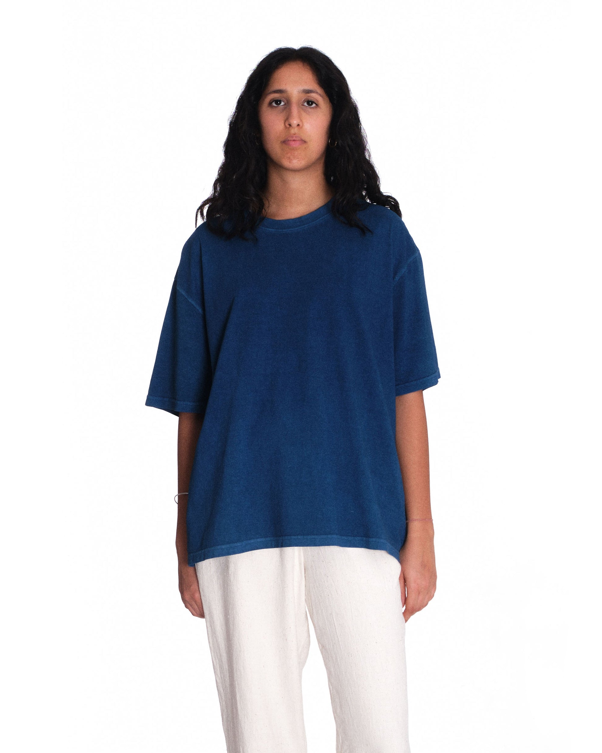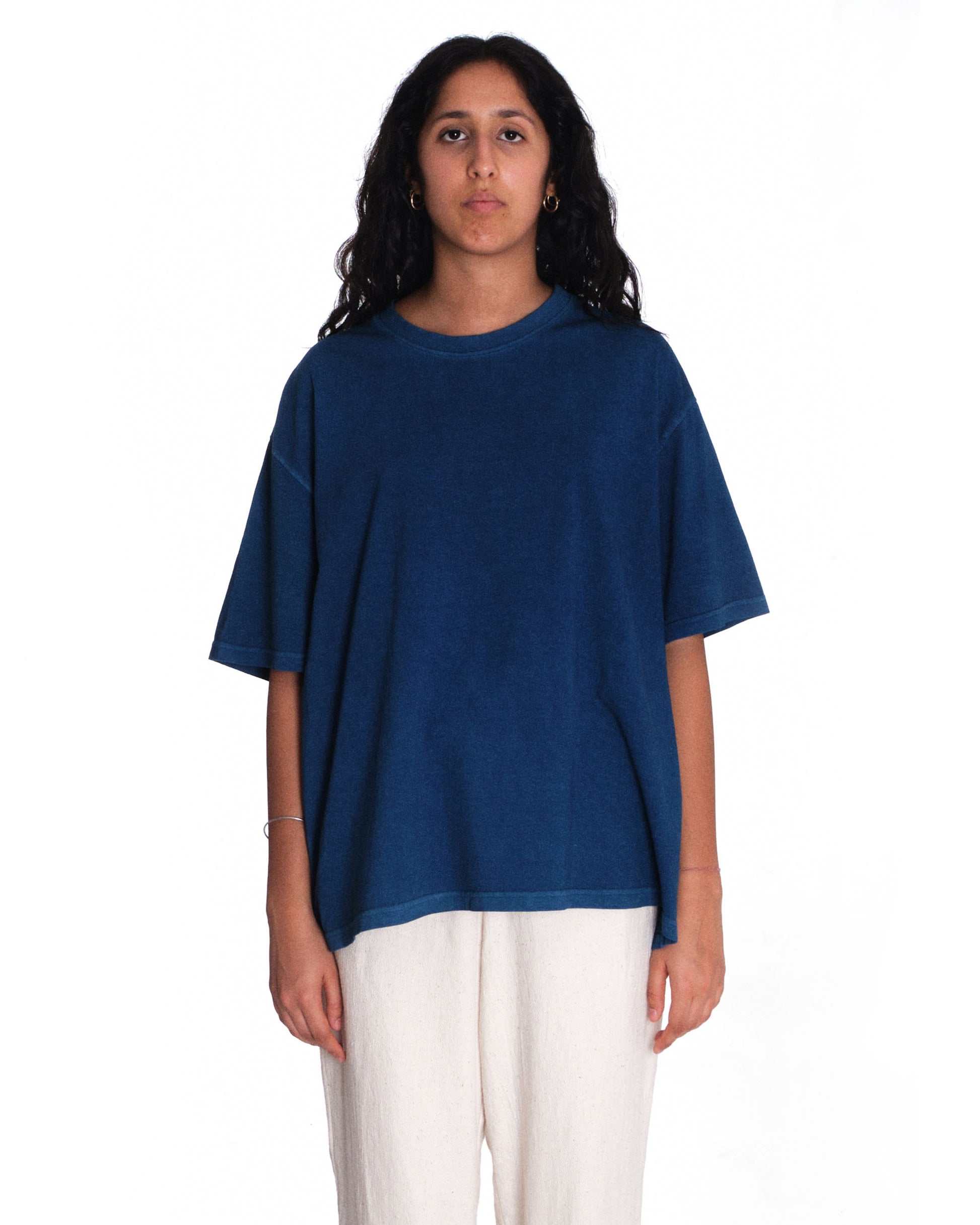 Introducing Bakr’s “Nightfall” oversized unisex t-shirt in “8Dip indigo.” Each shirt undergoes a meticulous process, being hand-dipped and oxidized twelve times in our 100% organic indigo honey vat. This results in a rich, deep hue that’s as luxurious as it is thoughtfully crafted.