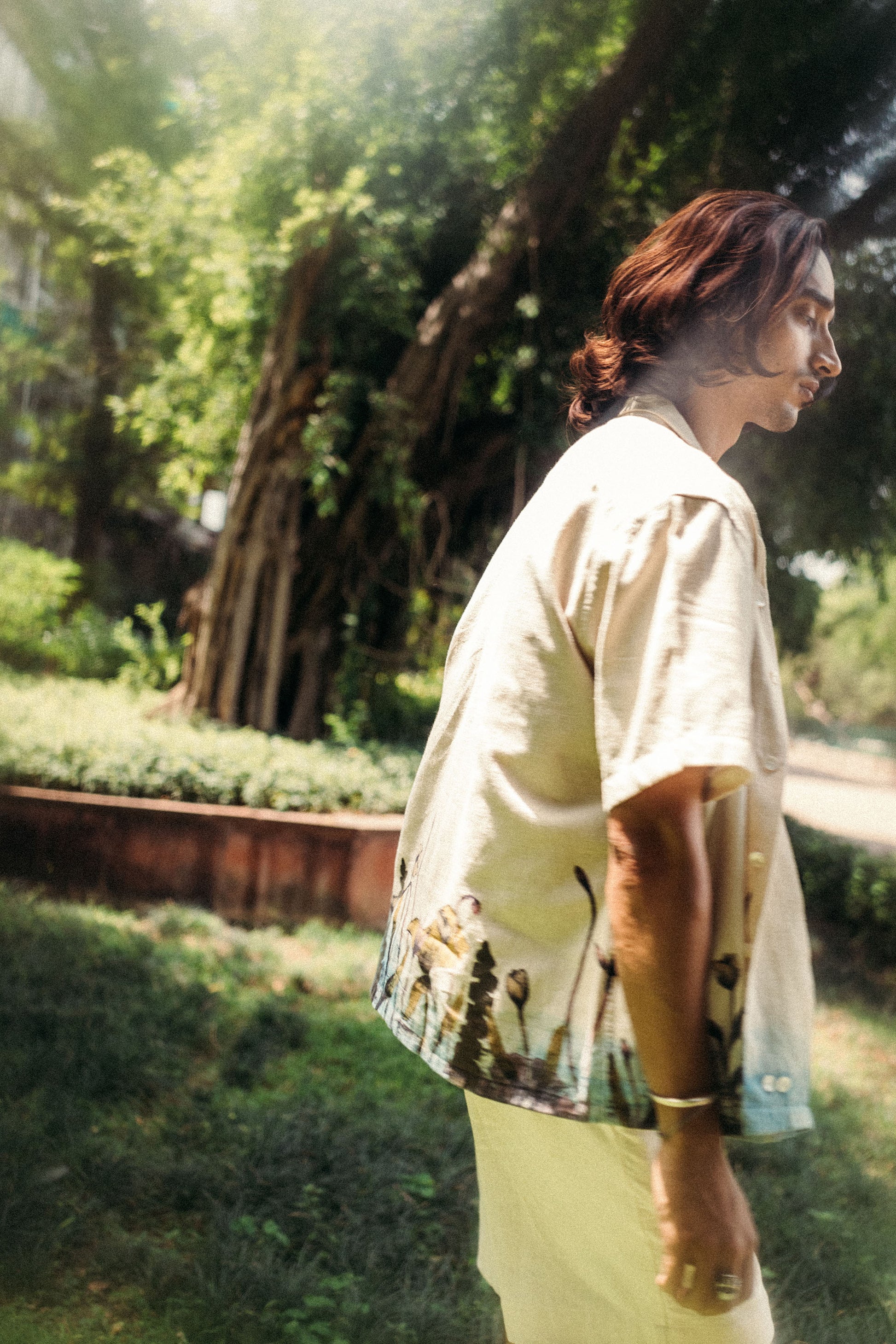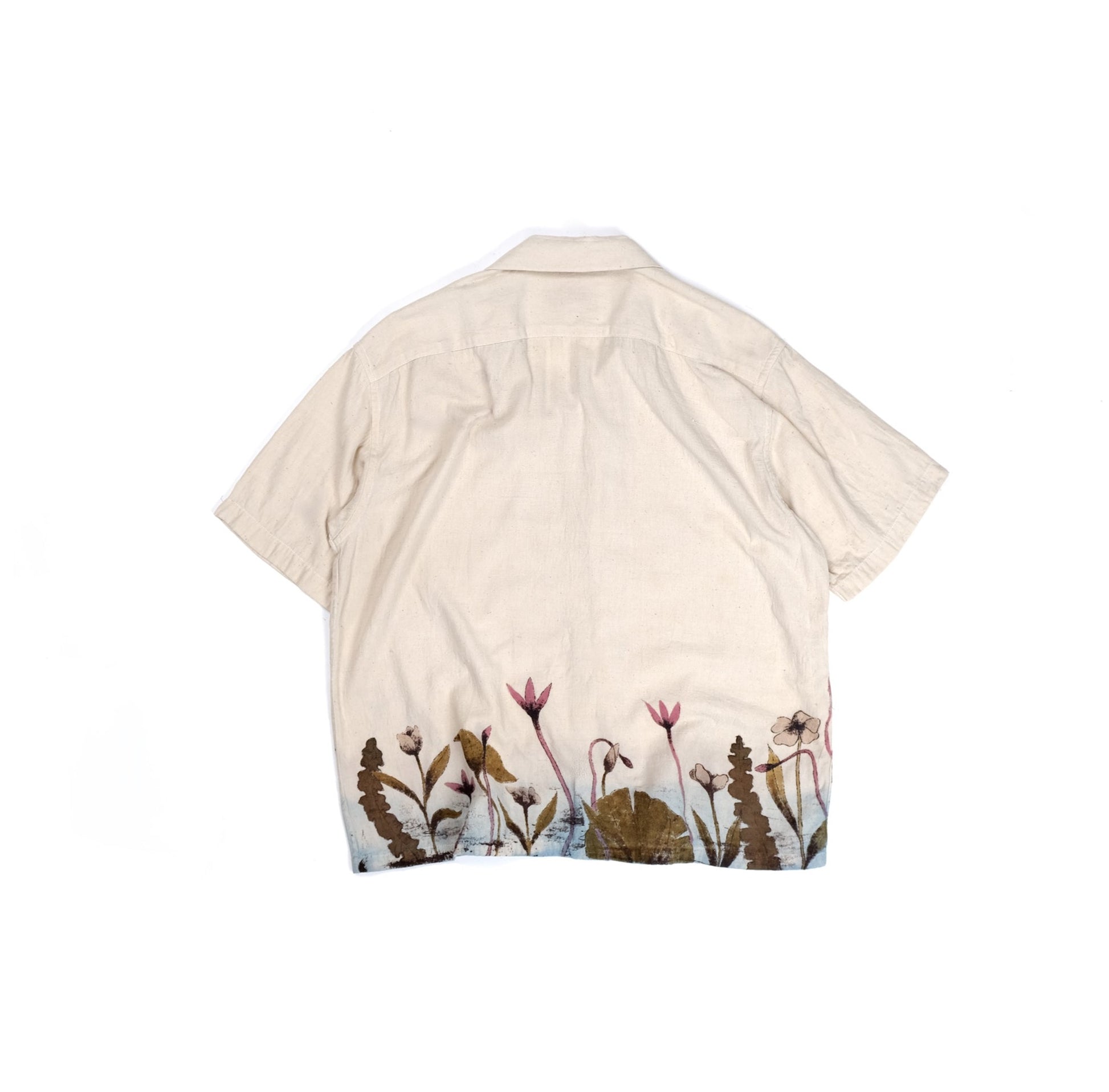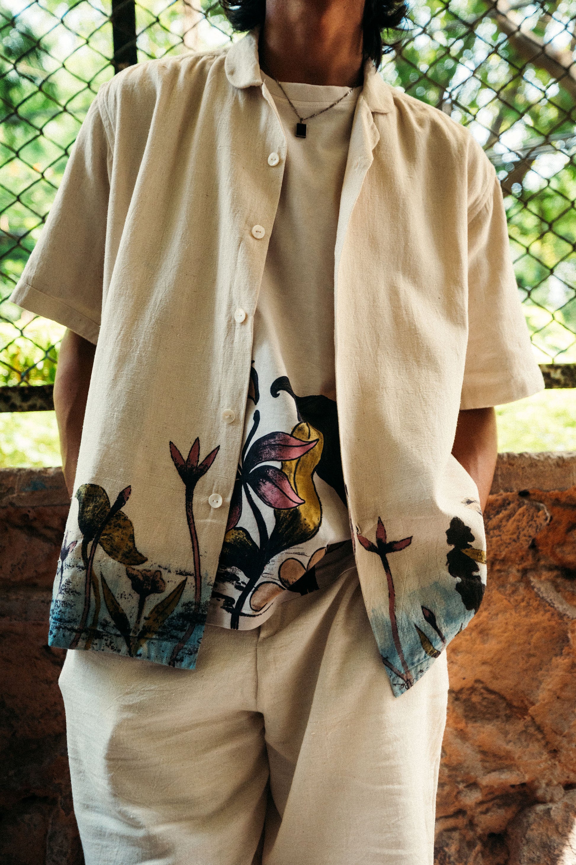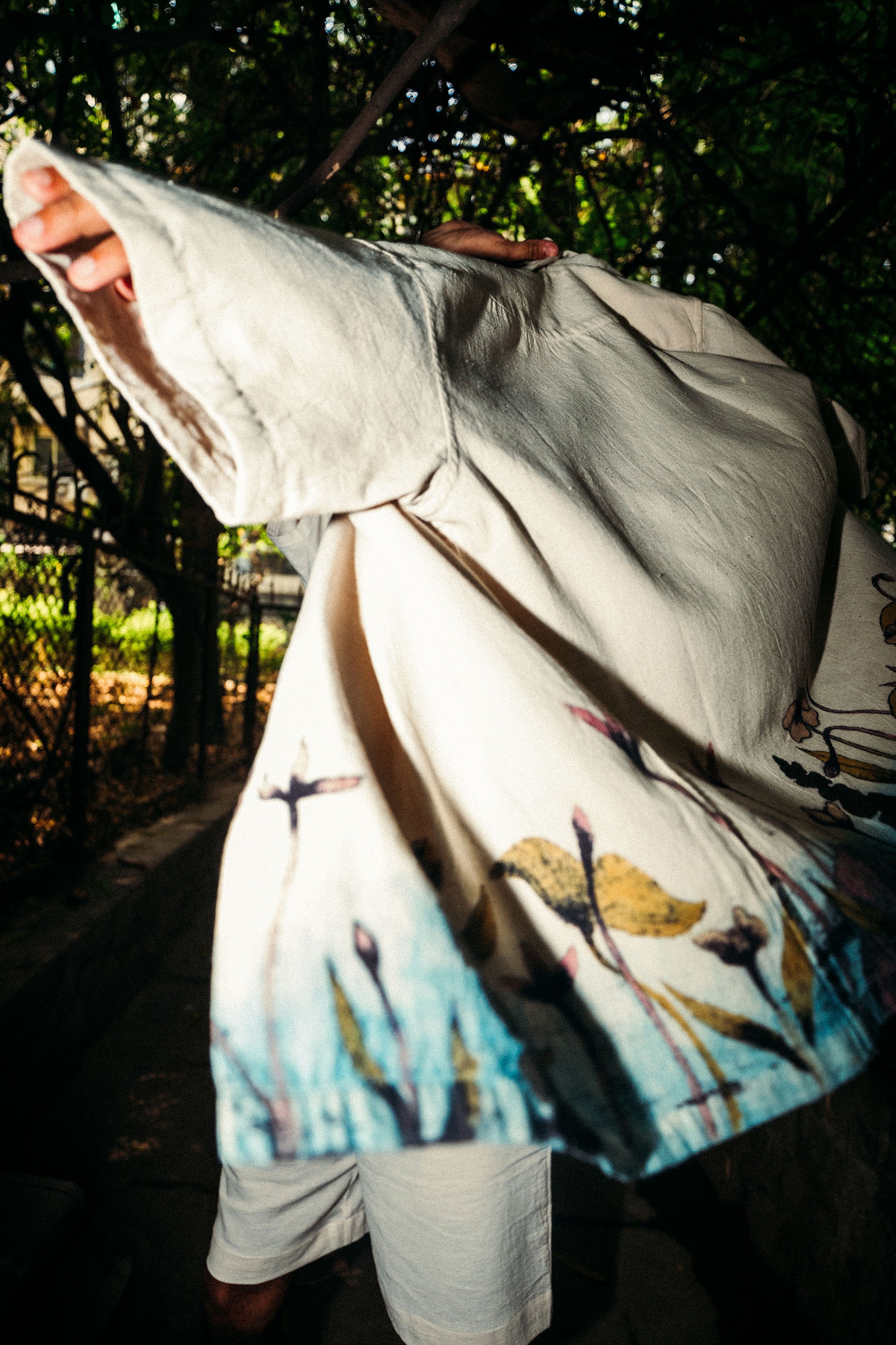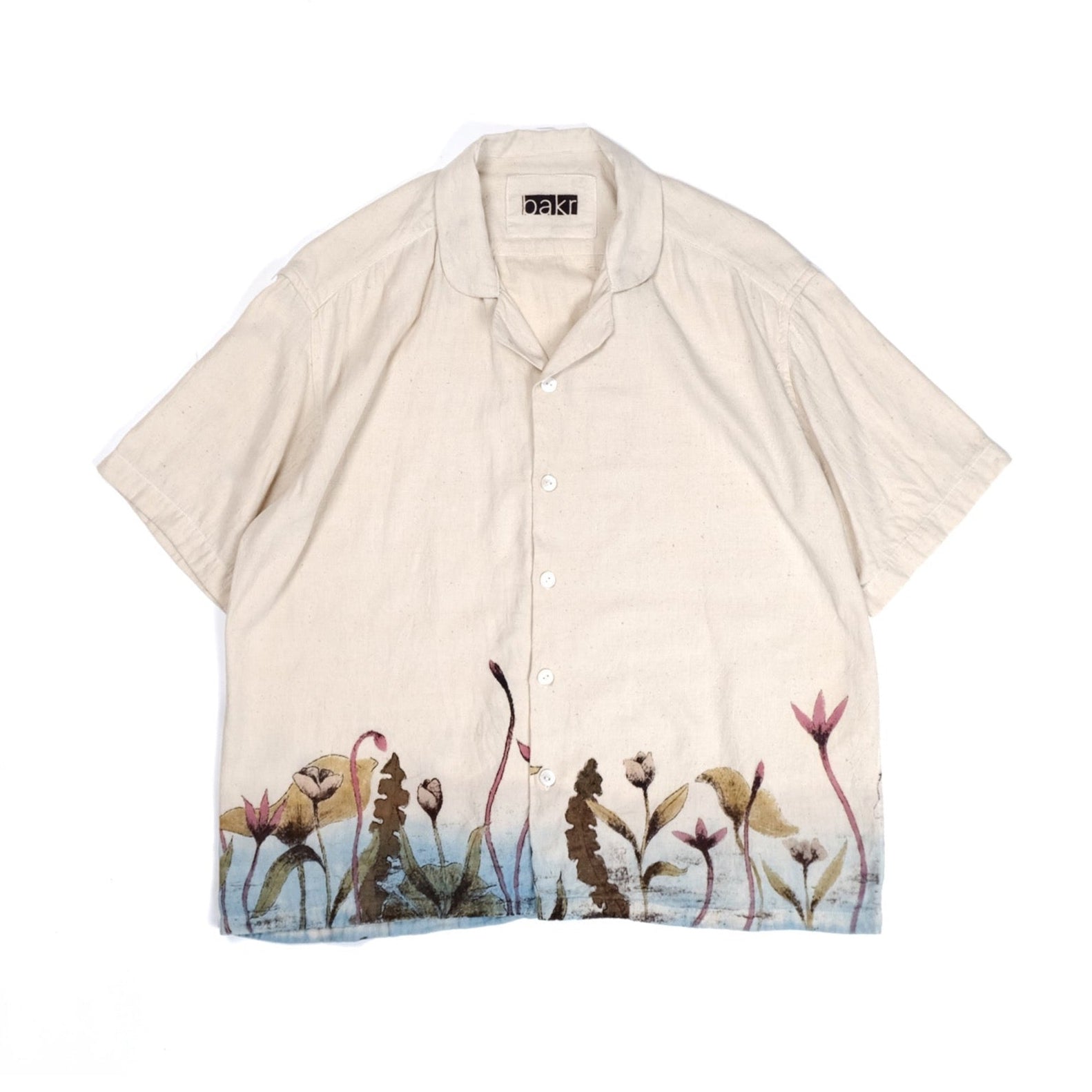 Introducing Bakr’s “Blossom” oversized unisex shirt in “Natural Ecru.” Hand-printed in rust black, derived through the fermentation of iron rust and molasses, it is then hand-painted using 100% natural dyes extracted from nature. Finally, it’s over-dyed in our organic honey indigo vat, resulting in a uniquely crafted garment.