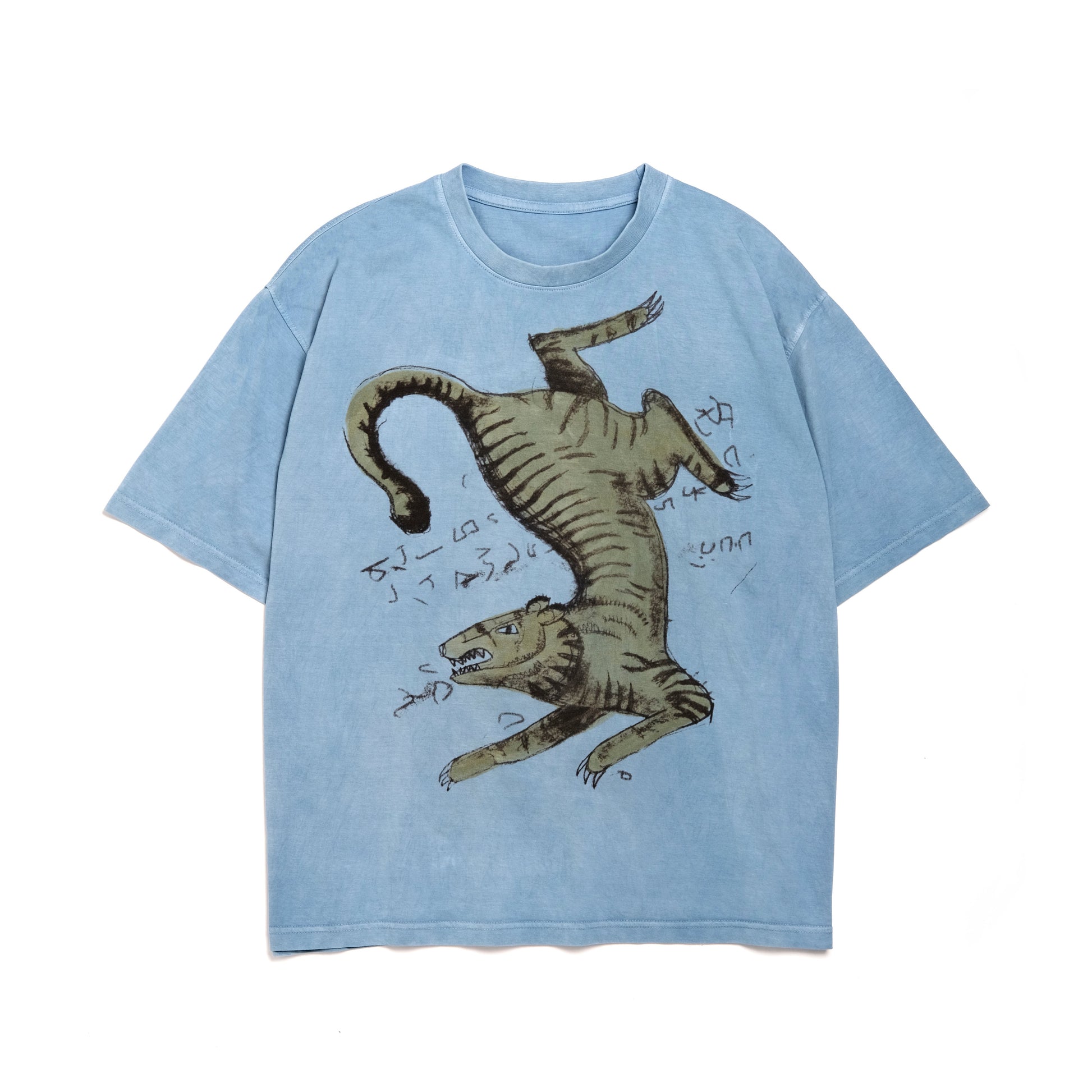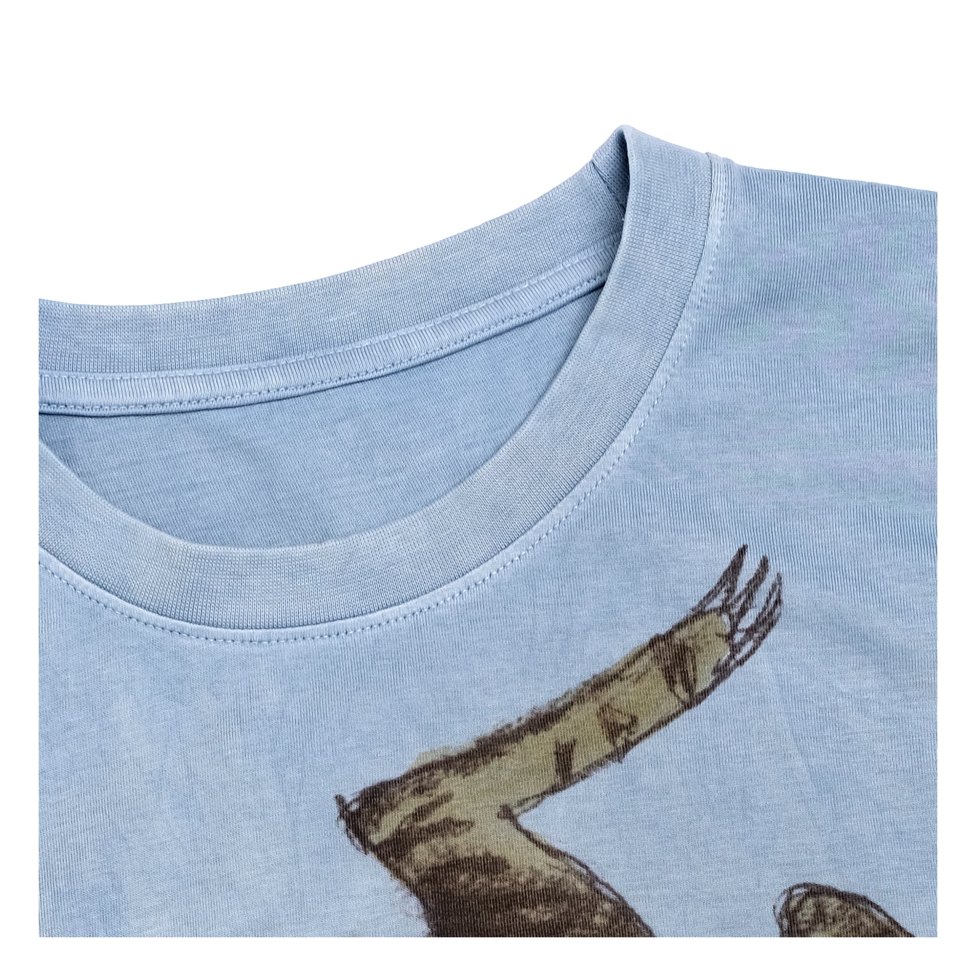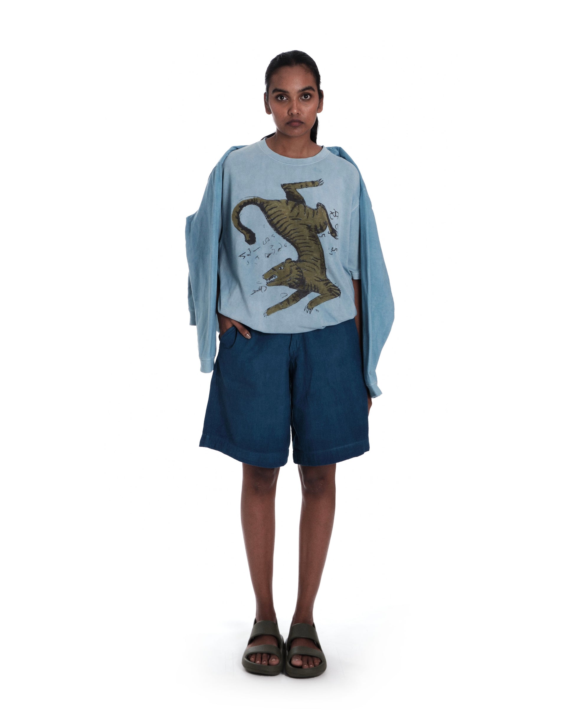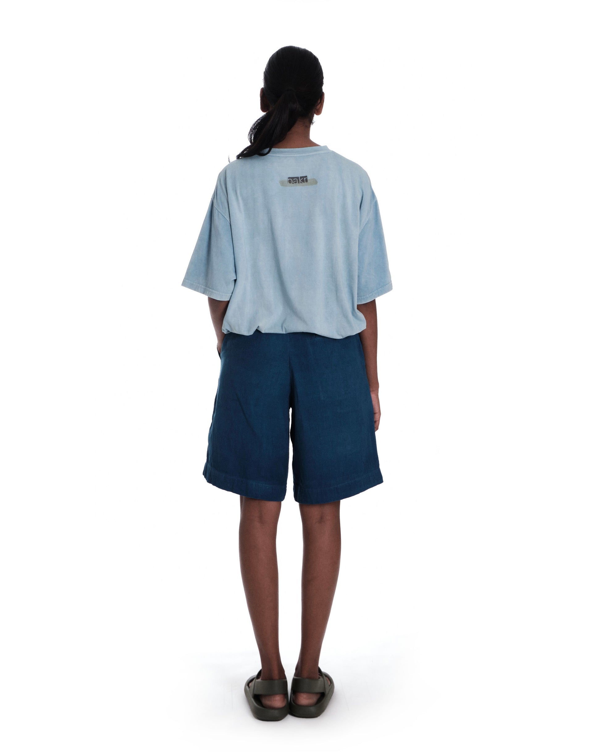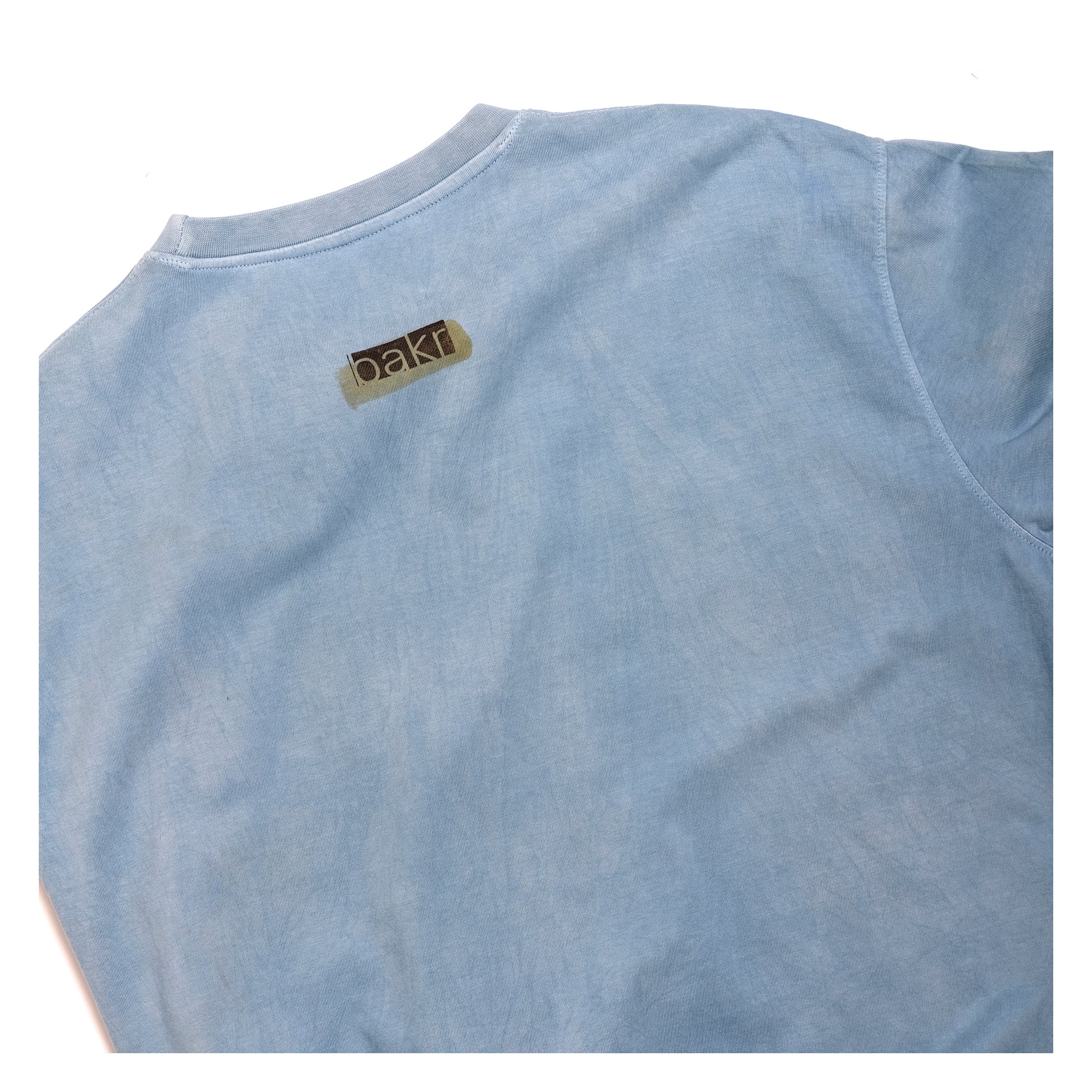 Bakr's oversized t-shirt "imprint" in the shade "indigo ice" is hand-printed in colours extracted through the fermentation of iron rust and molasses, hand painted in a 100% extract of Pomegranate peel and hand-dyed in our studio with our organic honey indigo vat.