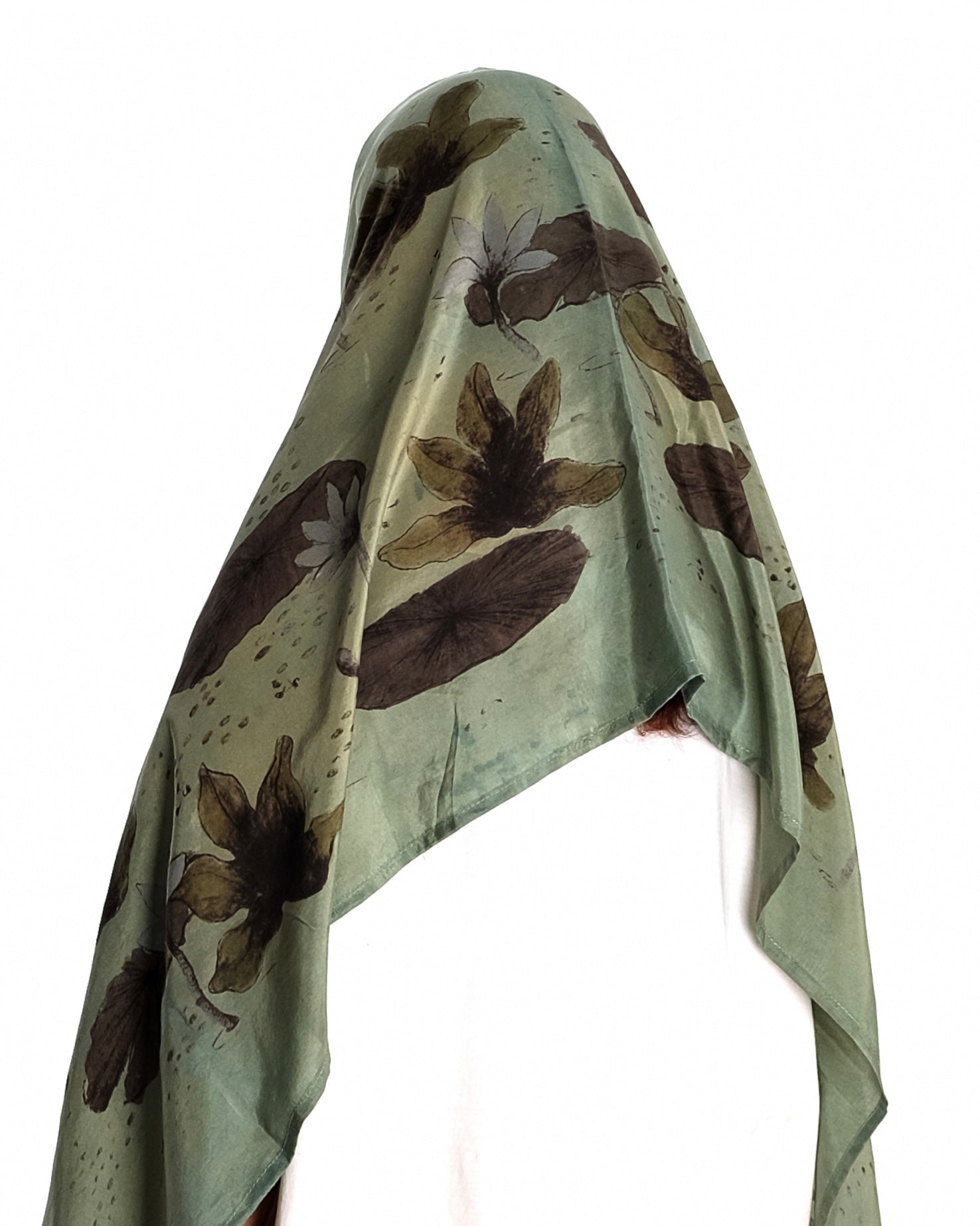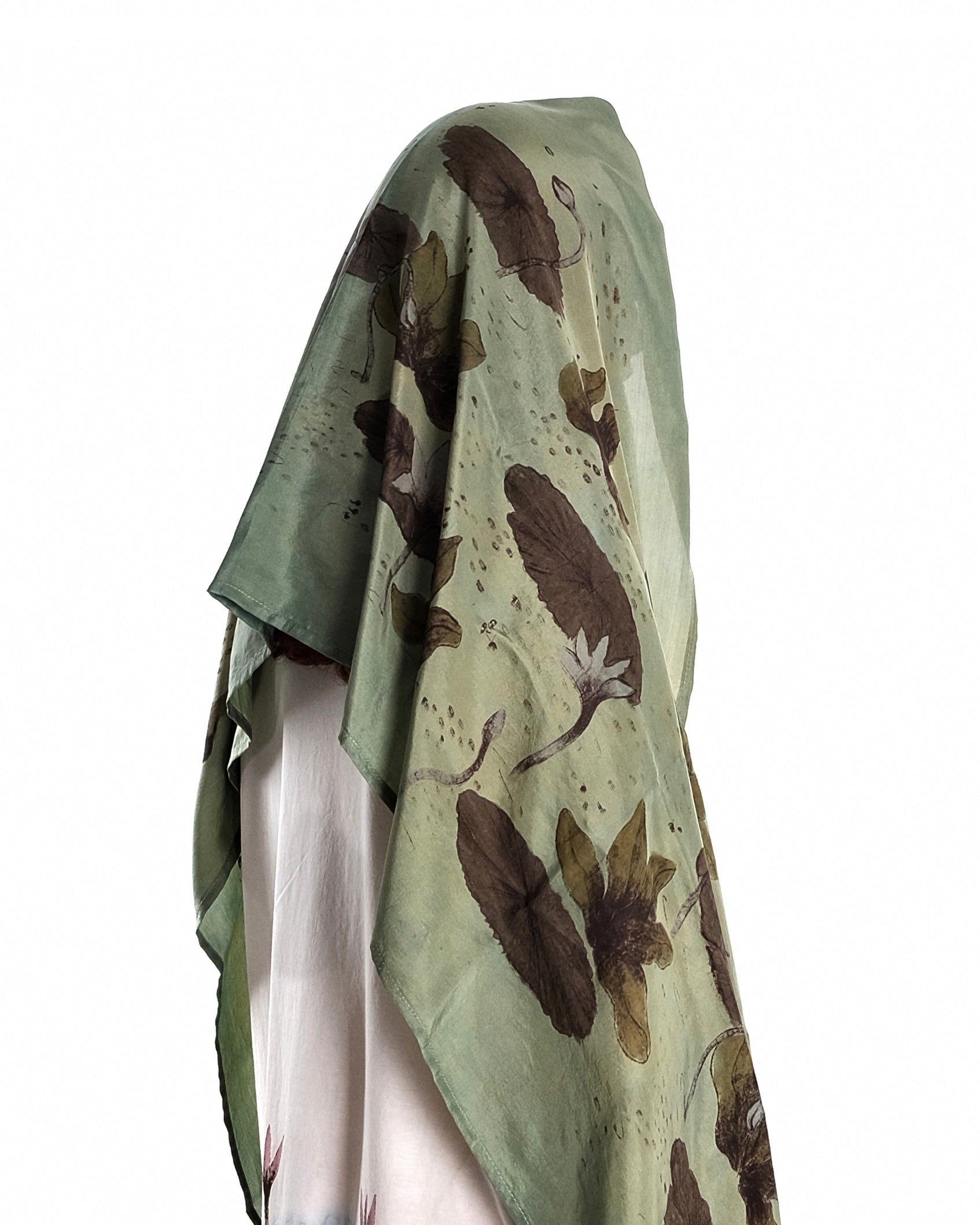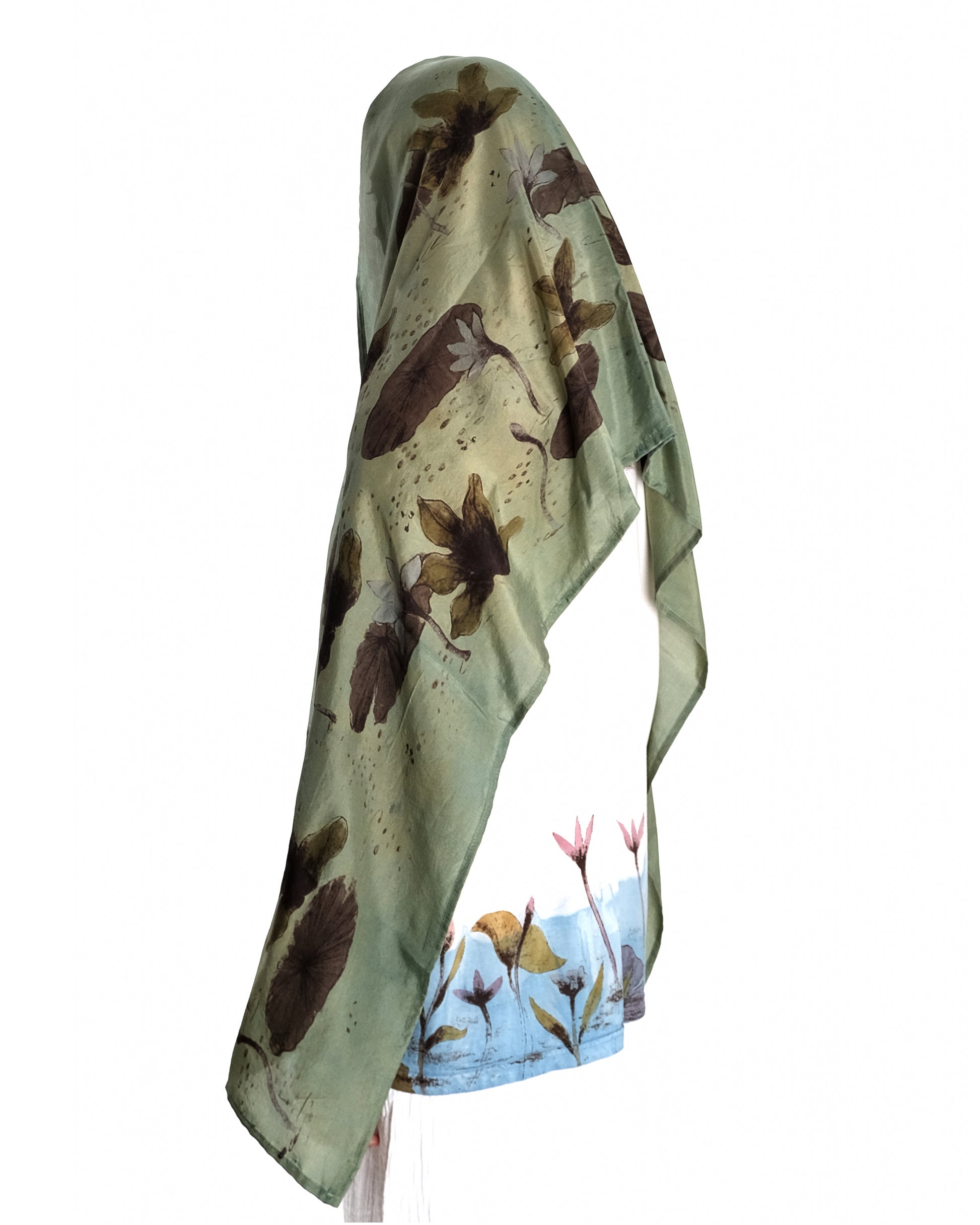 Introducing our exquisite Lily Pond scarves, crafted from fine habotai silk and hand-printed in a unique rust-black shade derived from a natural fermentation of iron rust and molasses. Each piece, measuring 22 inches by 2 meters, is hand-painted with colors 100% extracted from nature and over-dyed in our organic honey indigo vat.