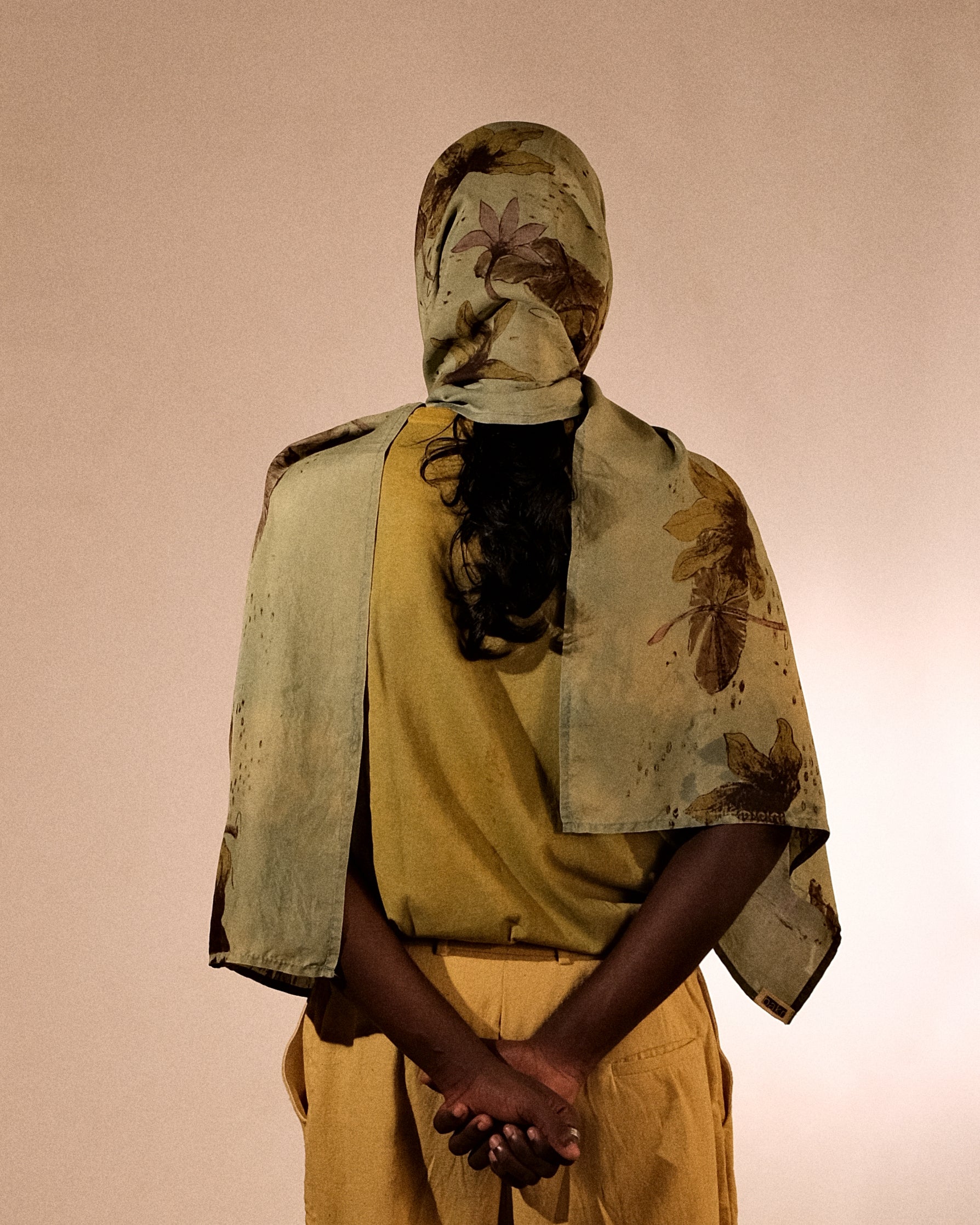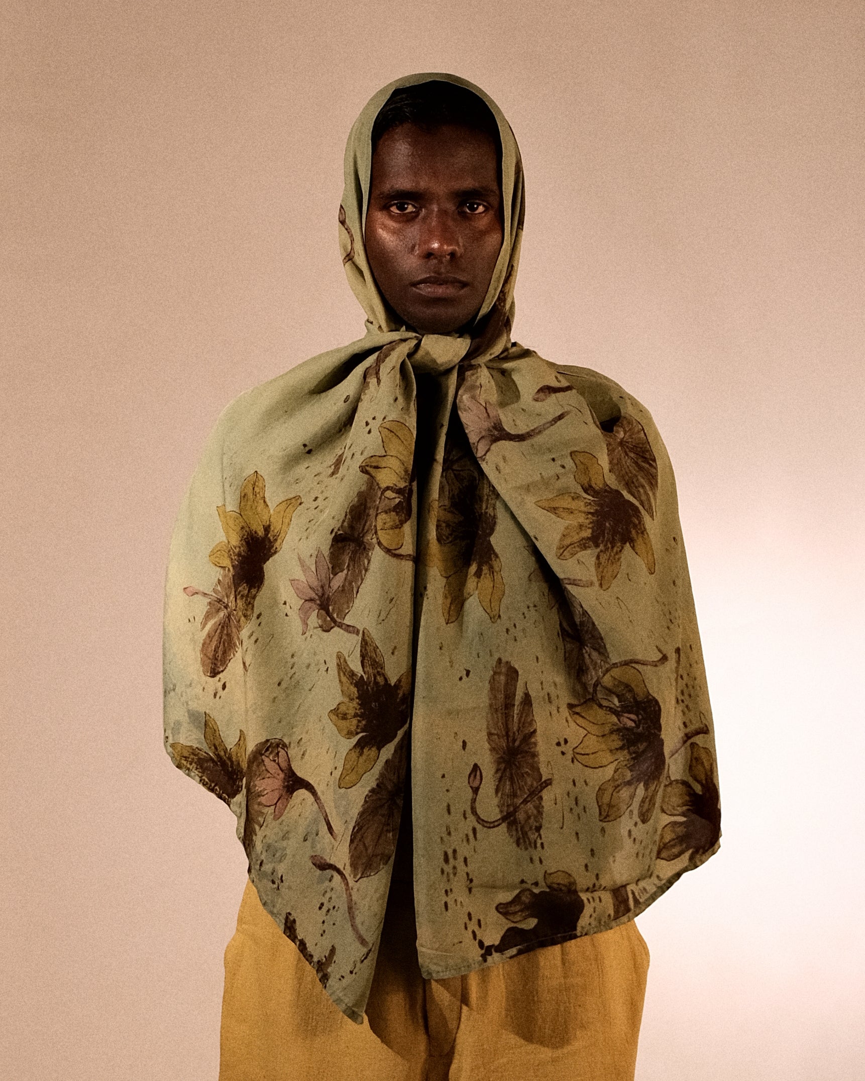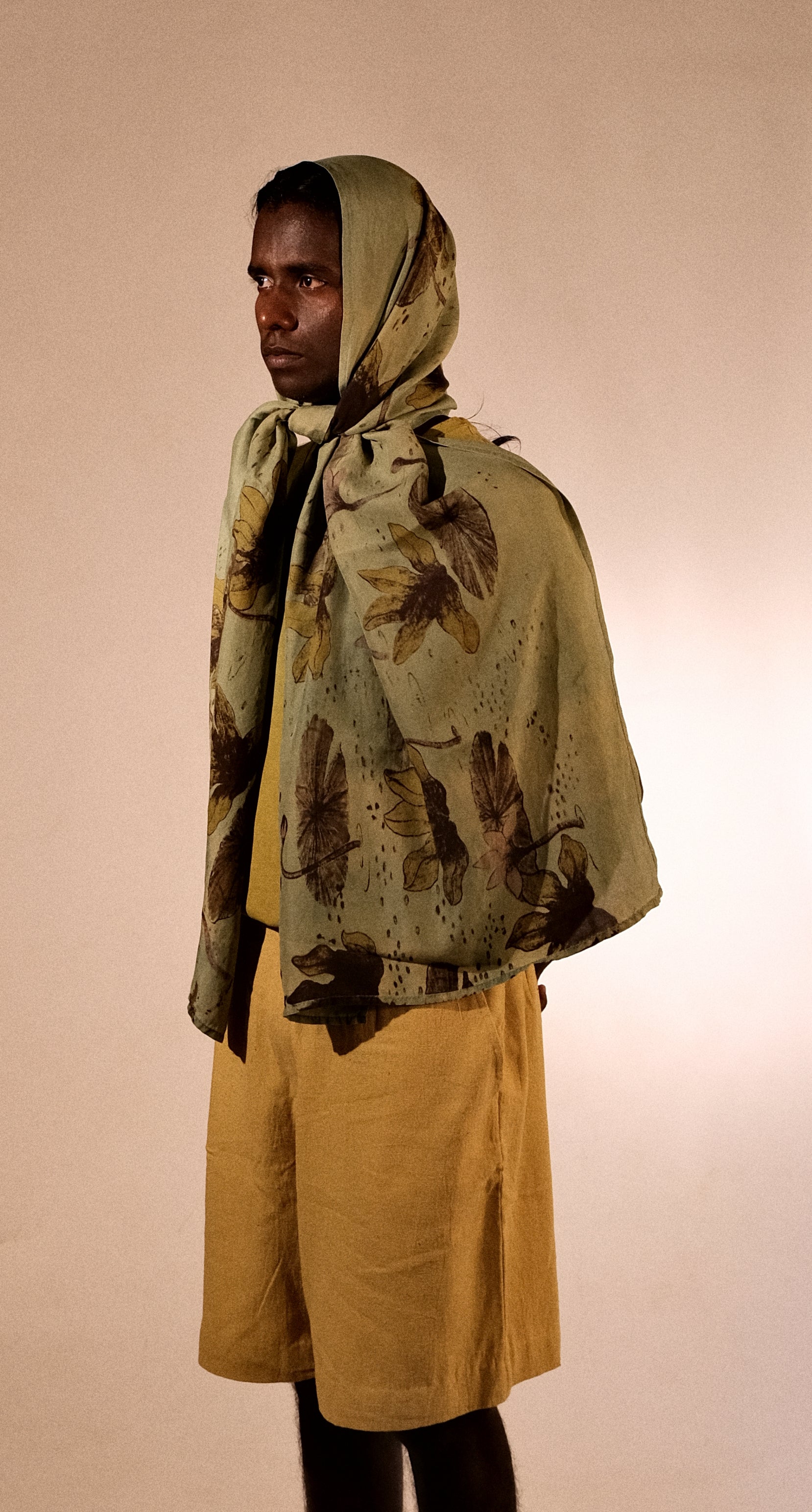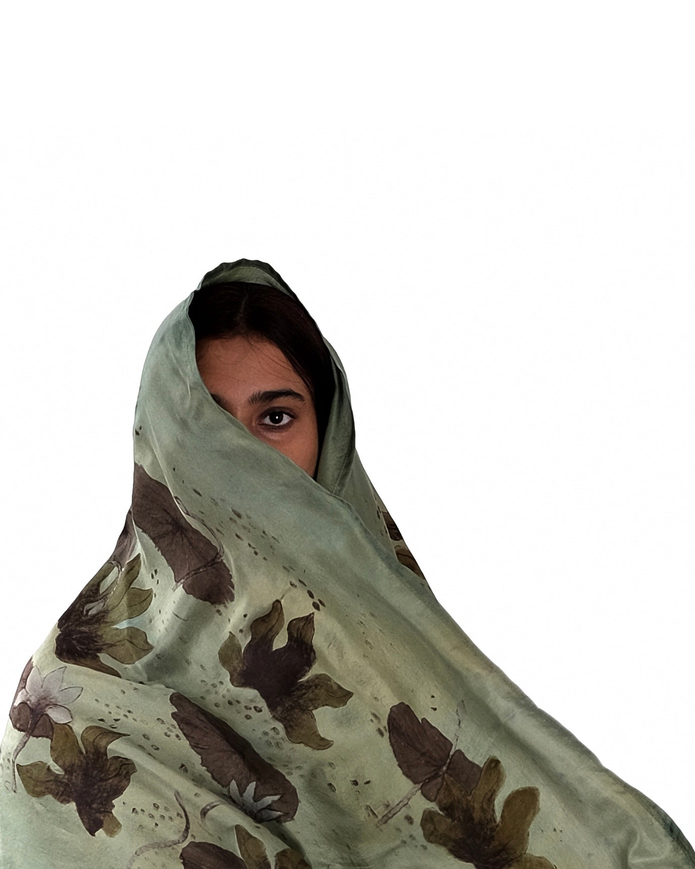 Introducing our exquisite Lily Pond scarves, crafted from fine habotai silk and hand-printed in a unique rust-black shade derived from a natural fermentation of iron rust and molasses. Each piece, measuring 22 inches by 2 meters, is hand-painted with colors 100% extracted from nature and over-dyed in our organic honey indigo vat.