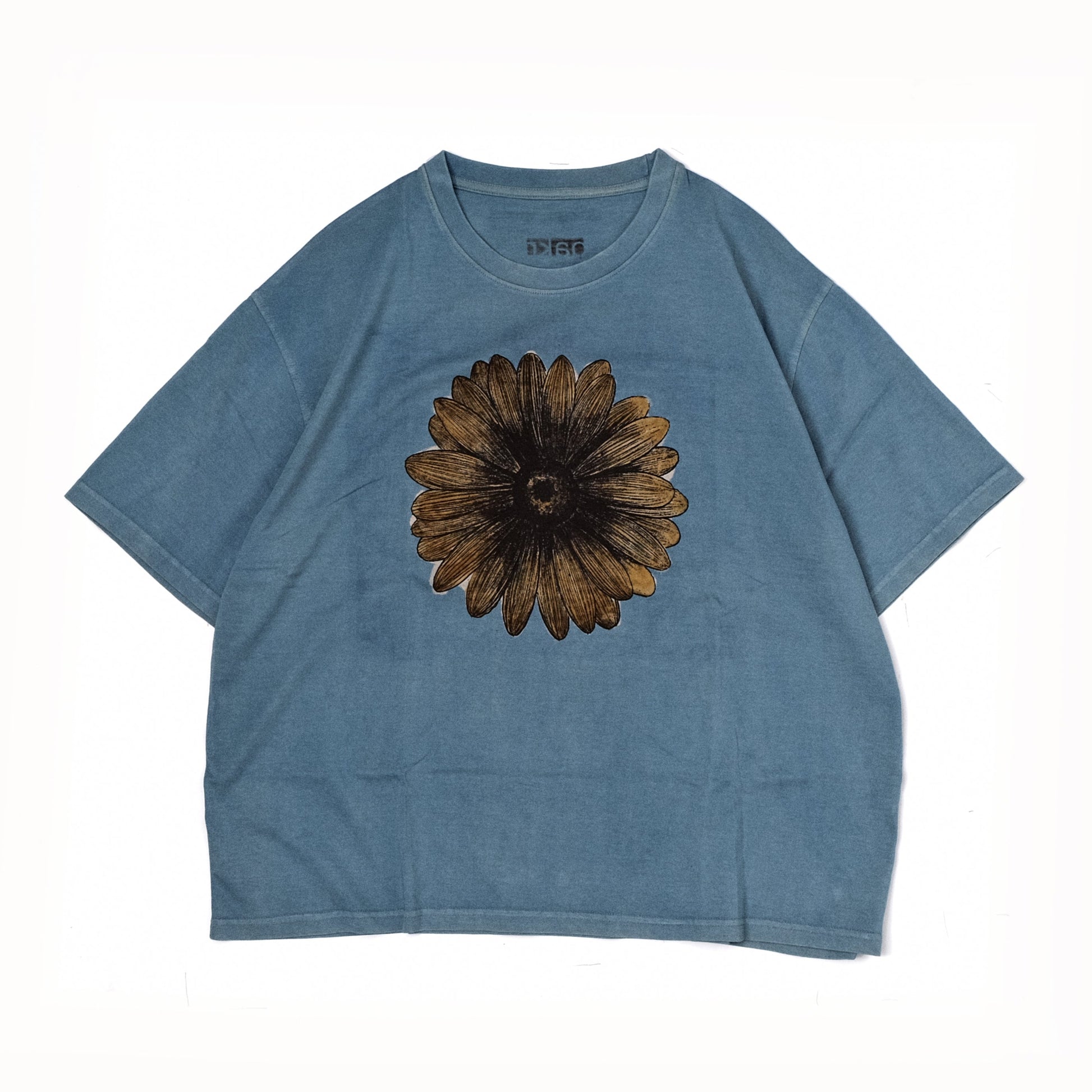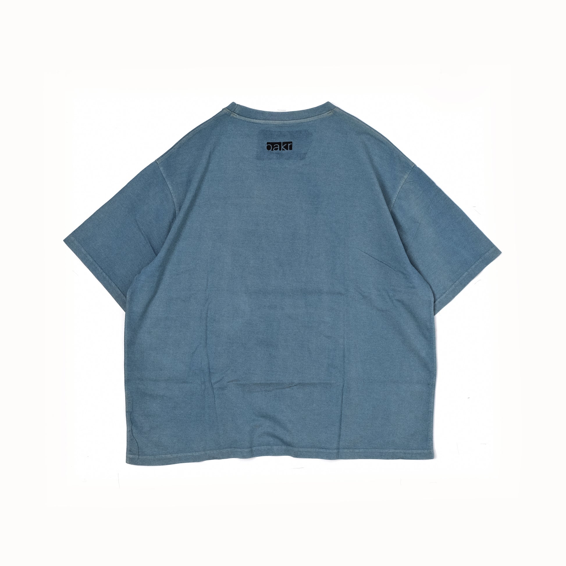 Bakr’s oversized unisex t-shirt, “Sunflower,” in the shade “Indigo ink,” showcases a masterful blend of natural dyes. It features hand-printed designs in rust black, derived from the fermentation of iron rust and molasses, paired with ochre yellow from Myrobalan flowers. The t-shirt is then hand-resisted and overdyed in our 100% organic honey indigo vat, resulting in a rich, layered finish.