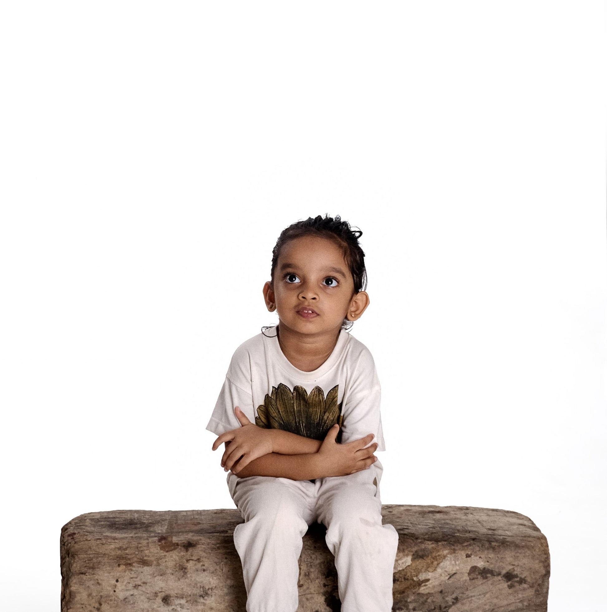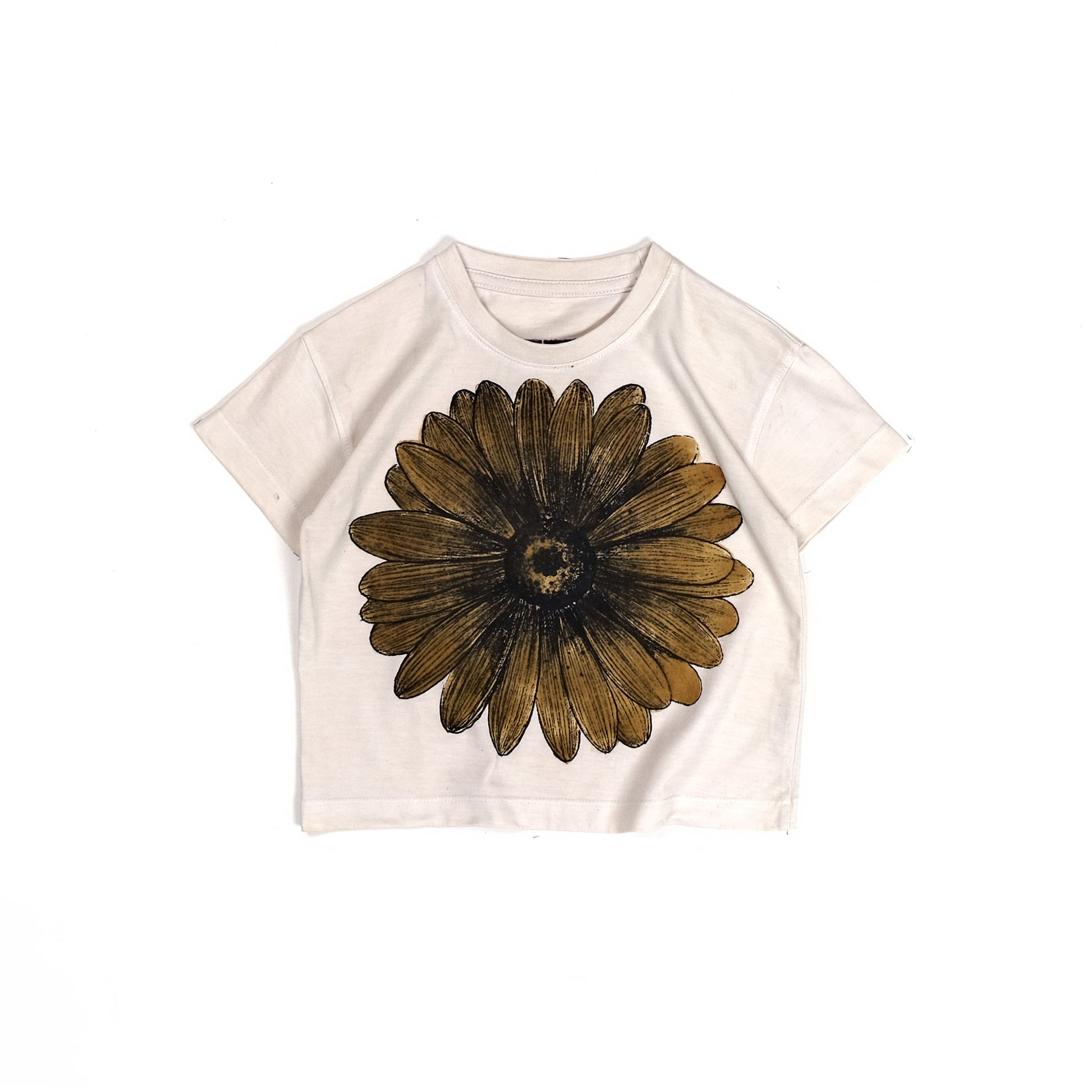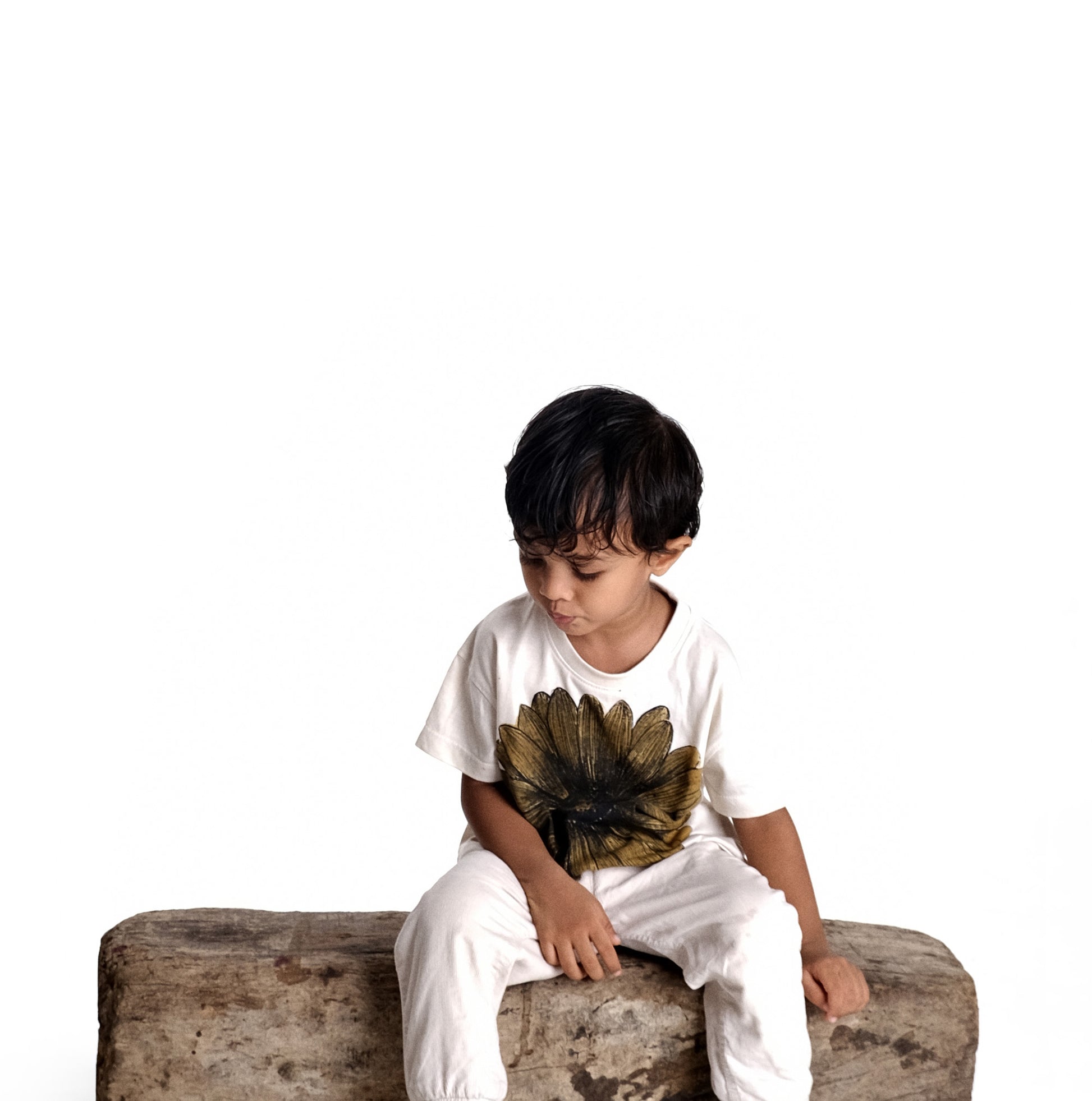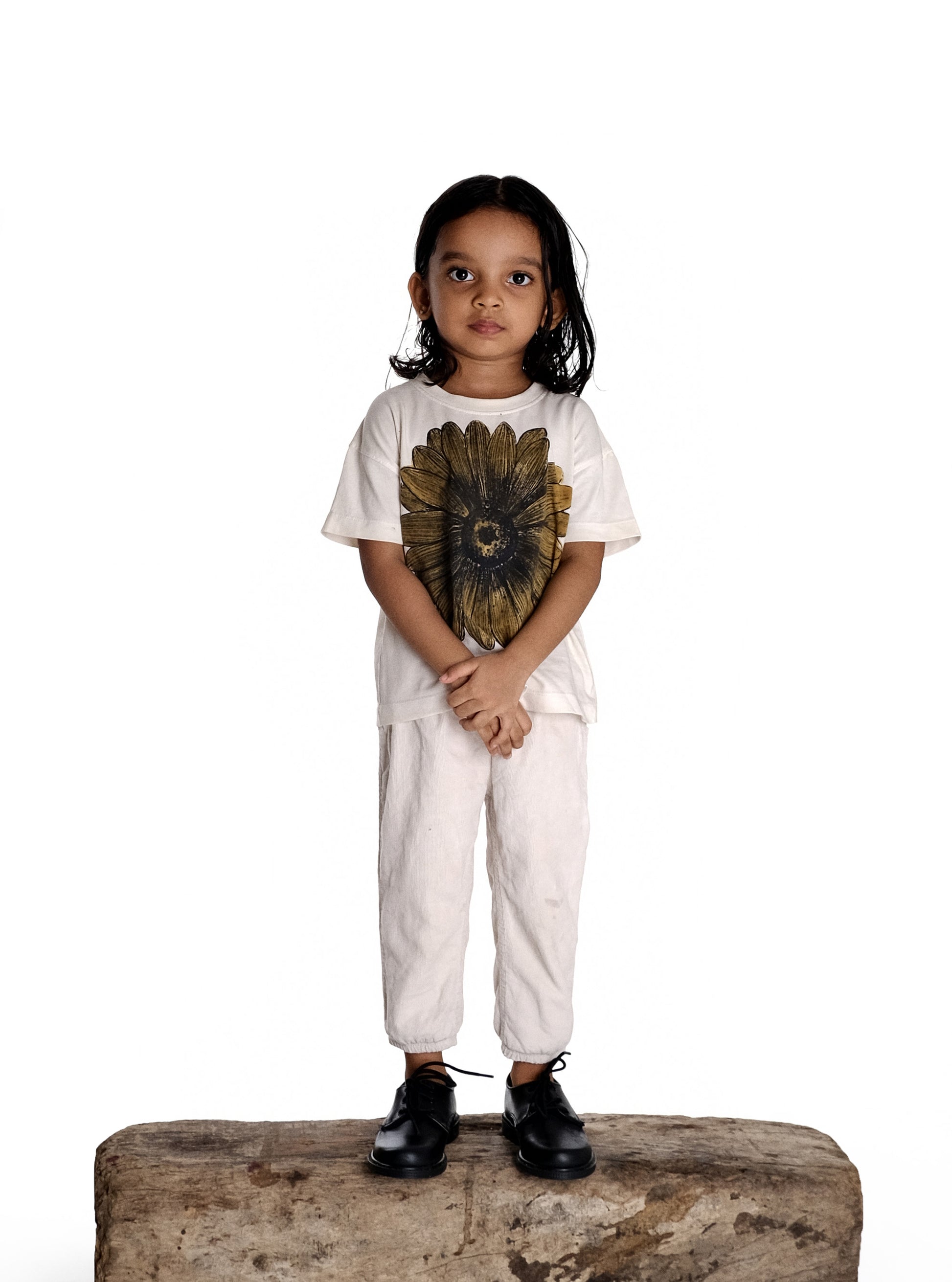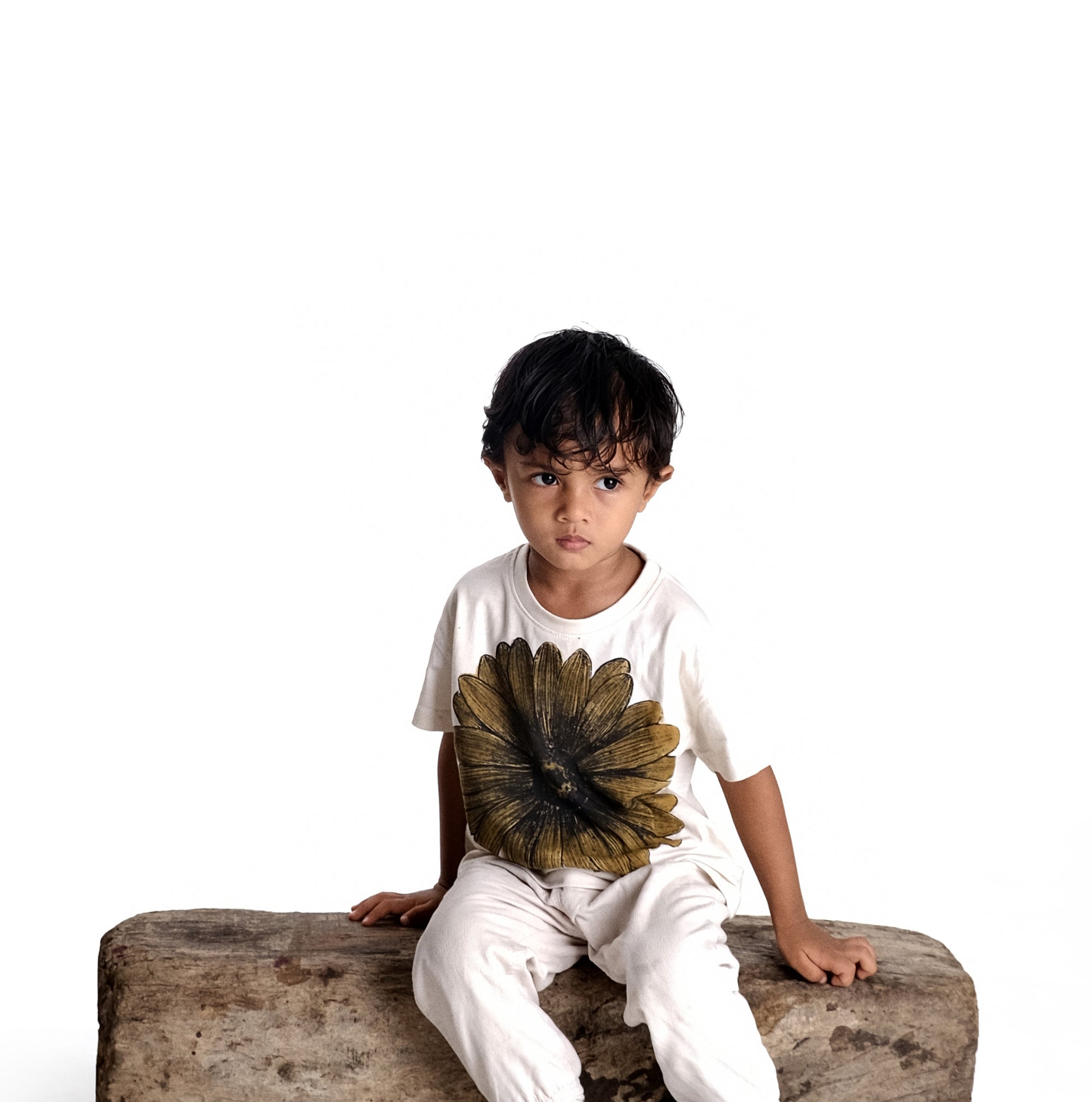 Bakr’s oversized unisex t-shirt, “Sunflower,” in the shade “Natural Ecru,” is hand-printed in rust black, extracted through the fermentation of iron rust and molasses, alongside ochre yellow from Myrobalan flowers.
