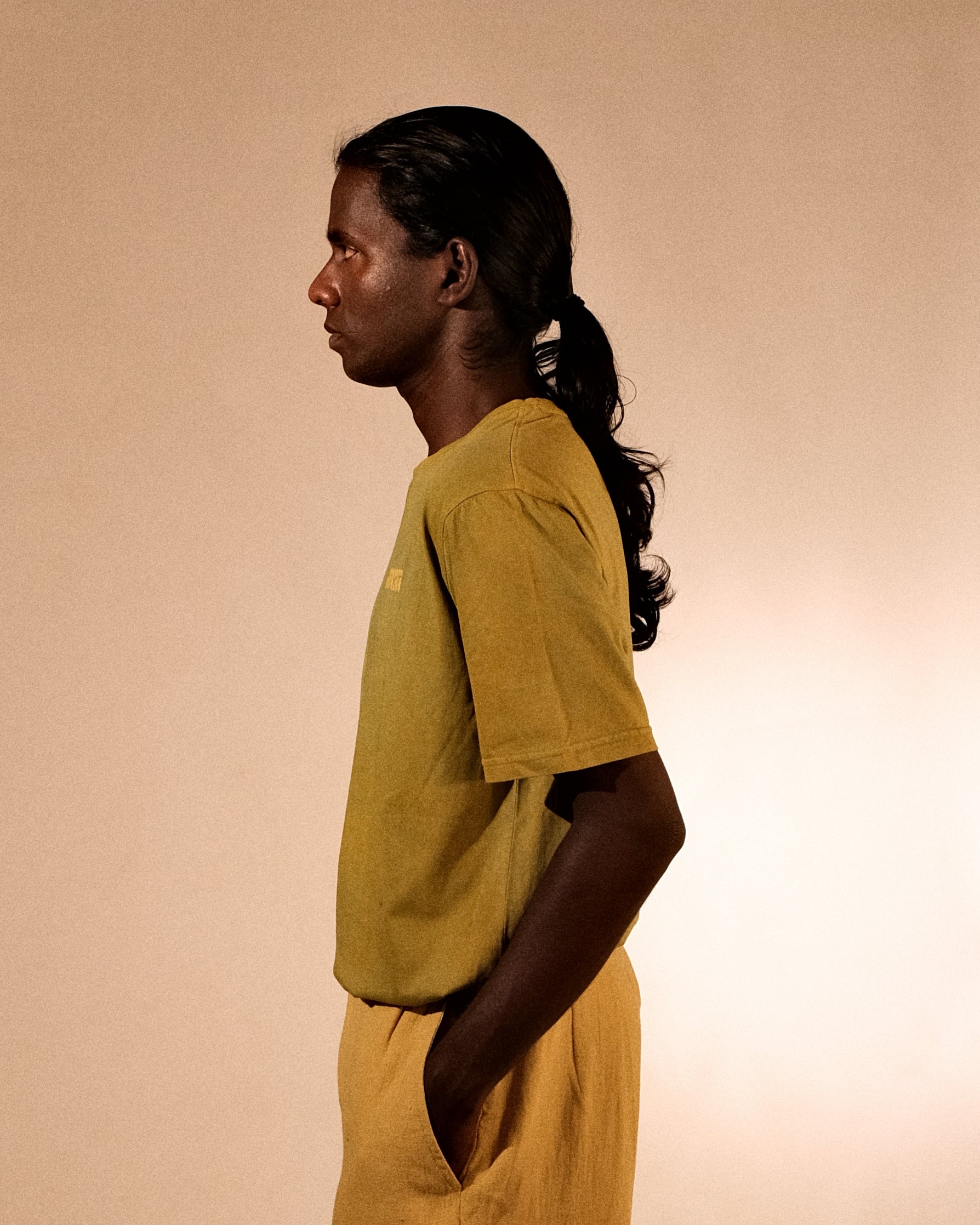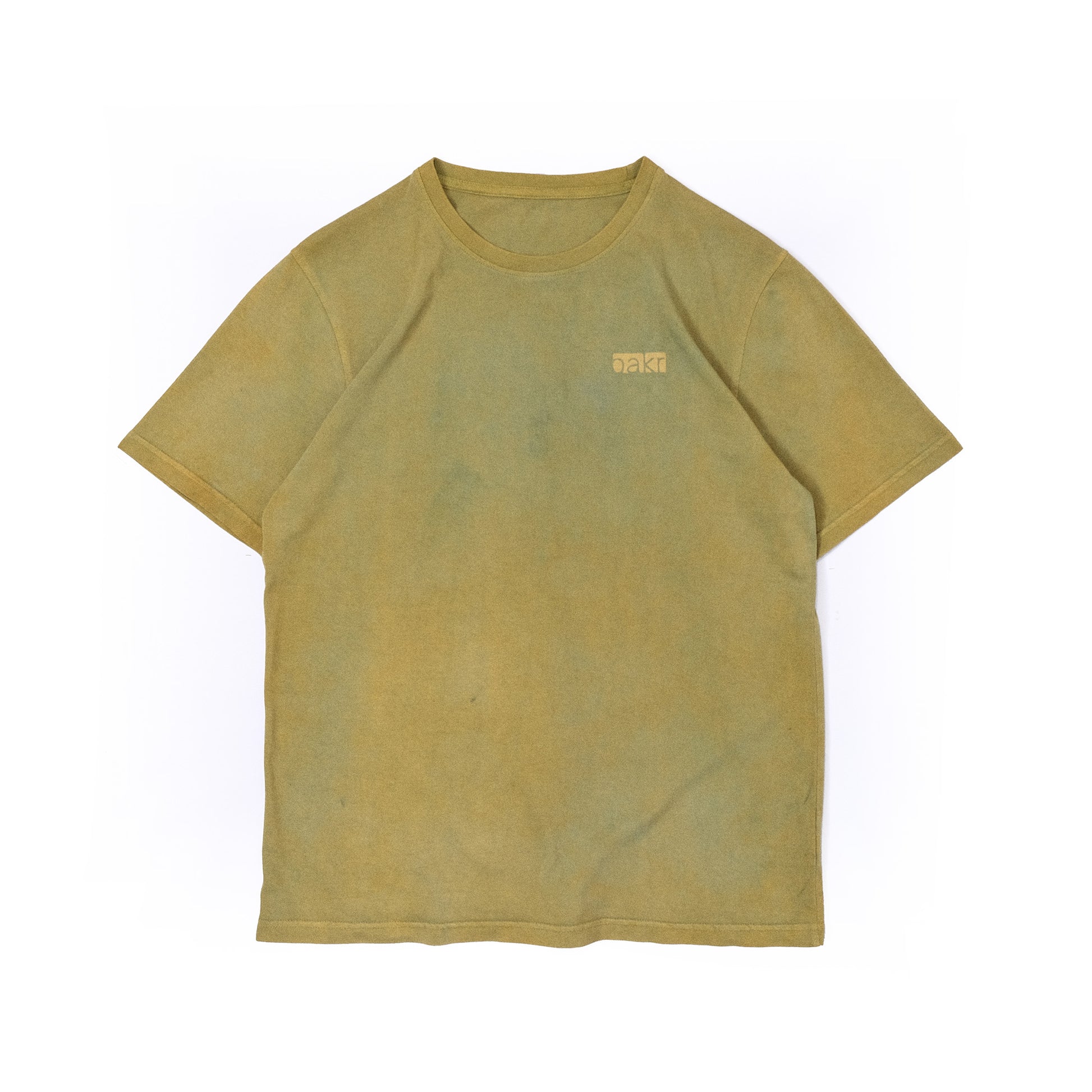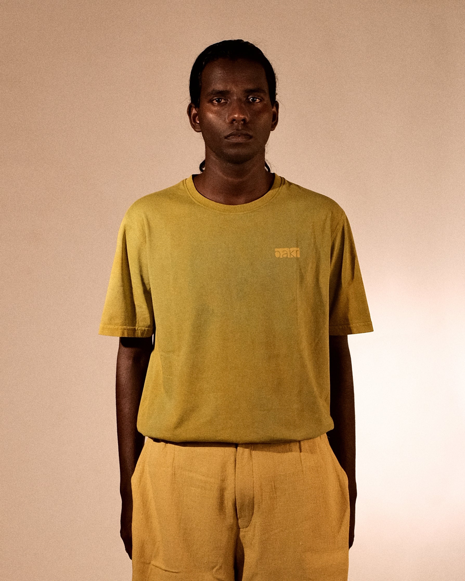Bakr’s basic unisex t-shirt, “yellow anaglyph,” is hand dyed in myrobalan yellow and over dyed in out 100% organic honey indigo vat and takes approximately 4 days to make.
