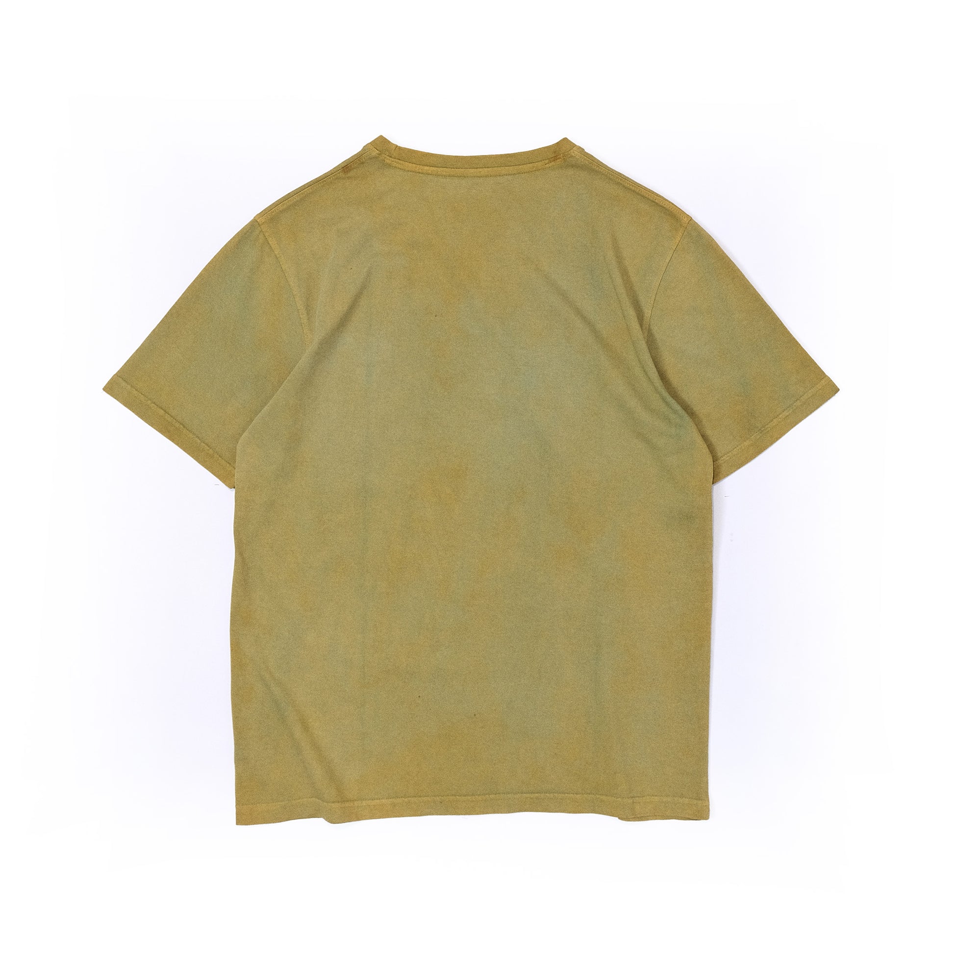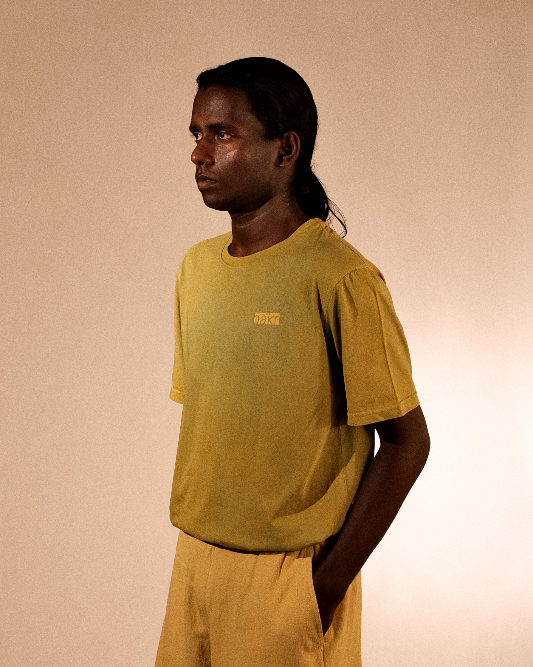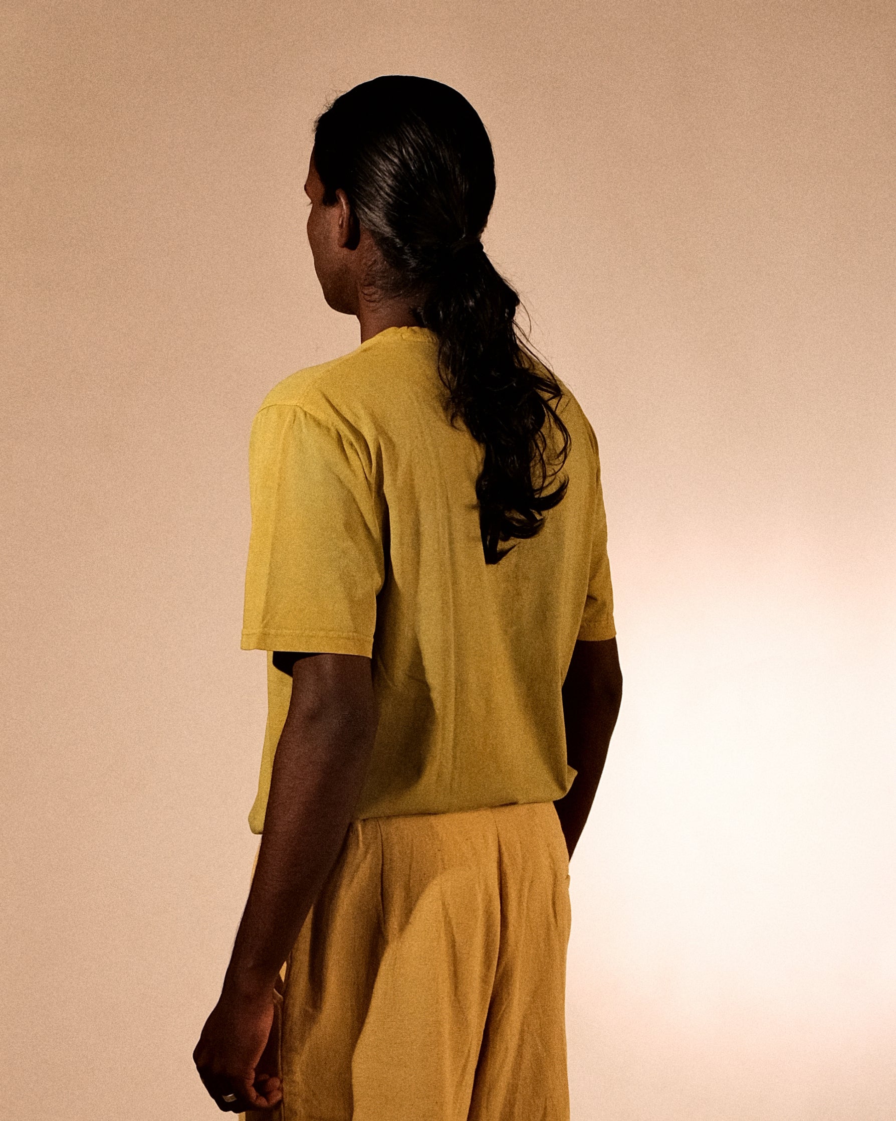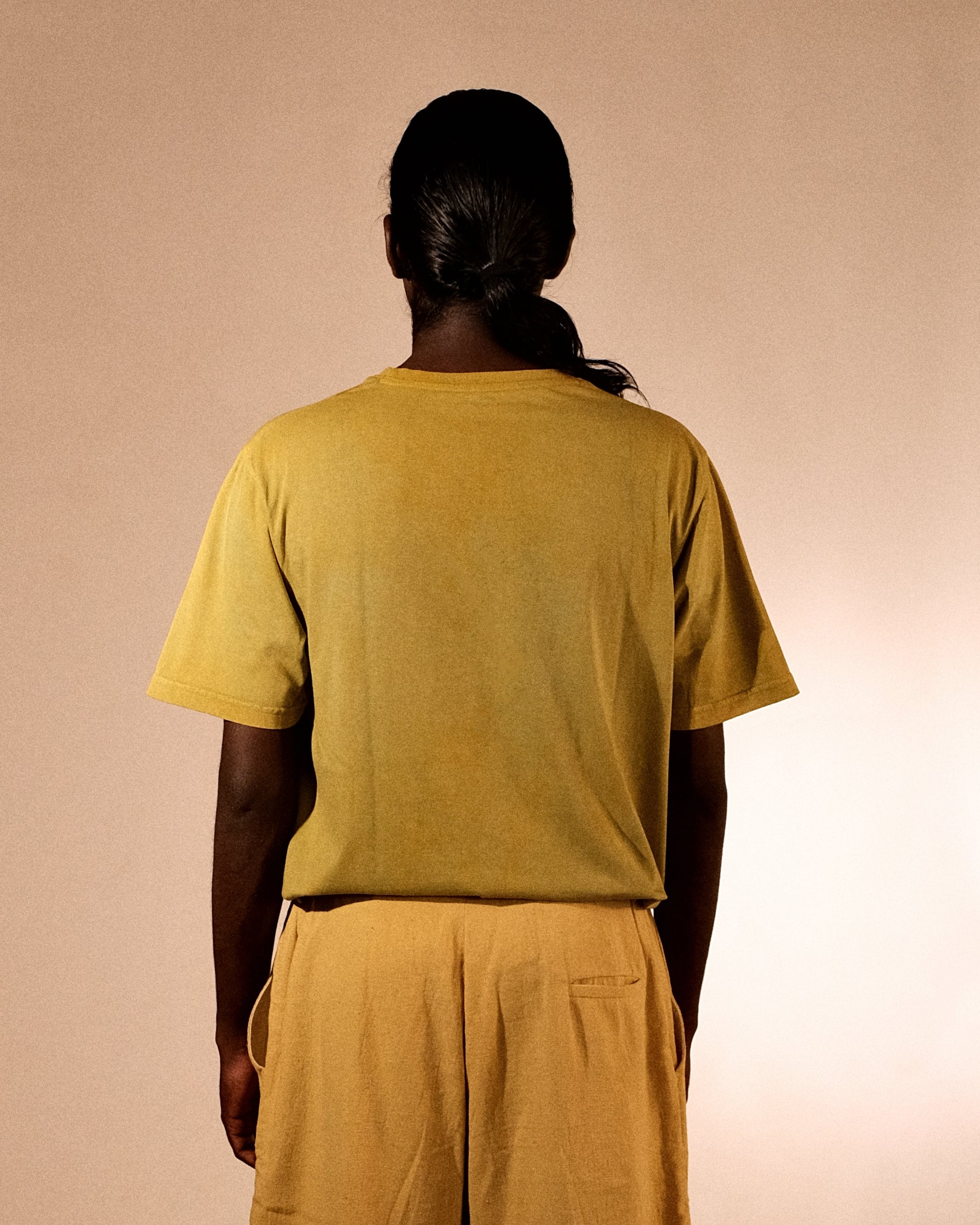 Bakr’s basic unisex t-shirt, “yellow anaglyph,” is hand dyed in myrobalan yellow and over dyed in out 100% organic honey indigo vat and takes approximately 4 days to make.